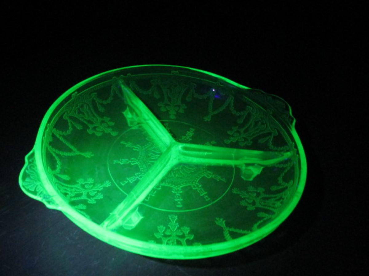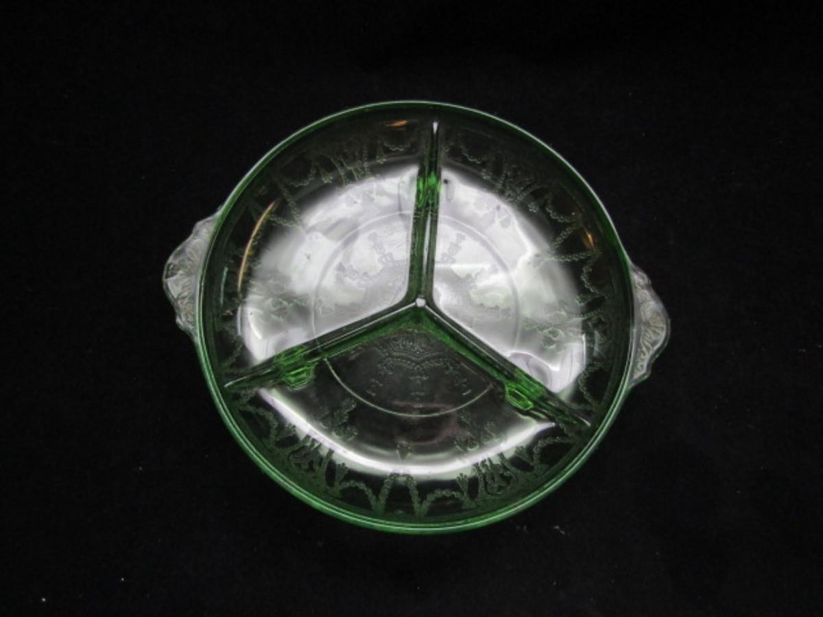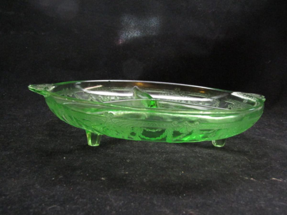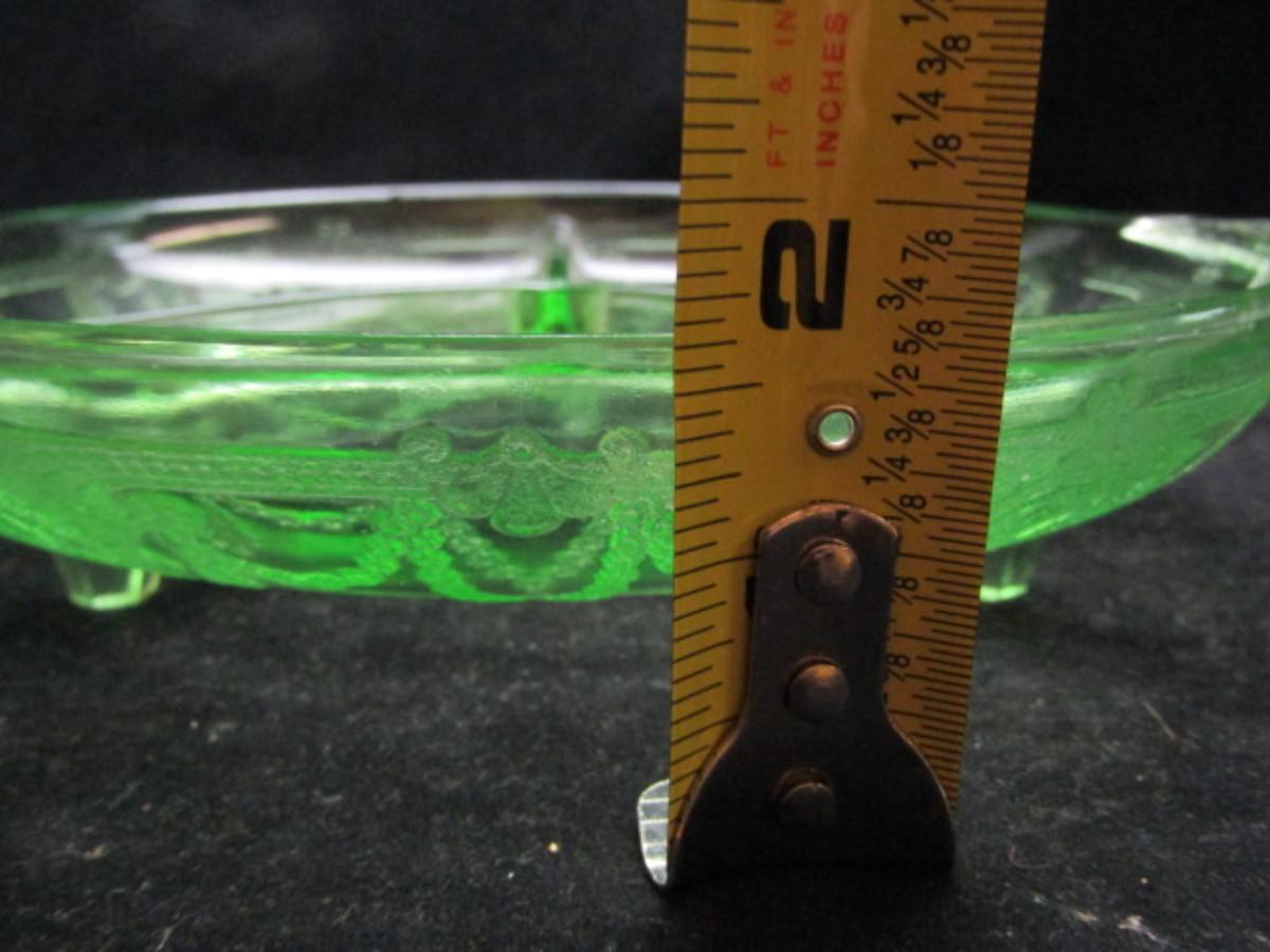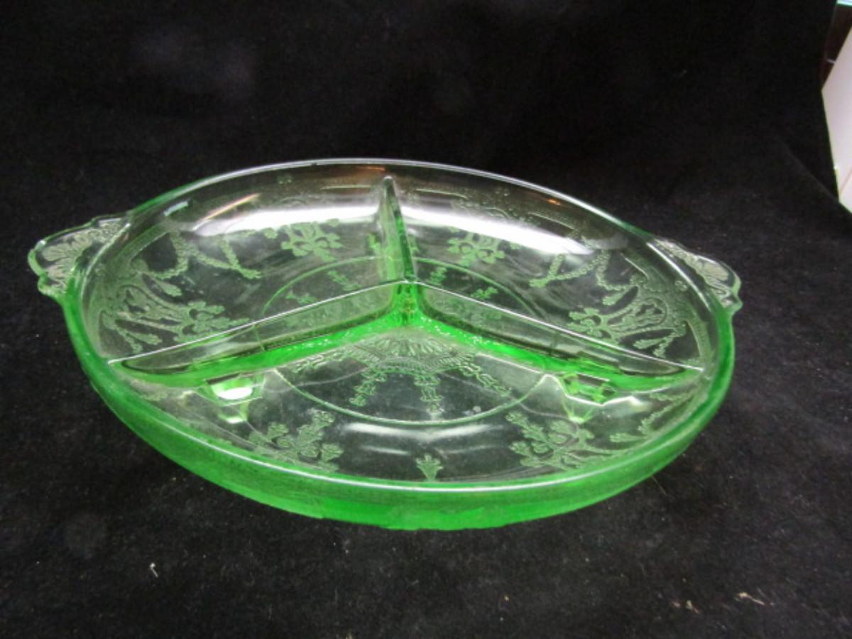 Vintage Footed Uranium Glass Divided Dish with Etched Design- Approx 8" in Diameter (#293). Please see all pictures- small chip on handle.
