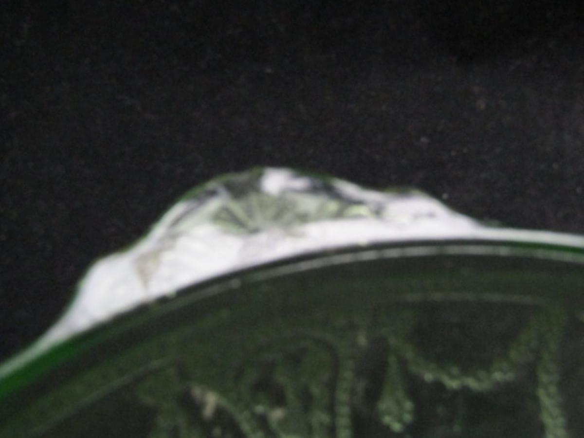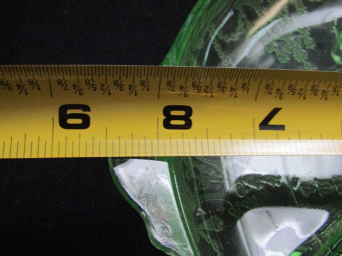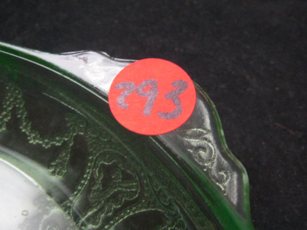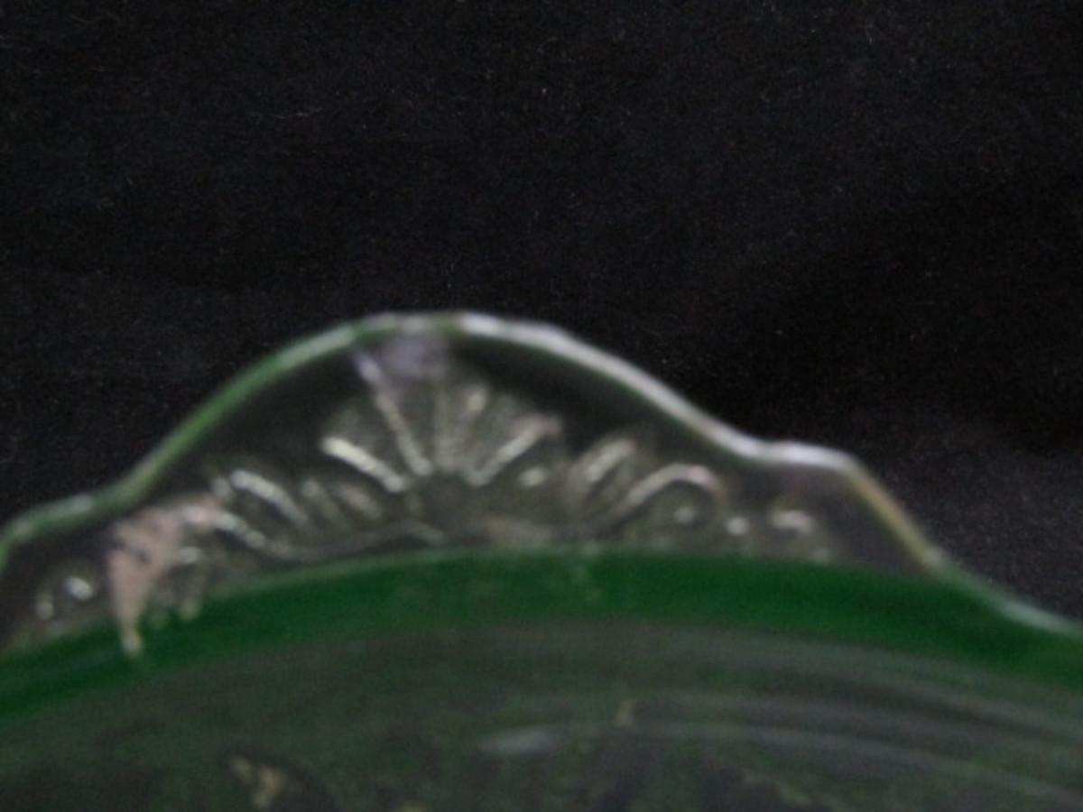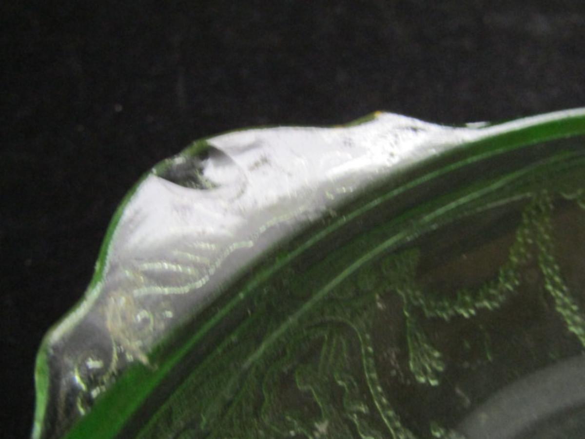 Vintage Footed Uranium Glass Divided Dish with Etched Design- Approx 8" in Diameter (#293). Please see all pictures- small chip on handle.