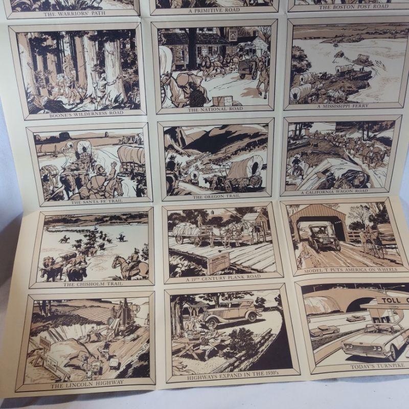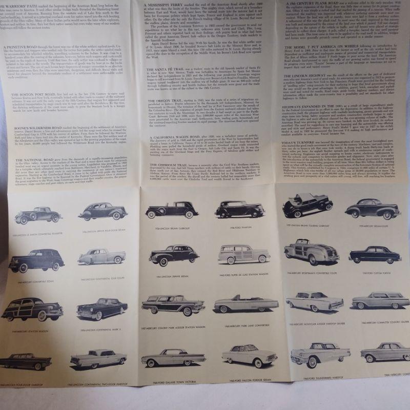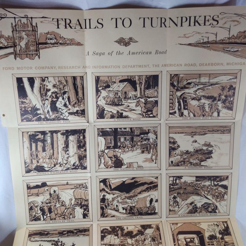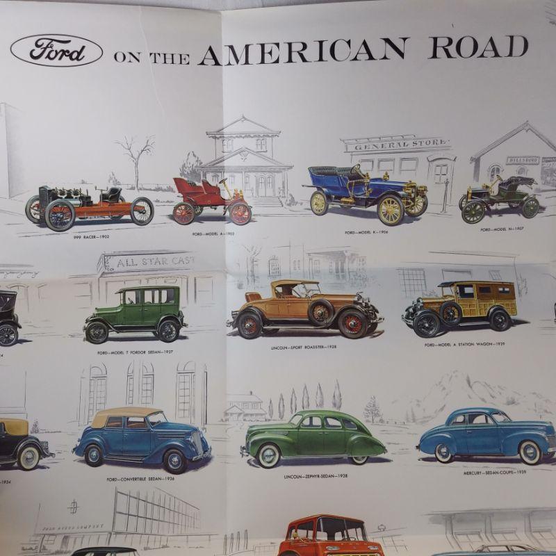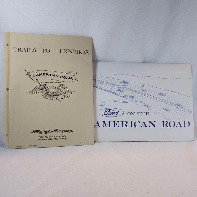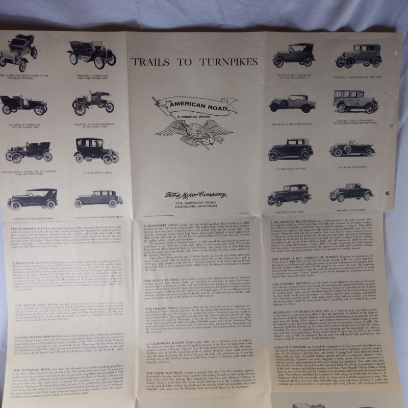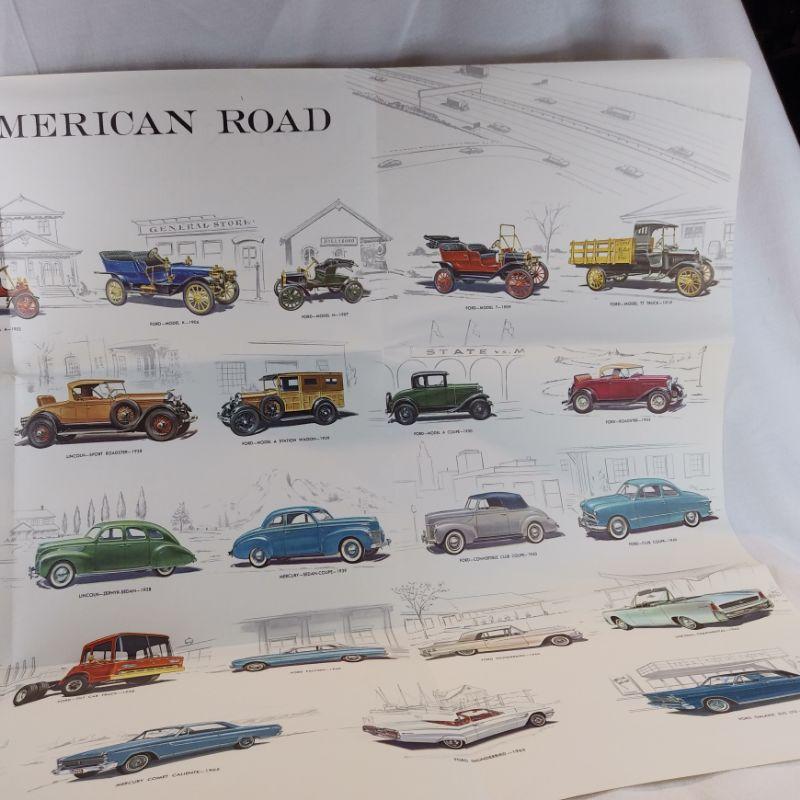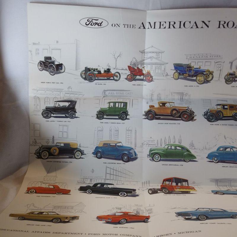 Two very nice Ford Posters. "Trails to Turnpikes - Ford, The American Road" is two-sided. It is 24-inches wide X 33-inches tall, printed in 1960. Ford on the American Road is Pictures of Historical Fords - one sided. It is 25-inches wide X 33-inches tall, printed in 1962. Both are in very good condition consistent with age. Quite unique - where you gonna find another!