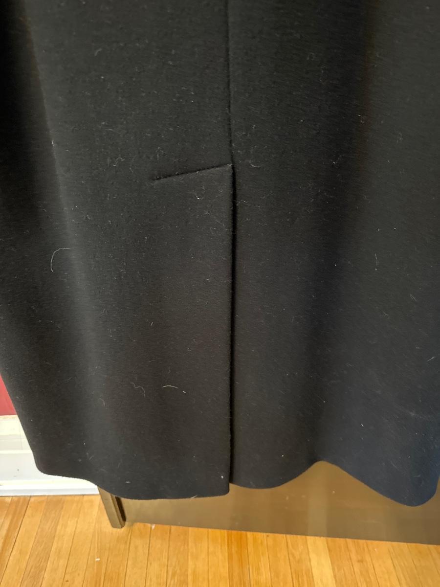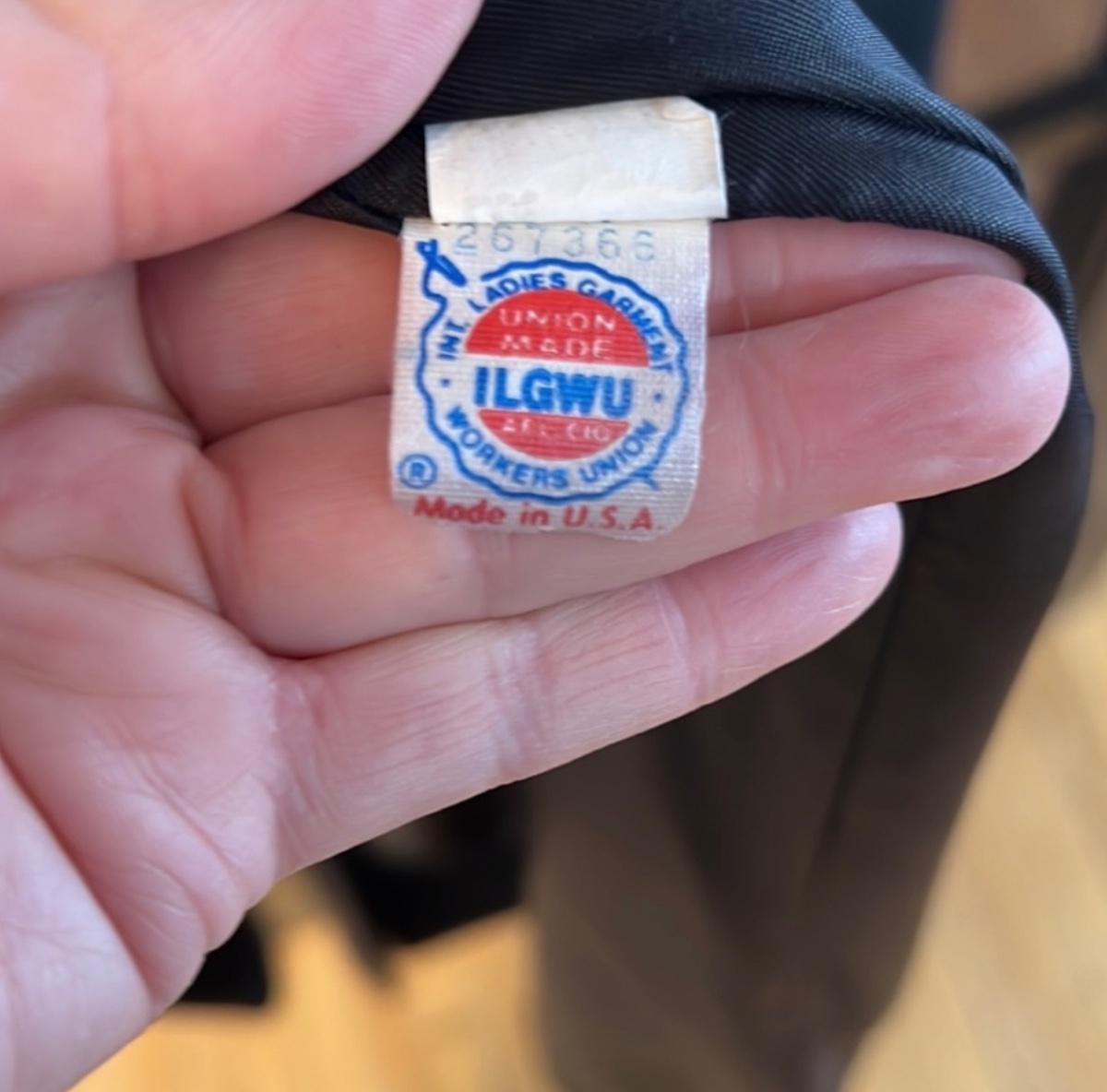 Made in USA IGLWU label. Coat has low neckline, rounded padded shoulder, generous sleeve, and 2 deep front pockets. Double button on the exterior with a single button on the inside to keep it closed, poly or acetate lining with no rips or fraying present. Dry clean tag. Extra buttons still present.