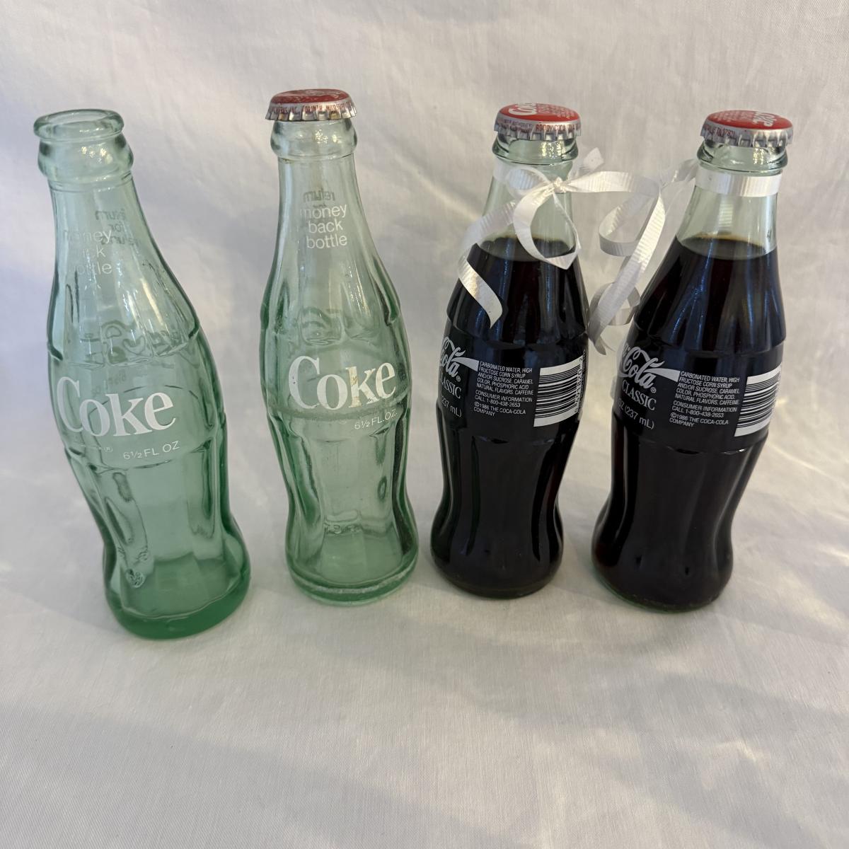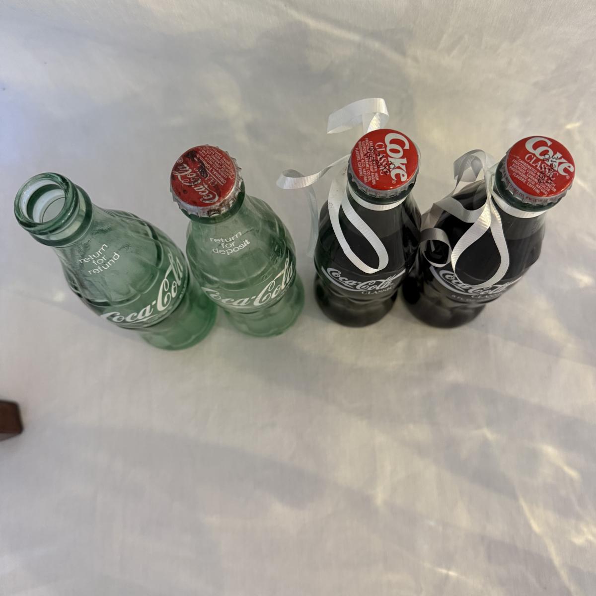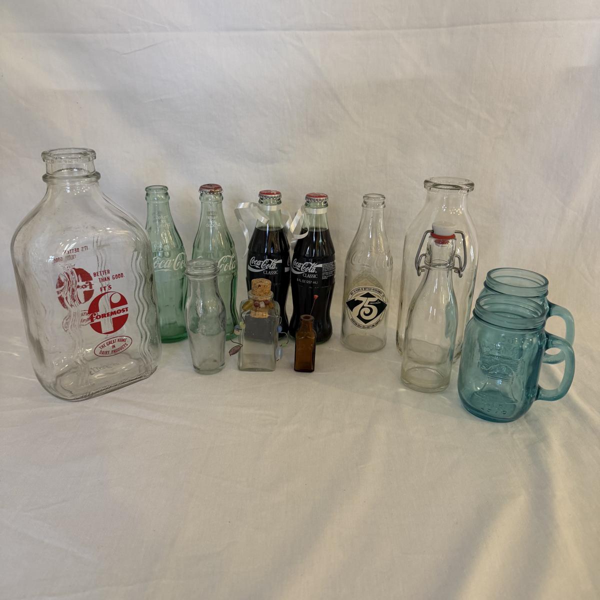 Thirteen glass bottles and mugs including two Liberty Mugs from Jack in the Box, five glass Coke bottles (two unopened) and a Foremost Dairy quart bottle. Five more unmarked bottles round out the lot. See images. Shipping available.