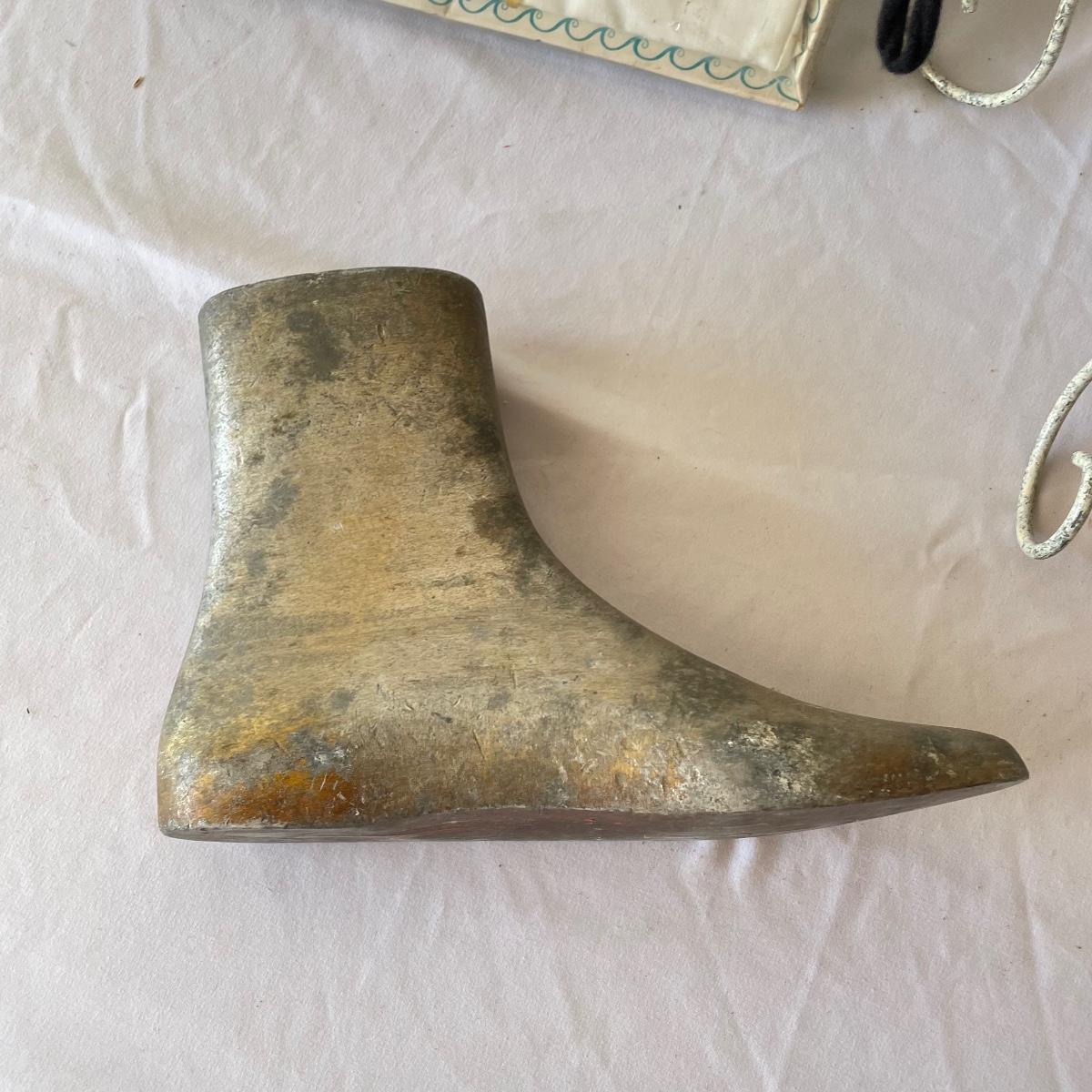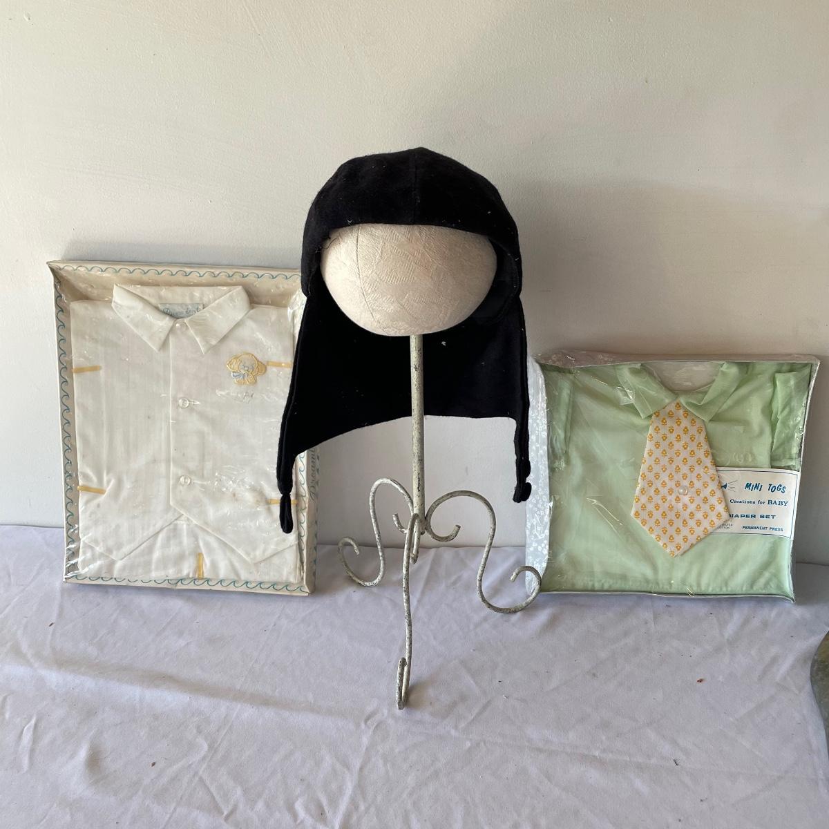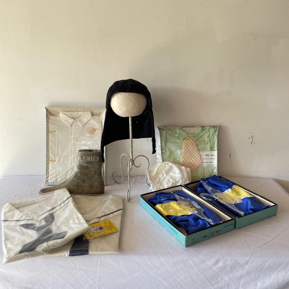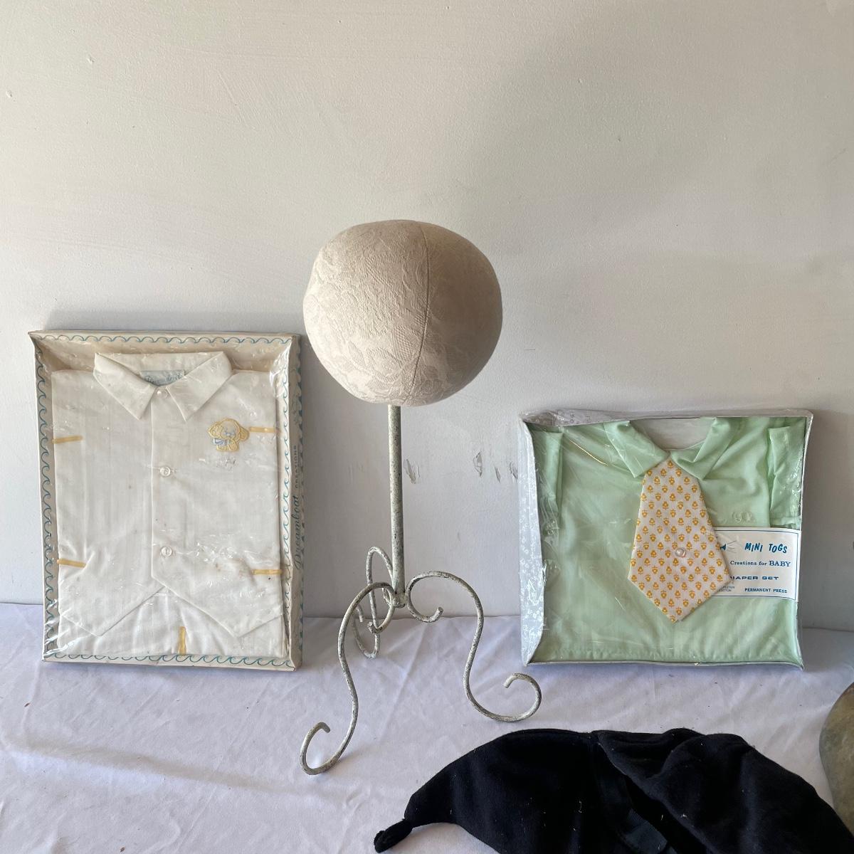 Small head form with metal stand and upholstery head measuring 16” tall. Lot also has a neat variety of unused vintage clothing like Vassarette underwear and children clothing. Lot also features a 3-425 marked metal shoe form. See images. Shipping available.