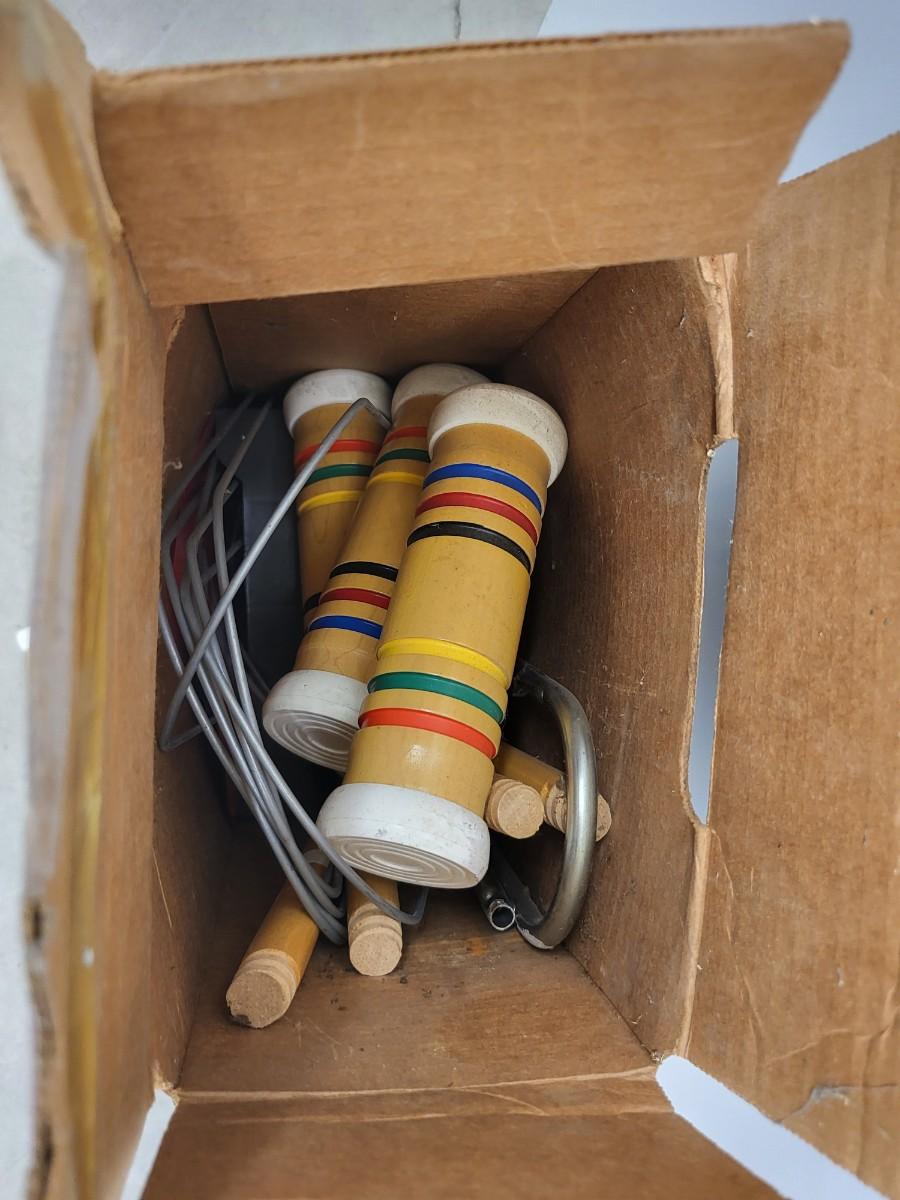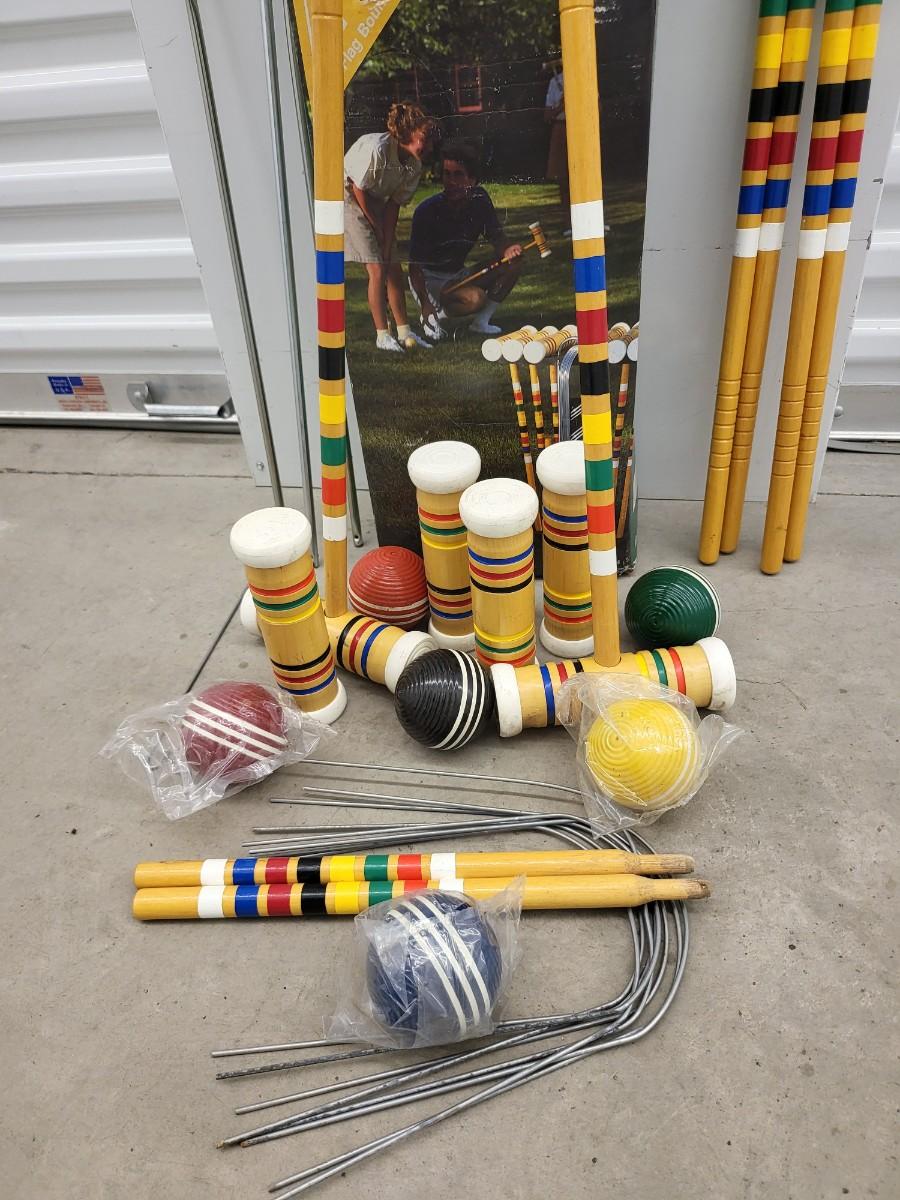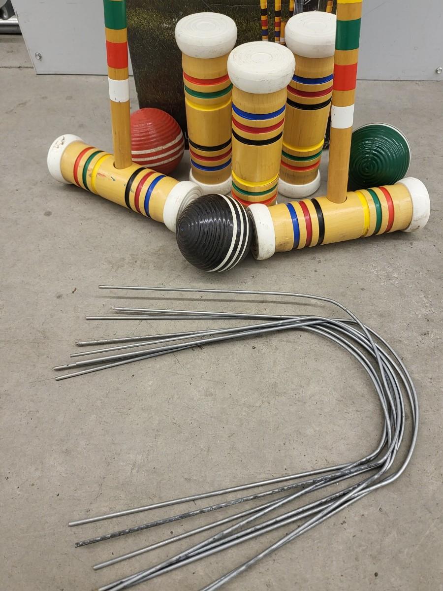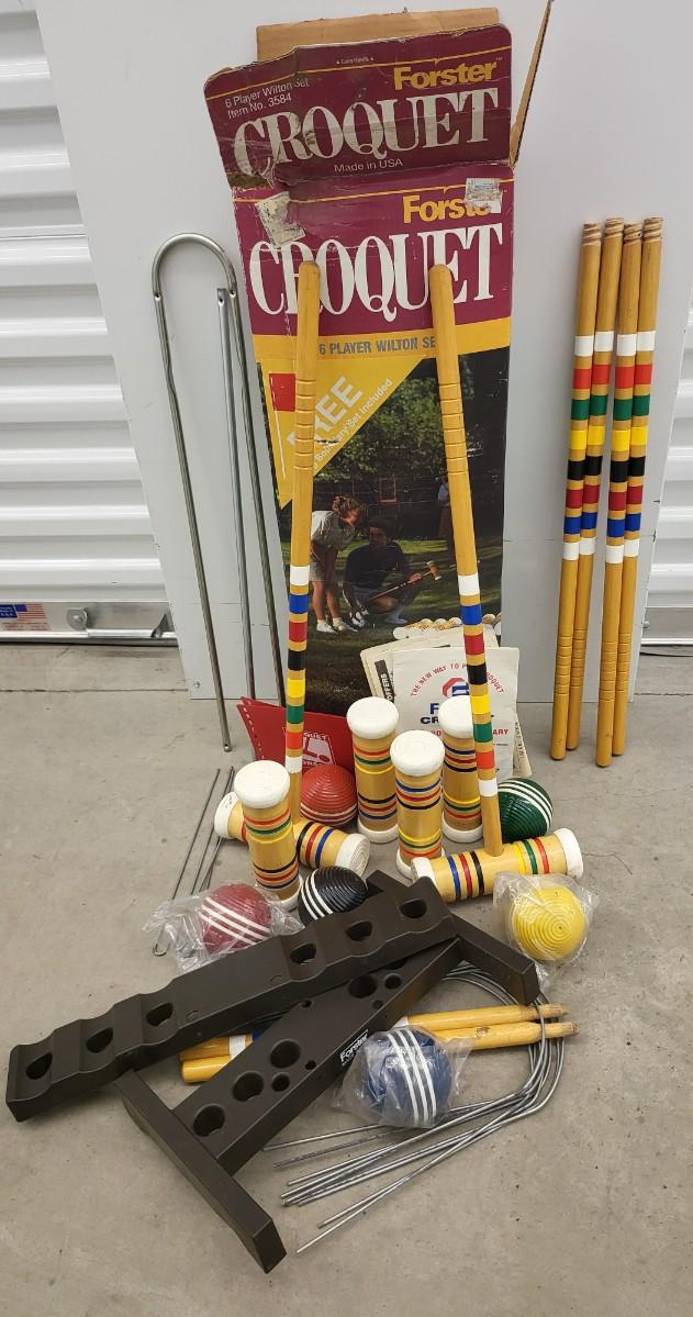 Set of six, complete Forster Croquet Set. Box included (box is open with some damage but set inself appears unused).