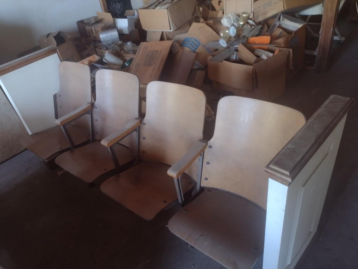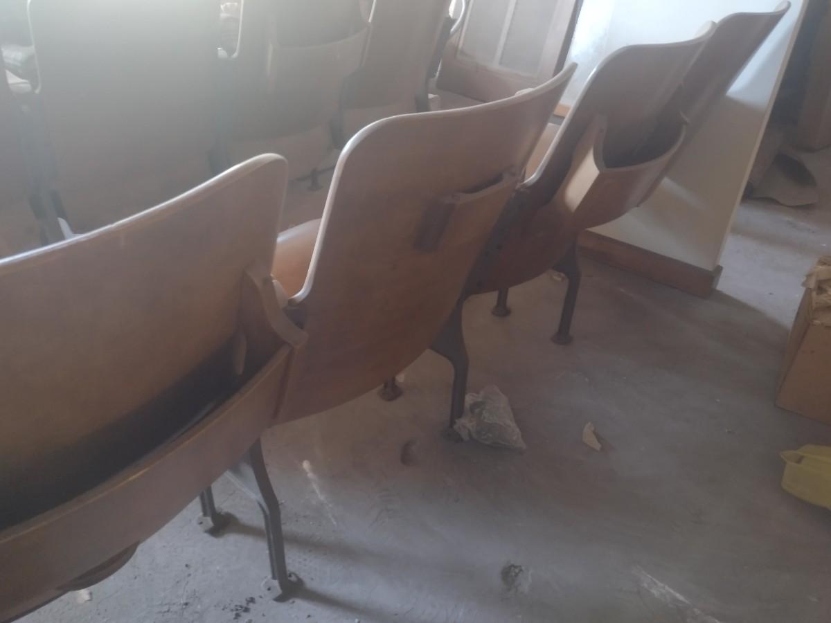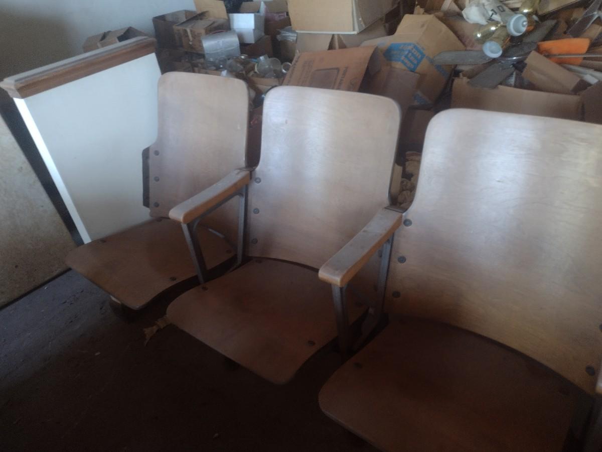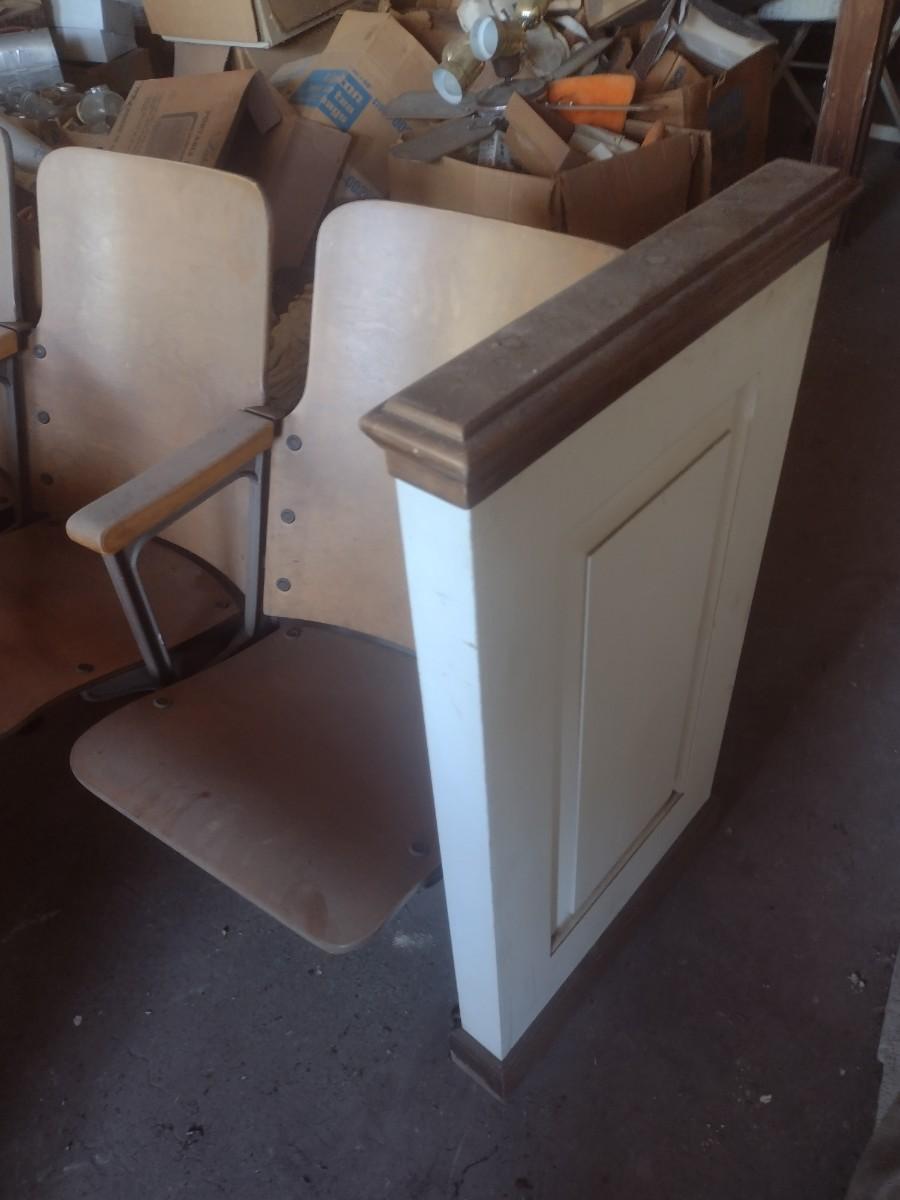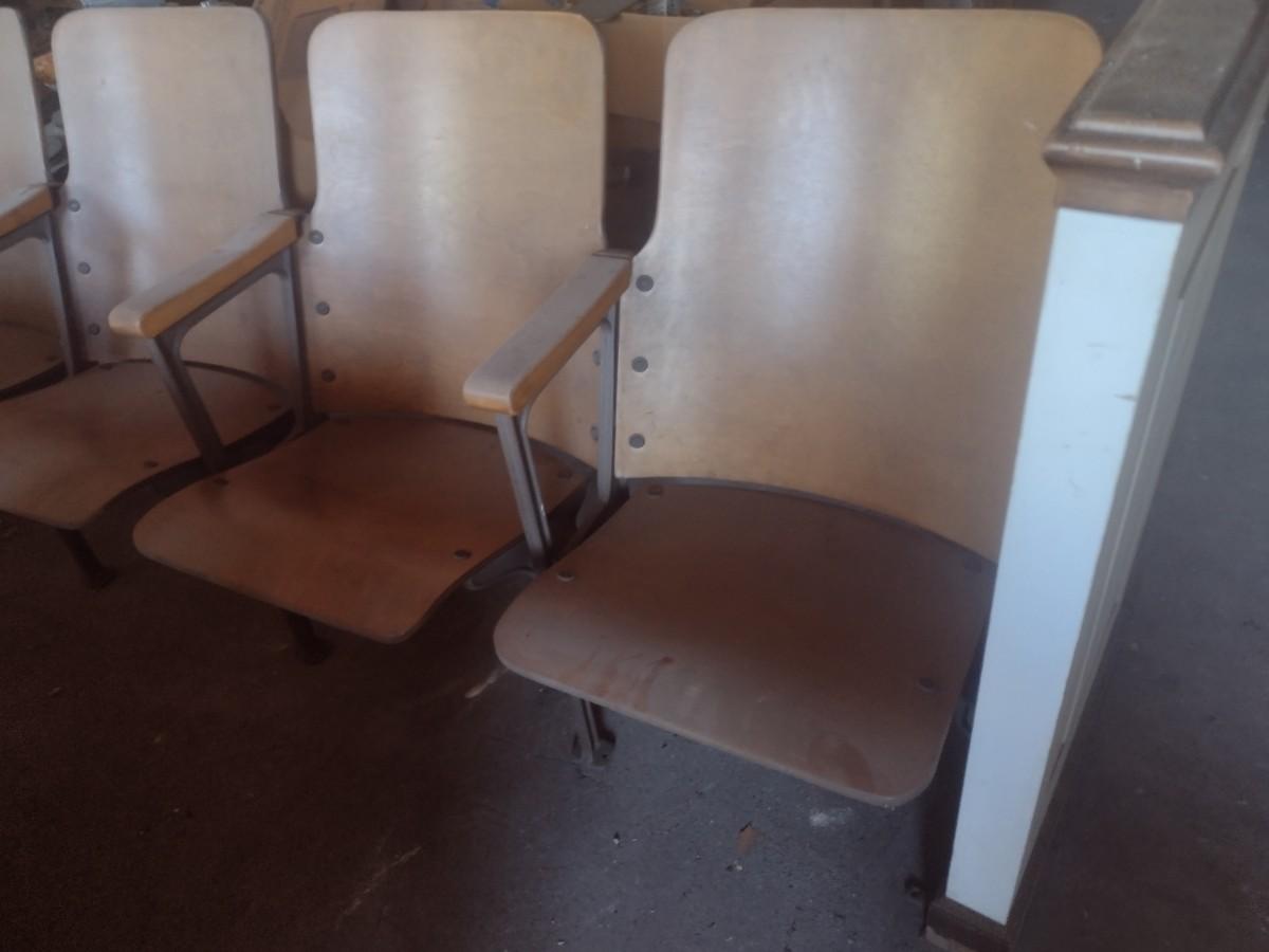 Vintage Four Chair Wood Theatre or Church Pew Seating with Flip Seat and Cast Base. Upstairs item. Bring assistance to remove from the store. Will need cleaning.