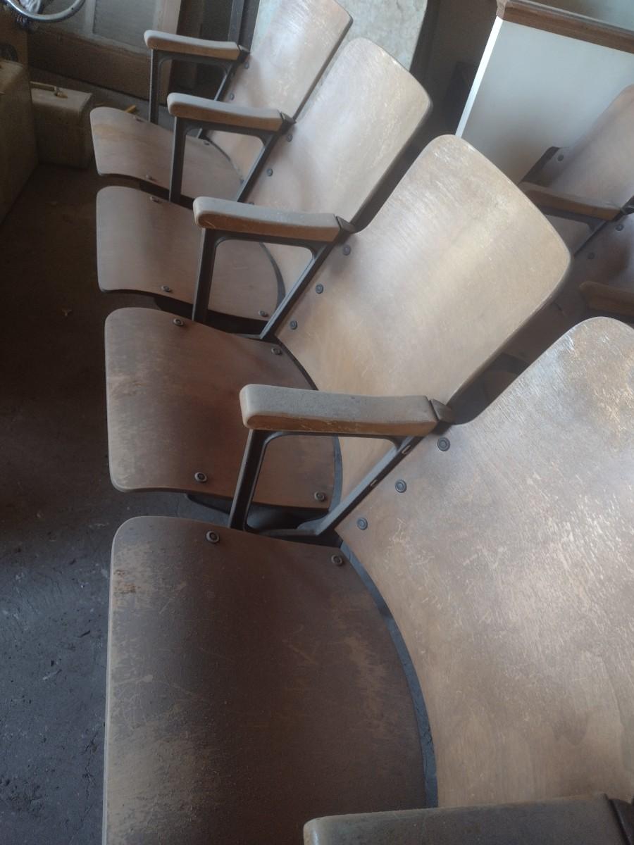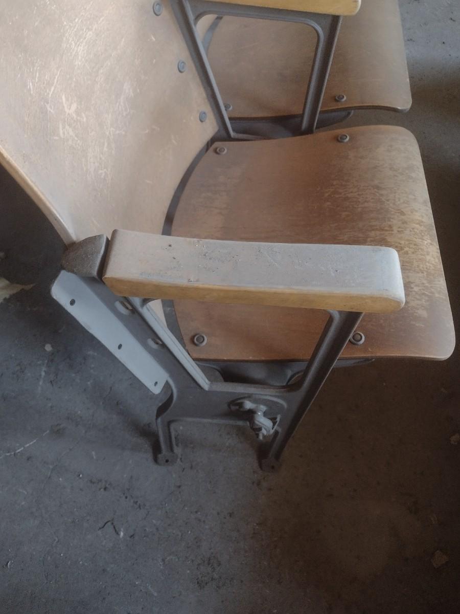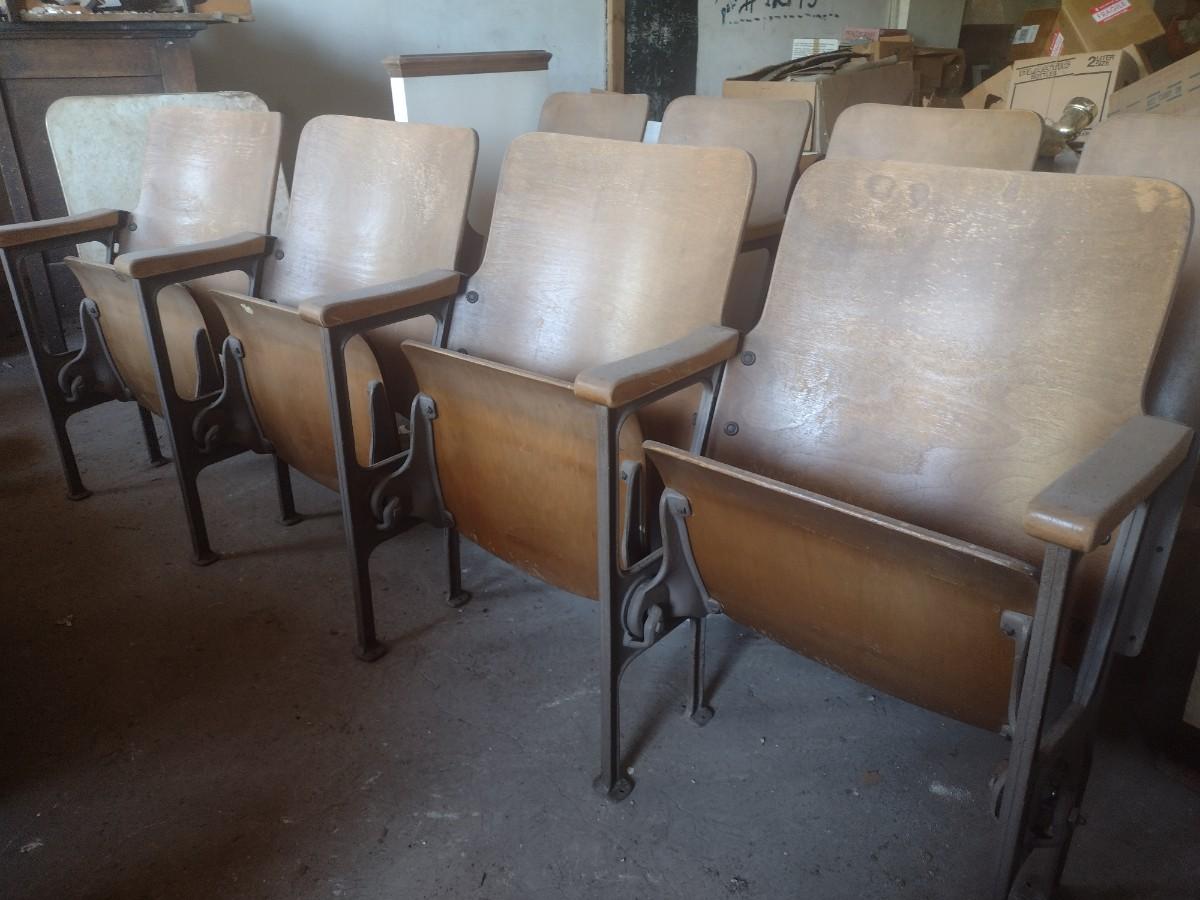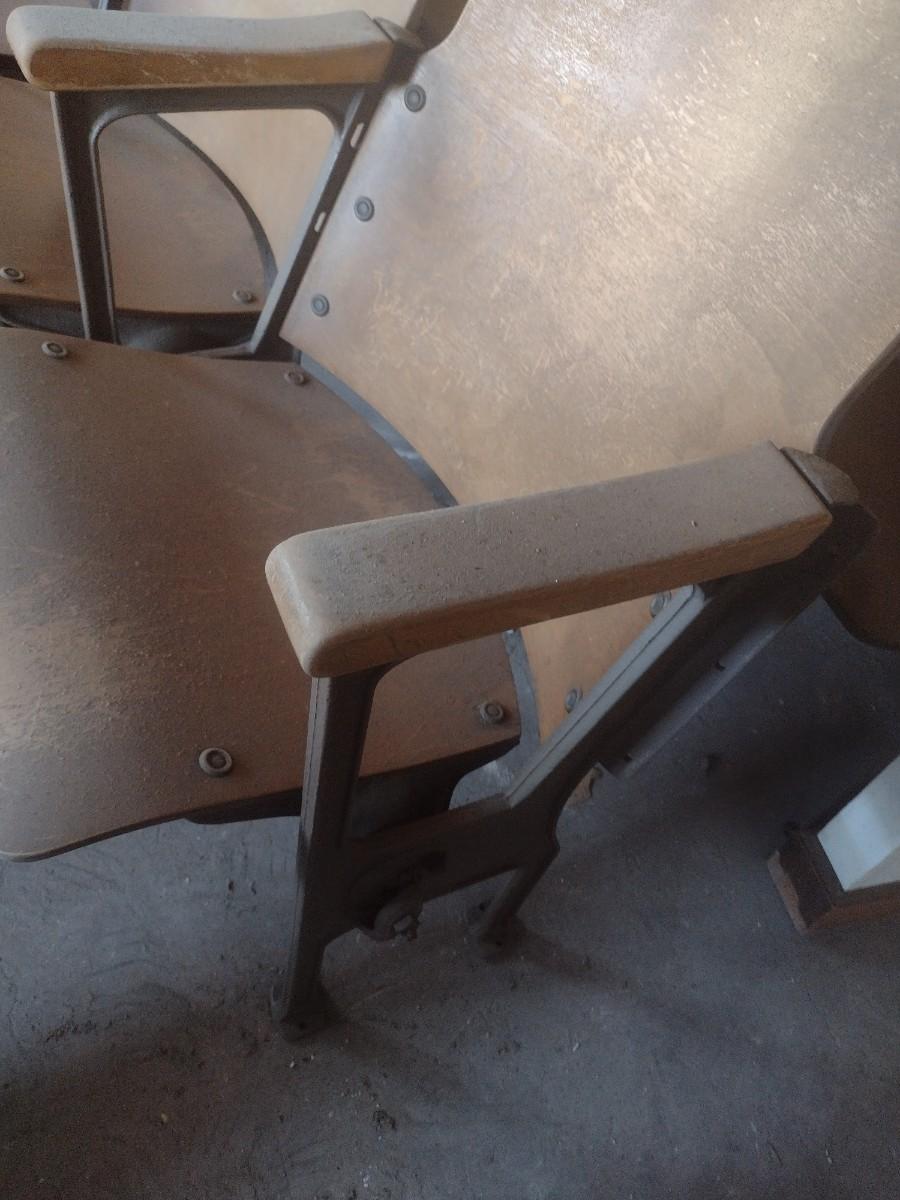 Vintage Four Chair Wood Theatre or Church Pew Seating with Flip Seat and Cast Base. Upstairs item. Bring assistance to remove from the store. Will need cleaning.