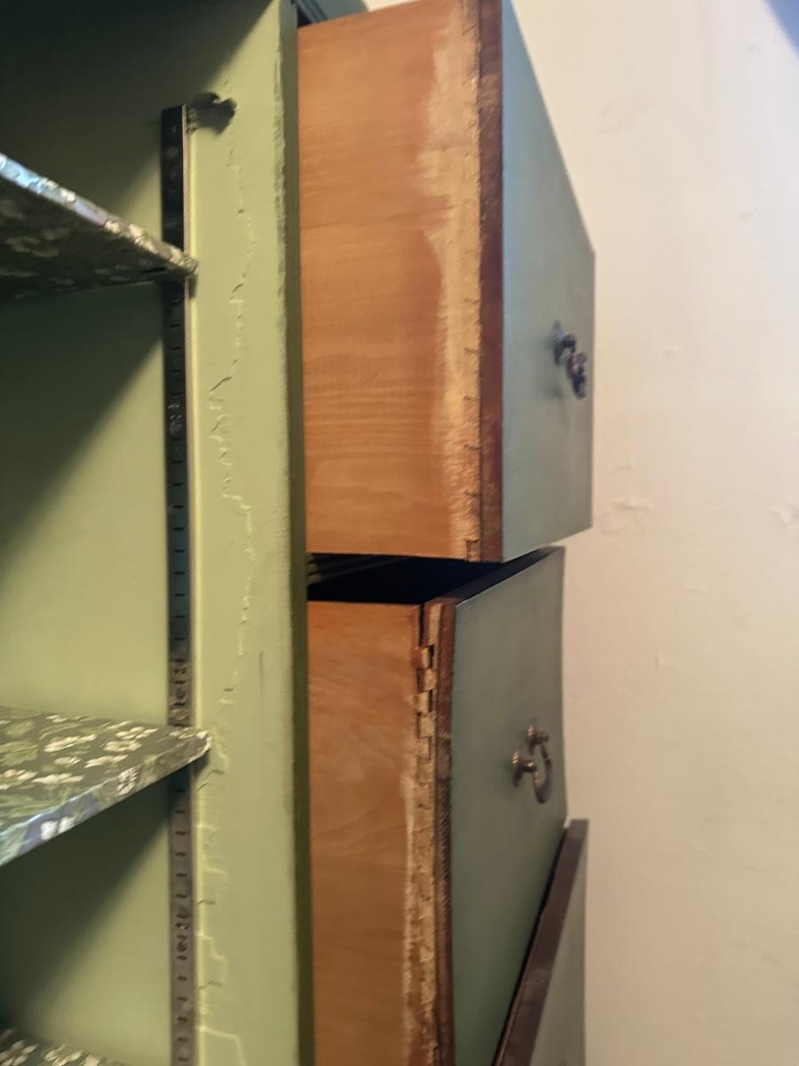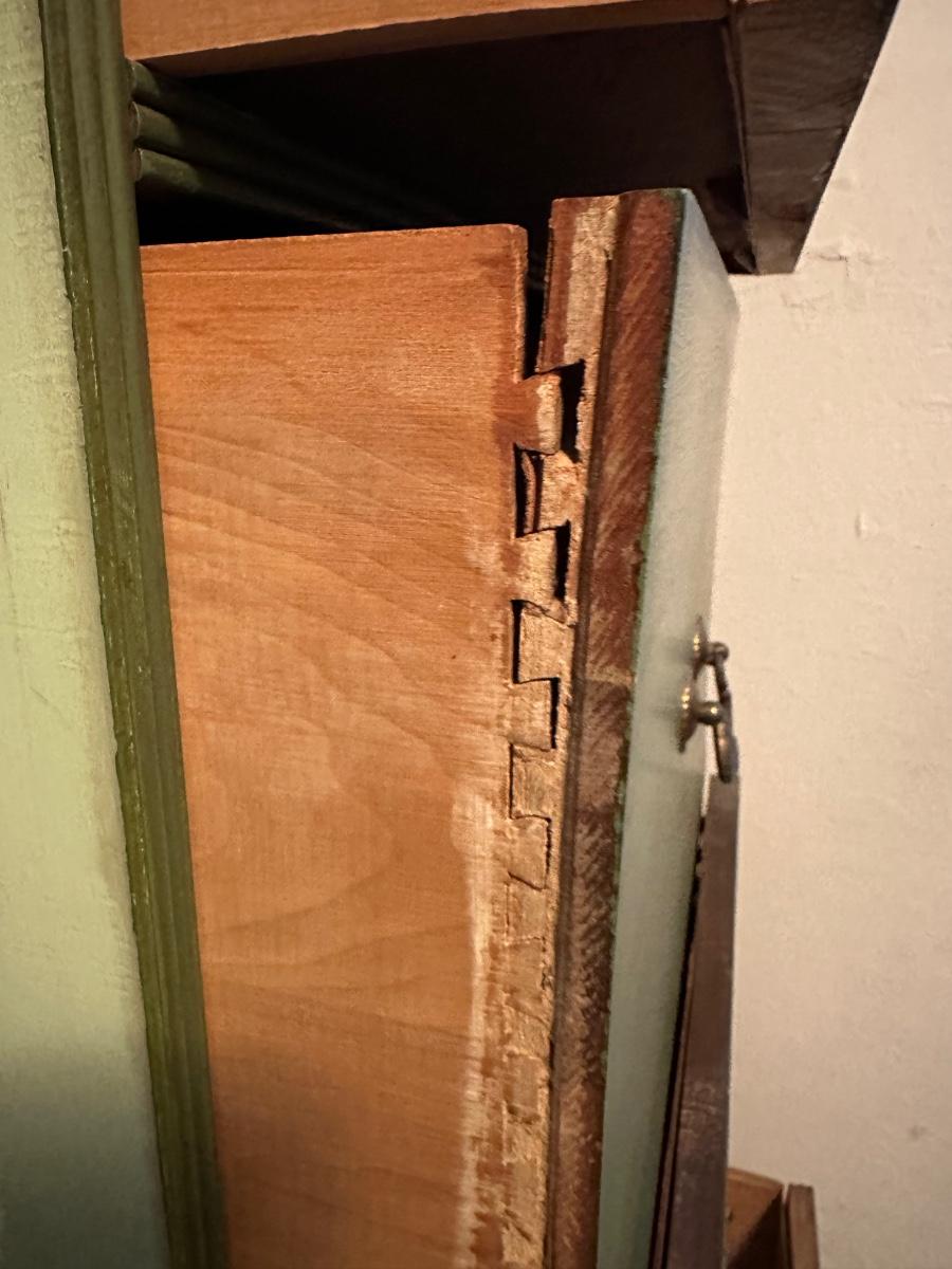 See pictures of drawer dovetails. One drawer needs to be glued back together. Still sturdy.