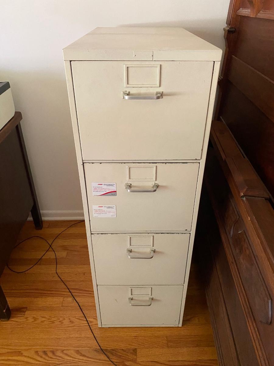Vintage Four Drawer Metal Filing Cabinet with Tilting Doors. In used vintage condition. The door front of drawers tilt forward also. PICK UP IN ARCADIA ON SATURDAY 04/15 BETWEEN 9A & 11A.