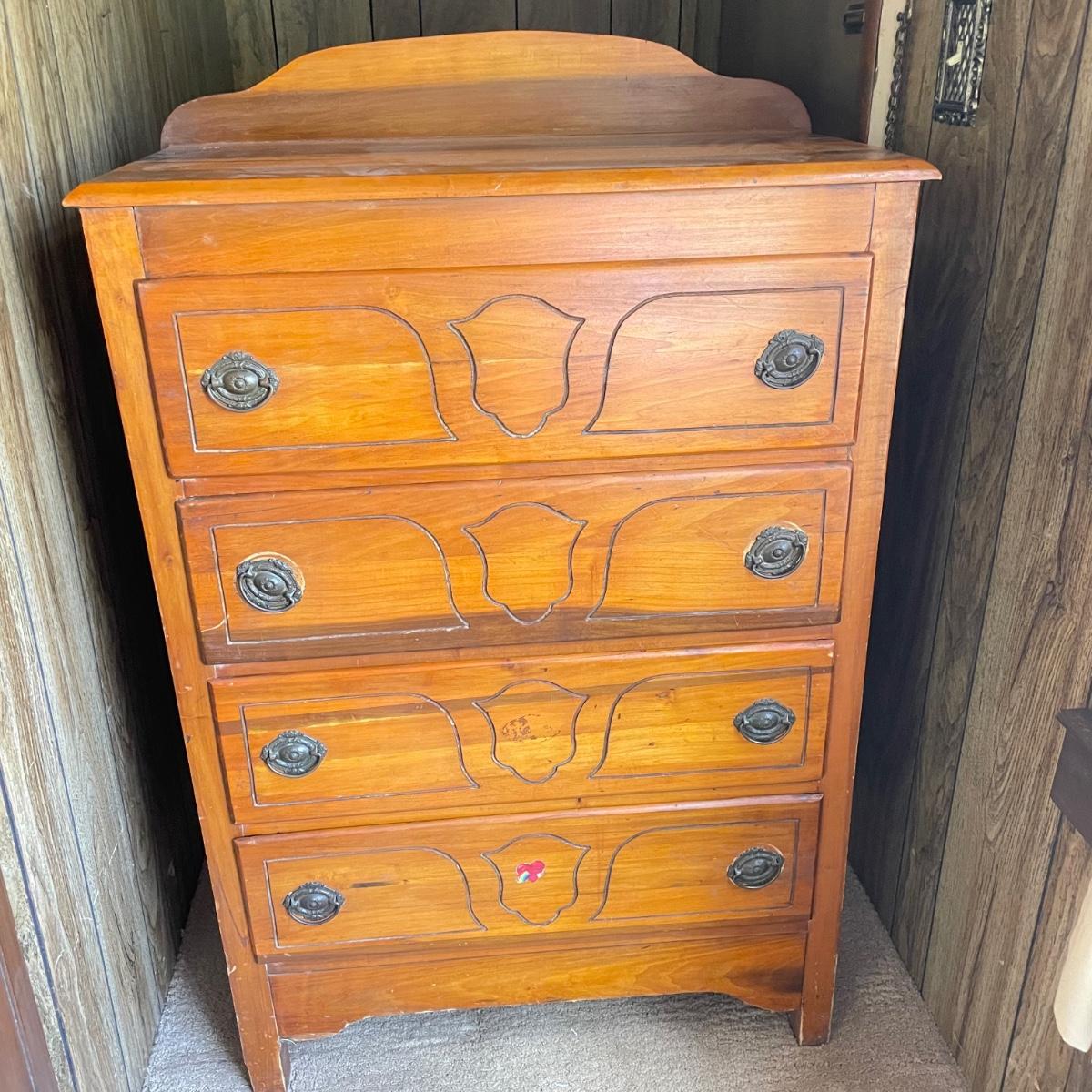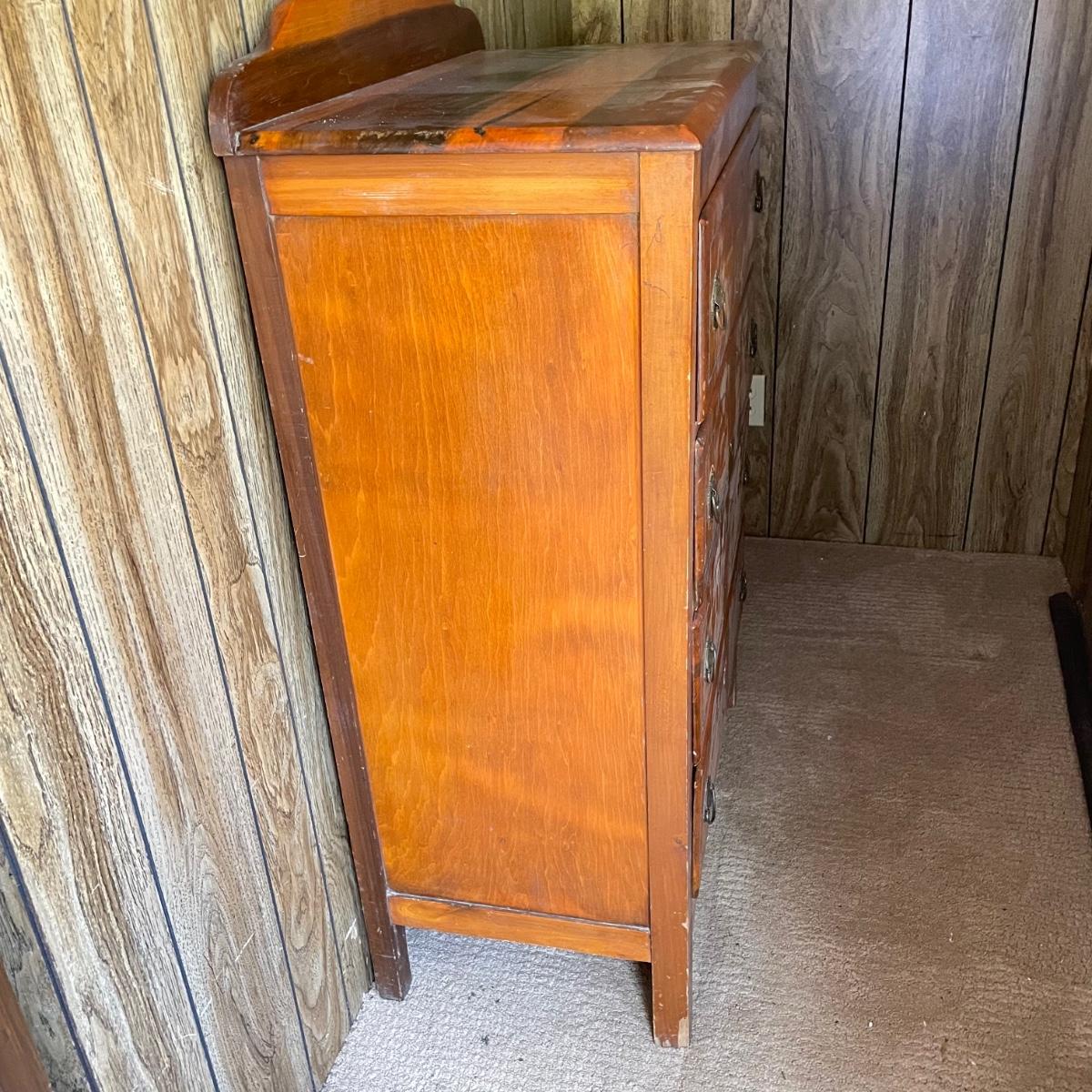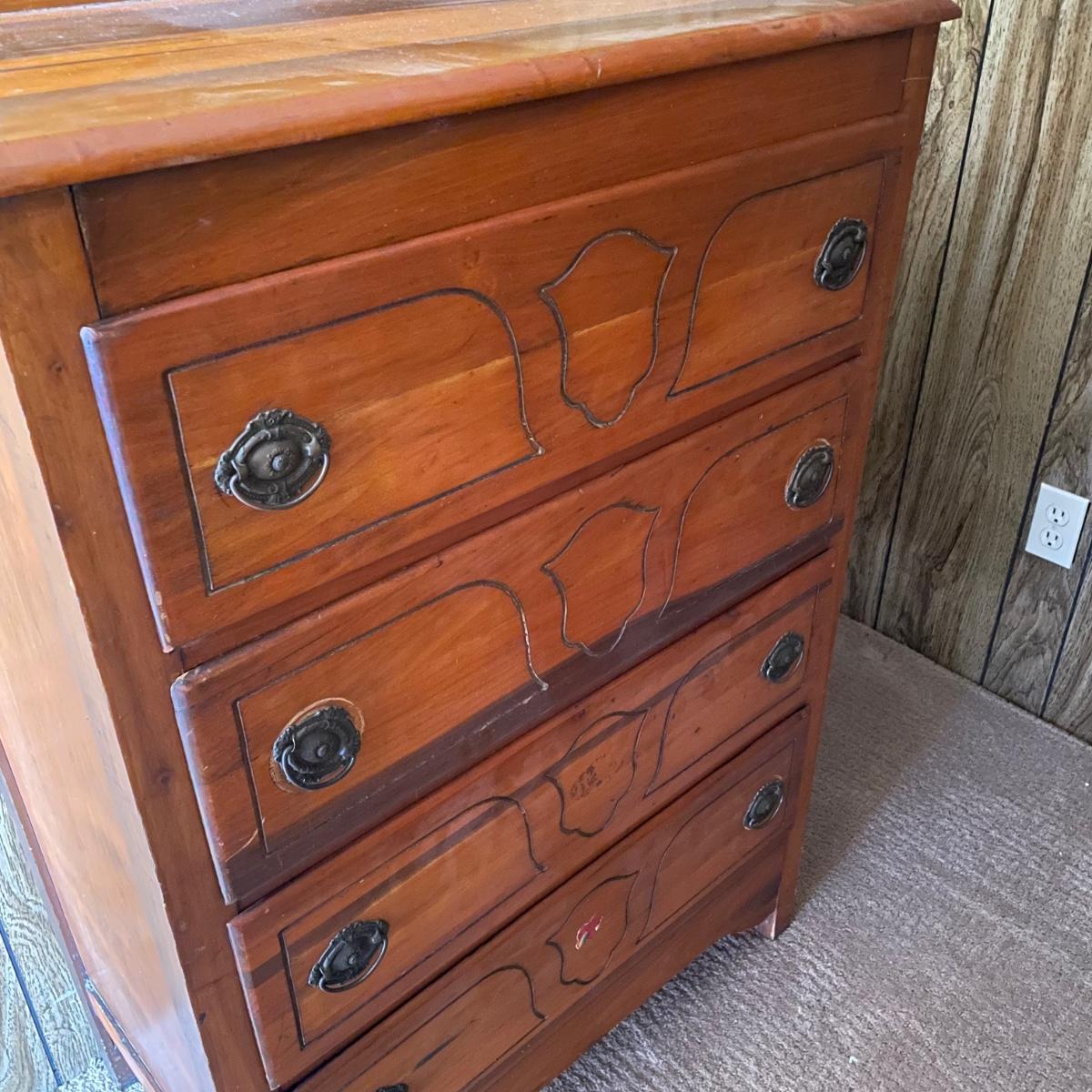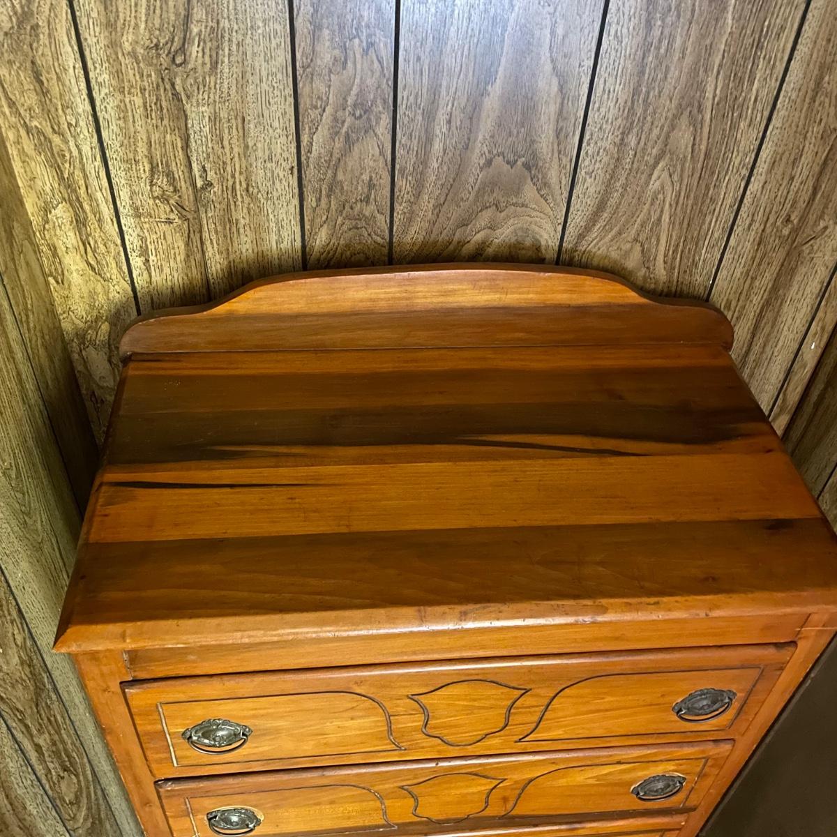 Vintage four drawer dresser with a warm orange hue to the wood grain. The dresser shows superficial scratches throughout, but no deep gouges were found. There are classic metal pulls and some scratches from the pulls turning can be seen on the second drawer. There are remnants of a sticker on the third drawer and a heart sticker on the last drawer. Piece measures 29.5” x 16” x 42” to the dresser top. Its classic wooden backsplash raises it another 4.25”. See images. Local pick up only.