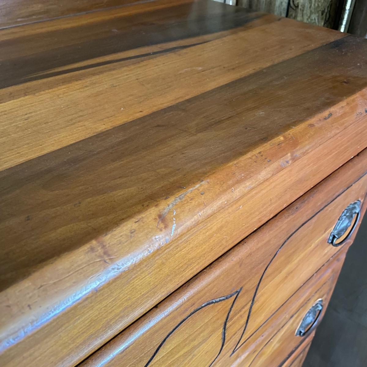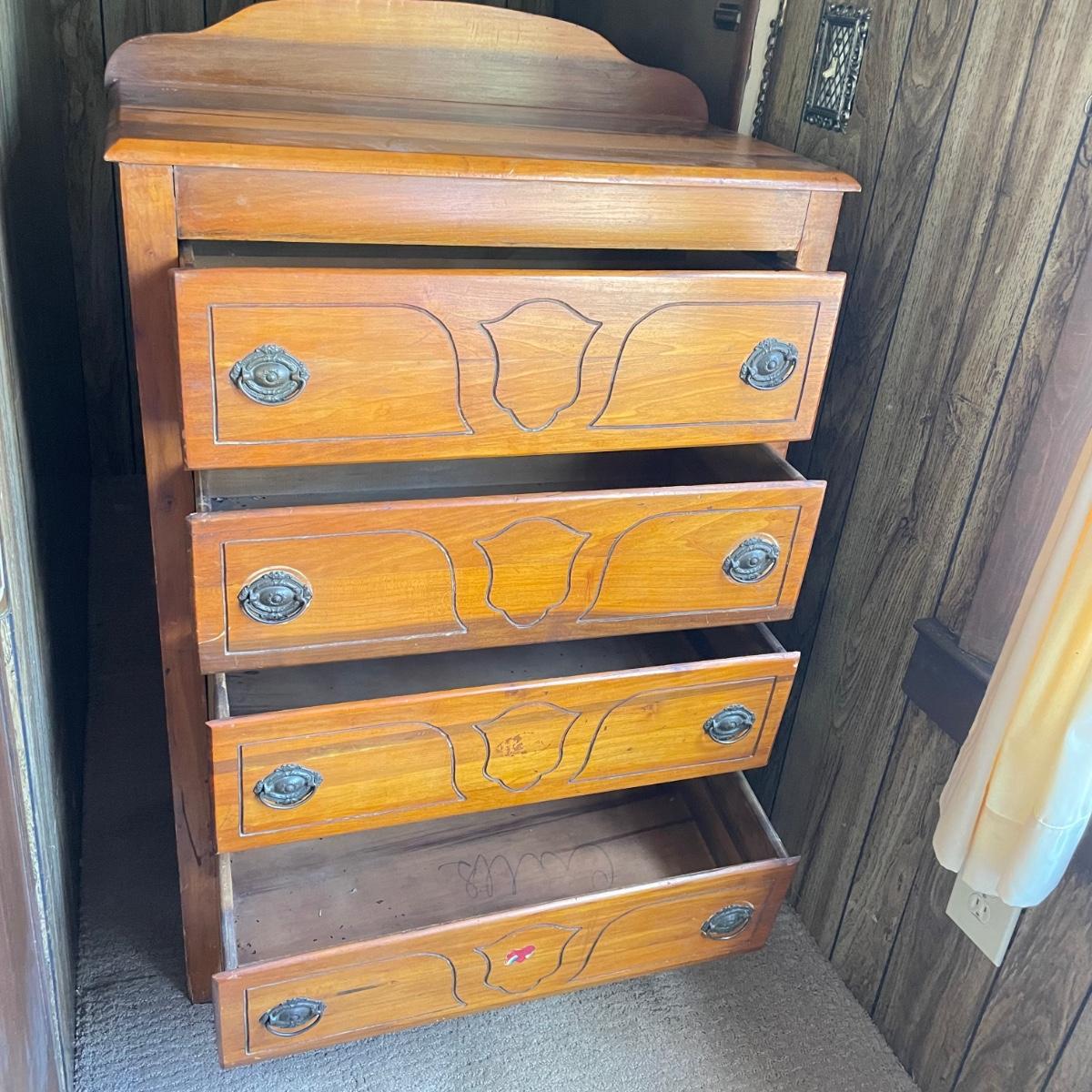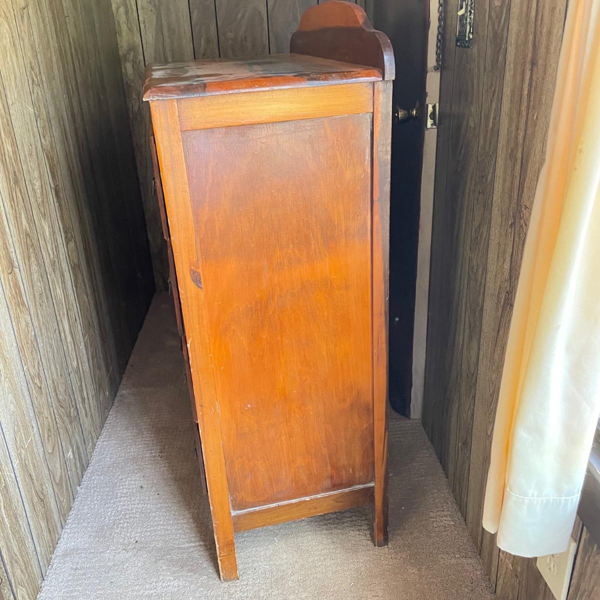 Vintage four drawer dresser with a warm orange hue to the wood grain. The dresser shows superficial scratches throughout, but no deep gouges were found. There are classic metal pulls and some scratches from the pulls turning can be seen on the second drawer. There are remnants of a sticker on the third drawer and a heart sticker on the last drawer. Piece measures 29.5” x 16” x 42” to the dresser top. Its classic wooden backsplash raises it another 4.25”. See images. Local pick up only.