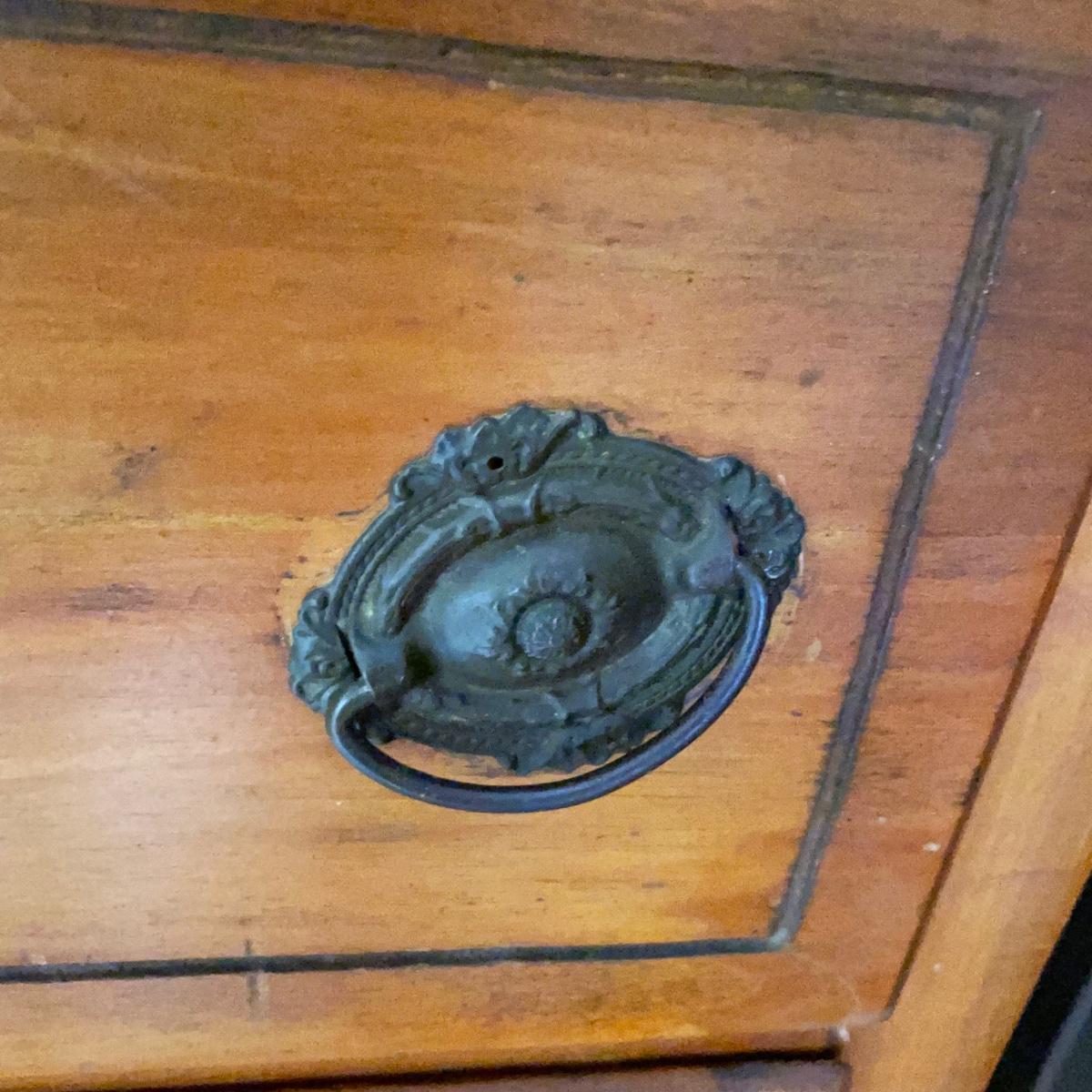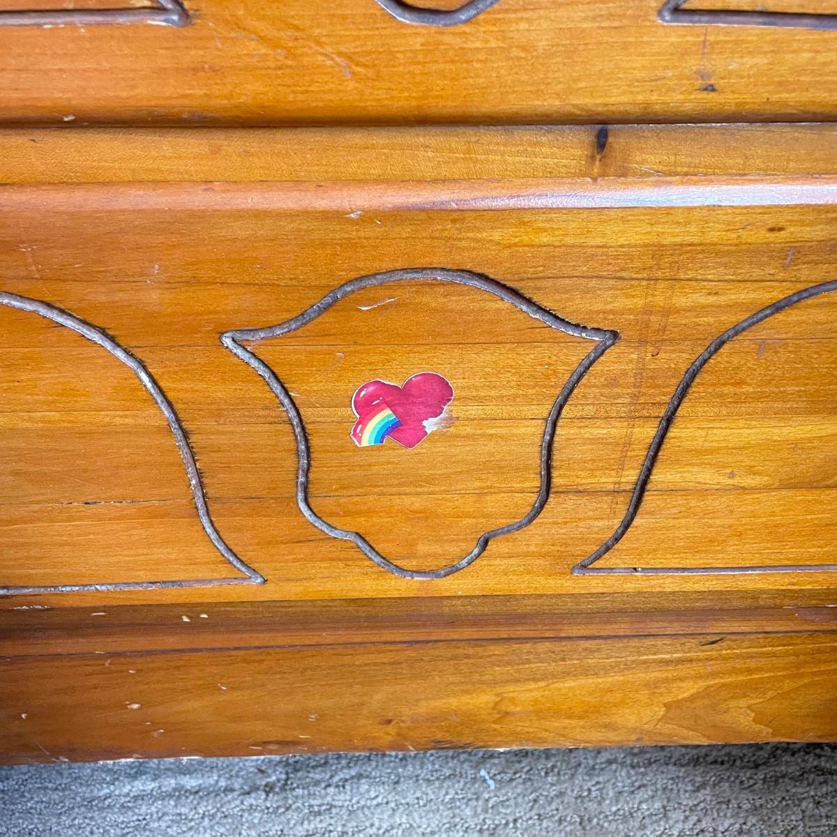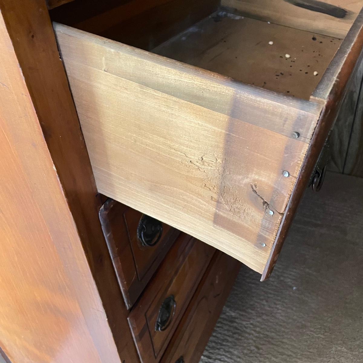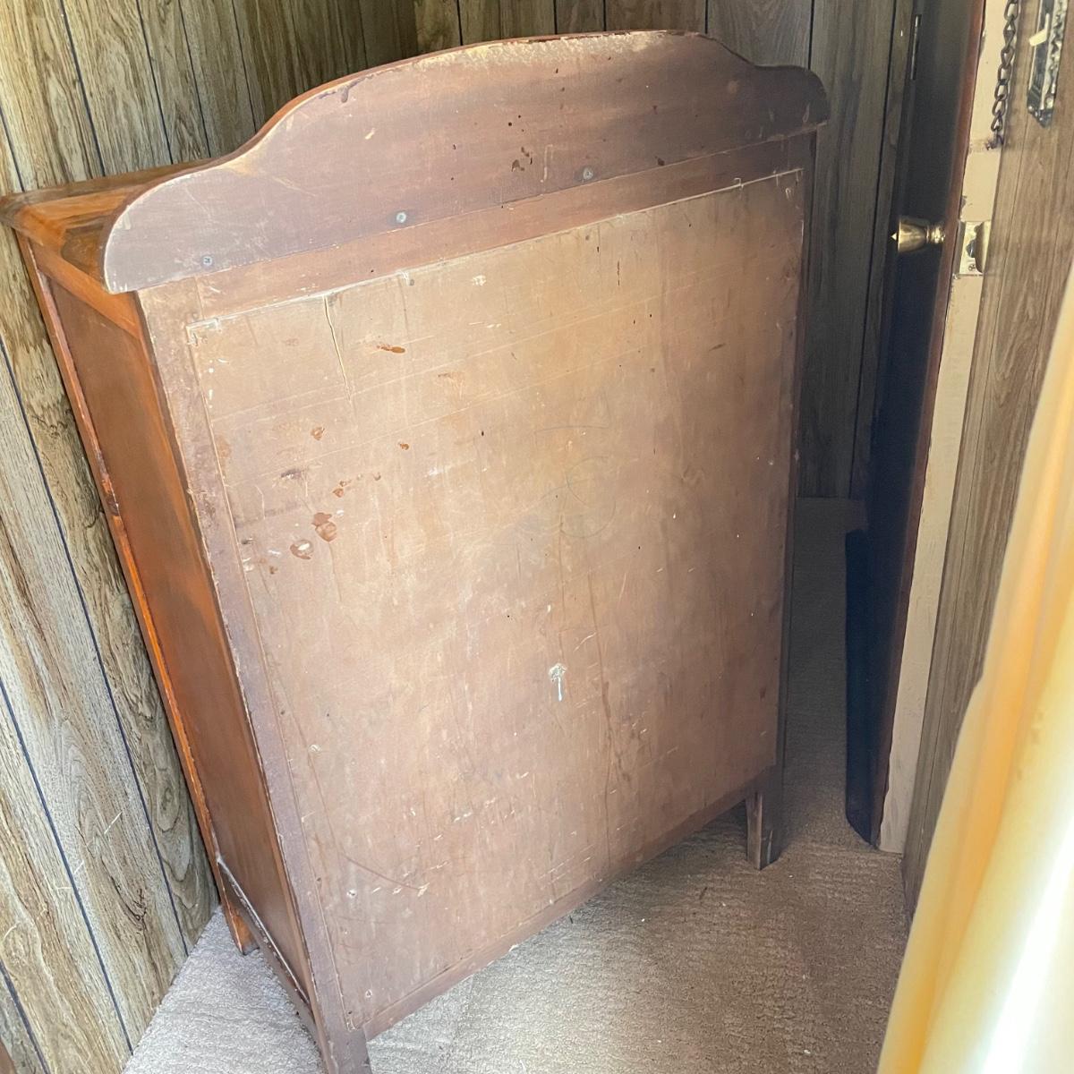 Vintage four drawer dresser with a warm orange hue to the wood grain. The dresser shows superficial scratches throughout, but no deep gouges were found. There are classic metal pulls and some scratches from the pulls turning can be seen on the second drawer. There are remnants of a sticker on the third drawer and a heart sticker on the last drawer. Piece measures 29.5” x 16” x 42” to the dresser top. Its classic wooden backsplash raises it another 4.25”. See images. Local pick up only.