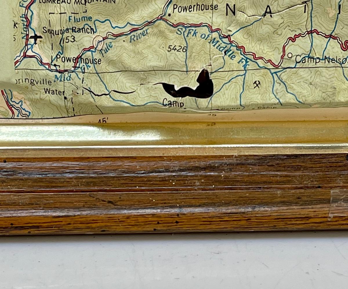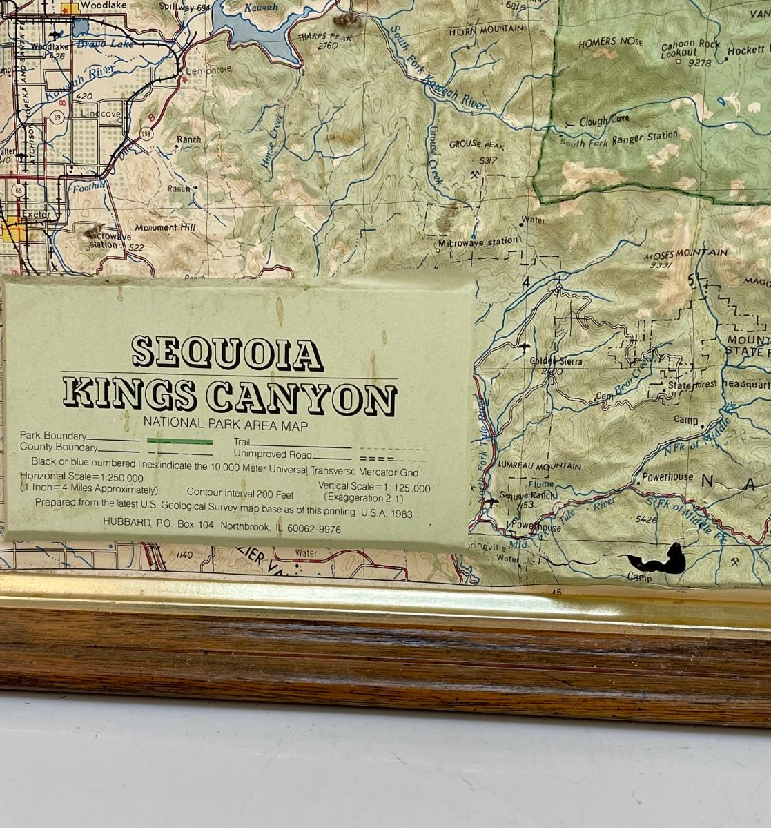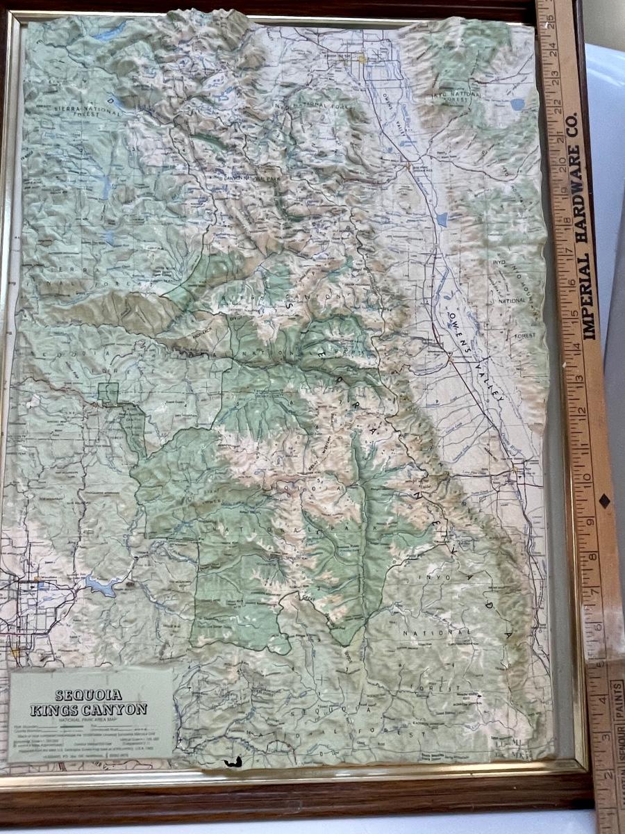 Vintage Framed 3D Relief Elevation Map Sequoia Kings Canyon National Park. Small bit of damage near the bottom left of map but in overall good condition. Great gift for a hiking enthusiast or national park lover. About 26" length.
