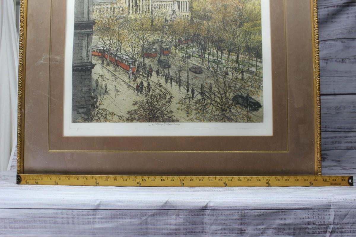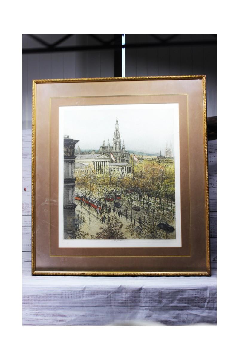 Vintage Framed and Signed Art Print of the Parliament Building City Hall of Vienna Austria