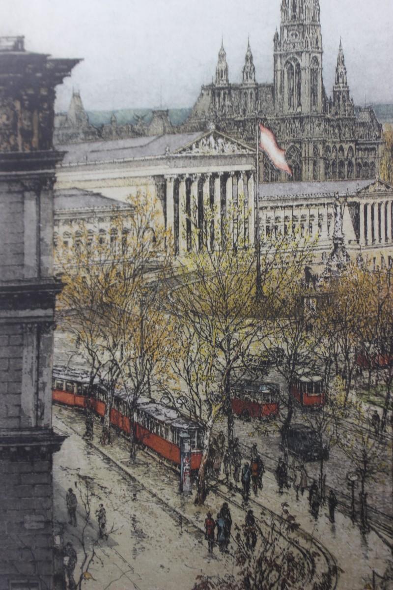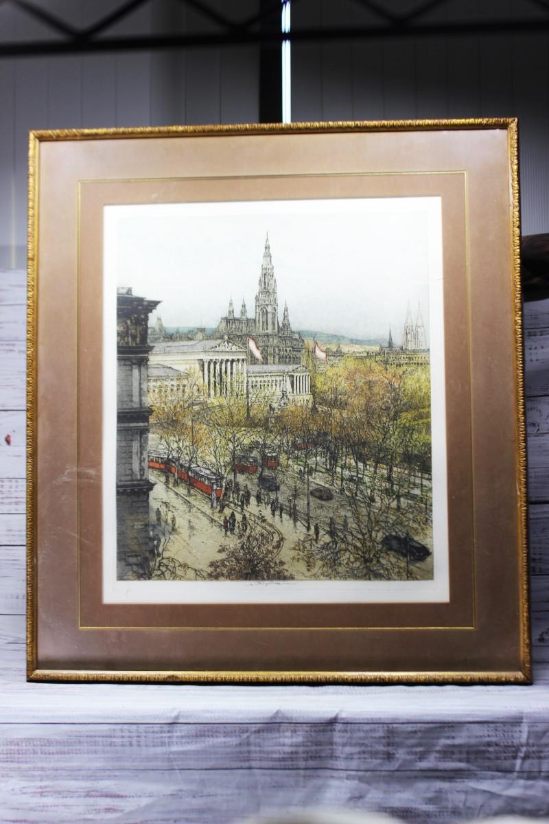 Vintage Framed and Signed Art Print of the Parliament Building City Hall of Vienna Austria, there are no cracks or chips to the frame or protective glass and is in good condition. Check pictures for more details and for sizing.