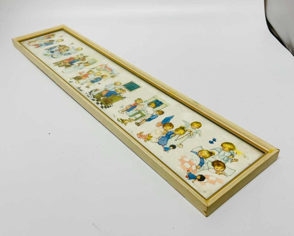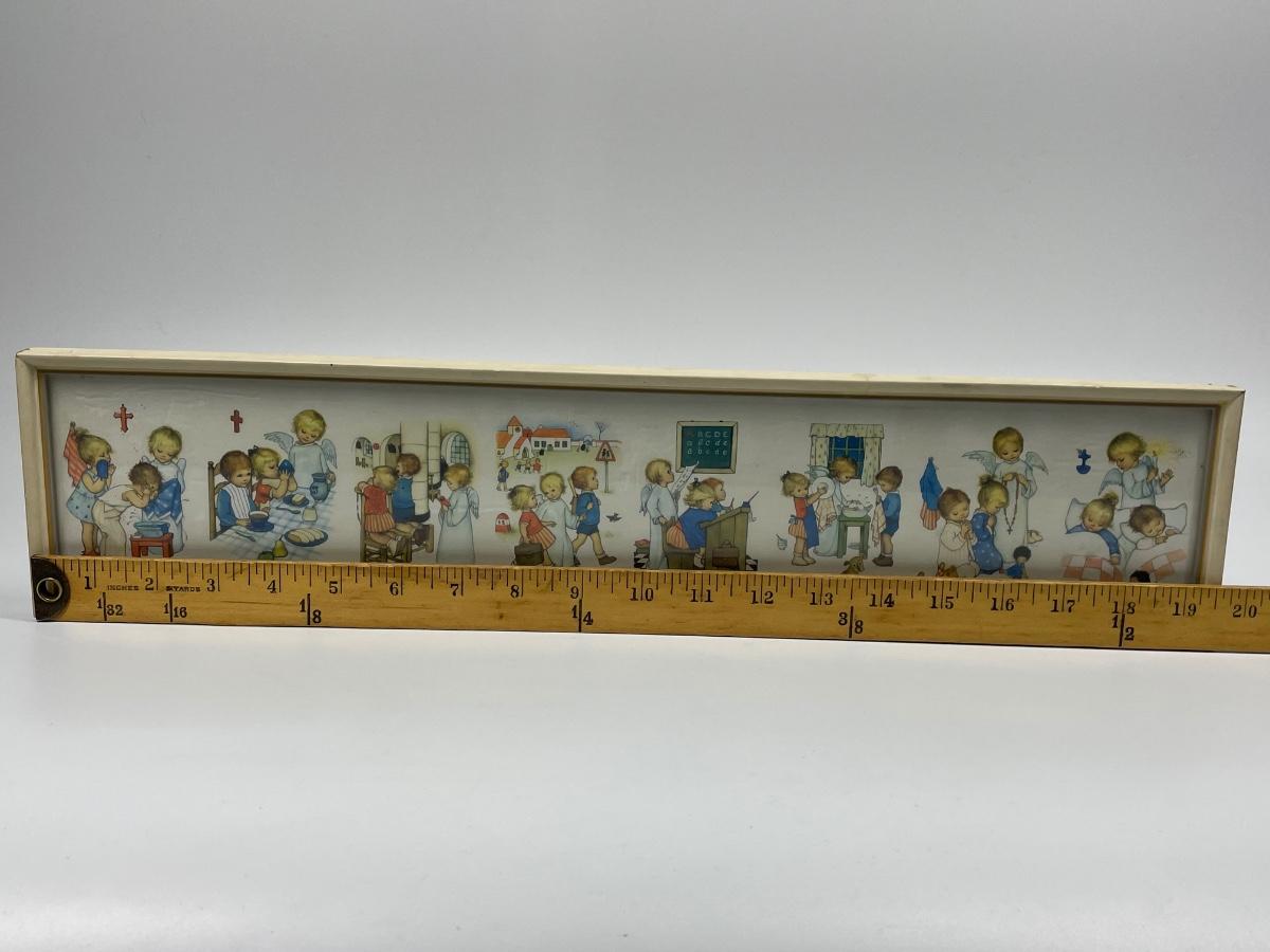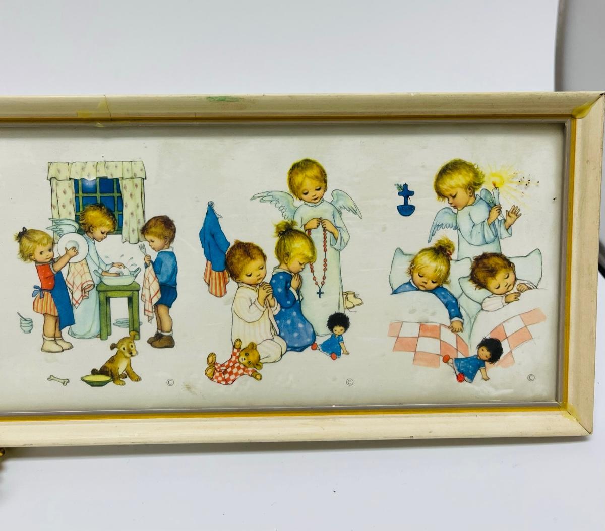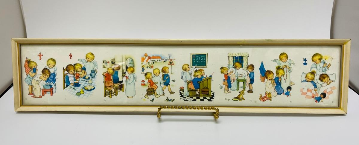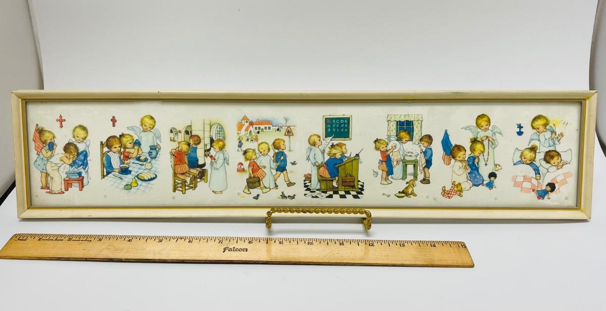 This item is in good condition, with the exception of frame damage on one corn - see photos . The picture frame is approximately 19” long. There is eight small pictures showing an Angel next to young children throughout their day.