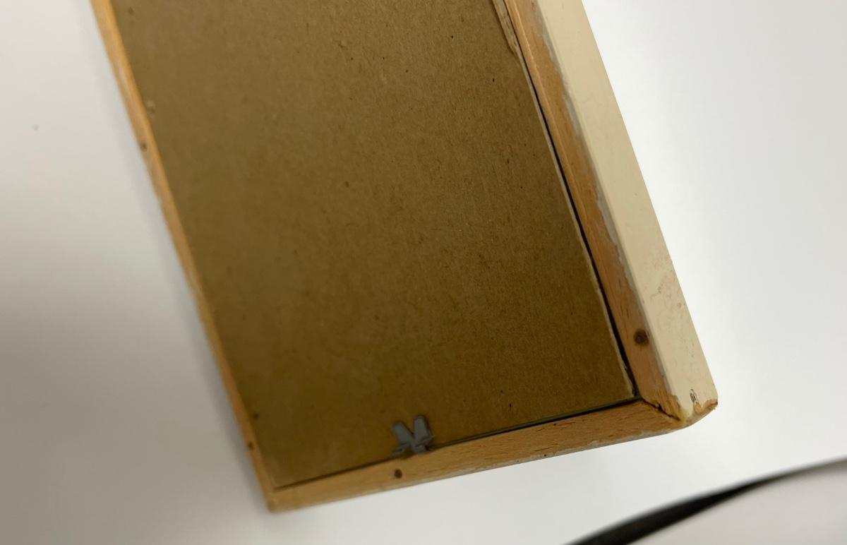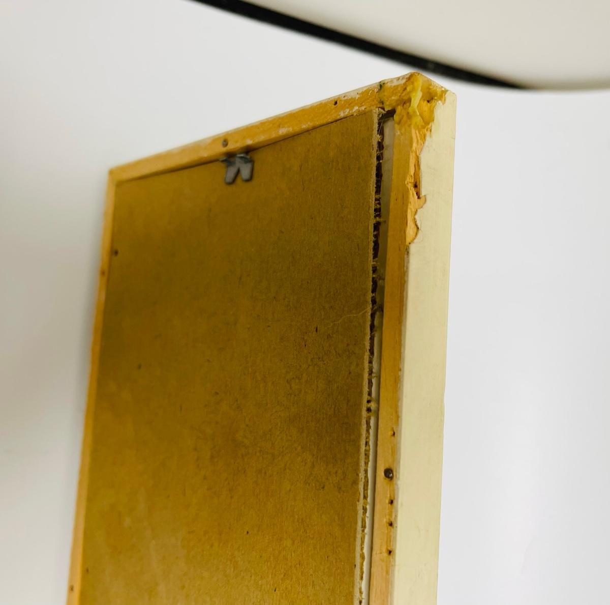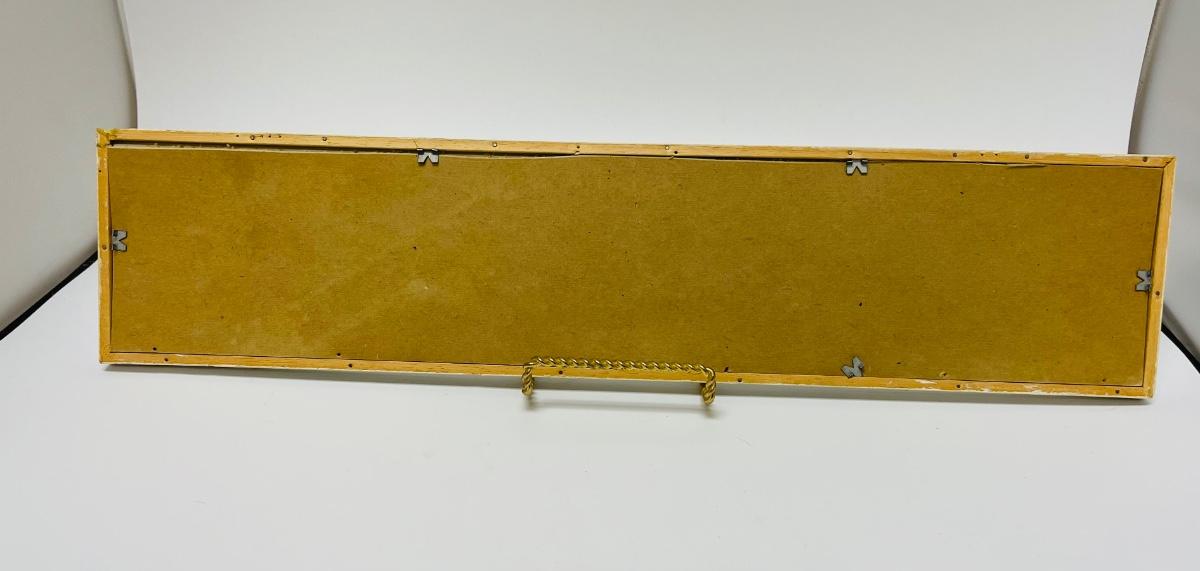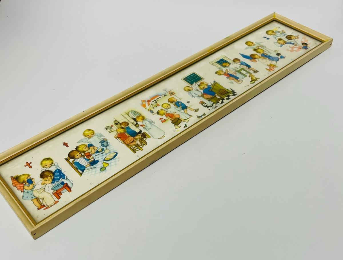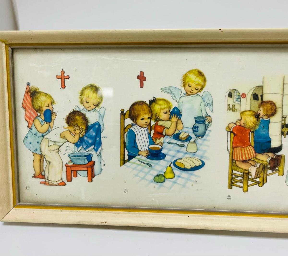 This item is in good condition, with the exception of frame damage on one corn - see photos . The picture frame is approximately 19” long. There is eight small pictures showing an Angel next to young children throughout their day.