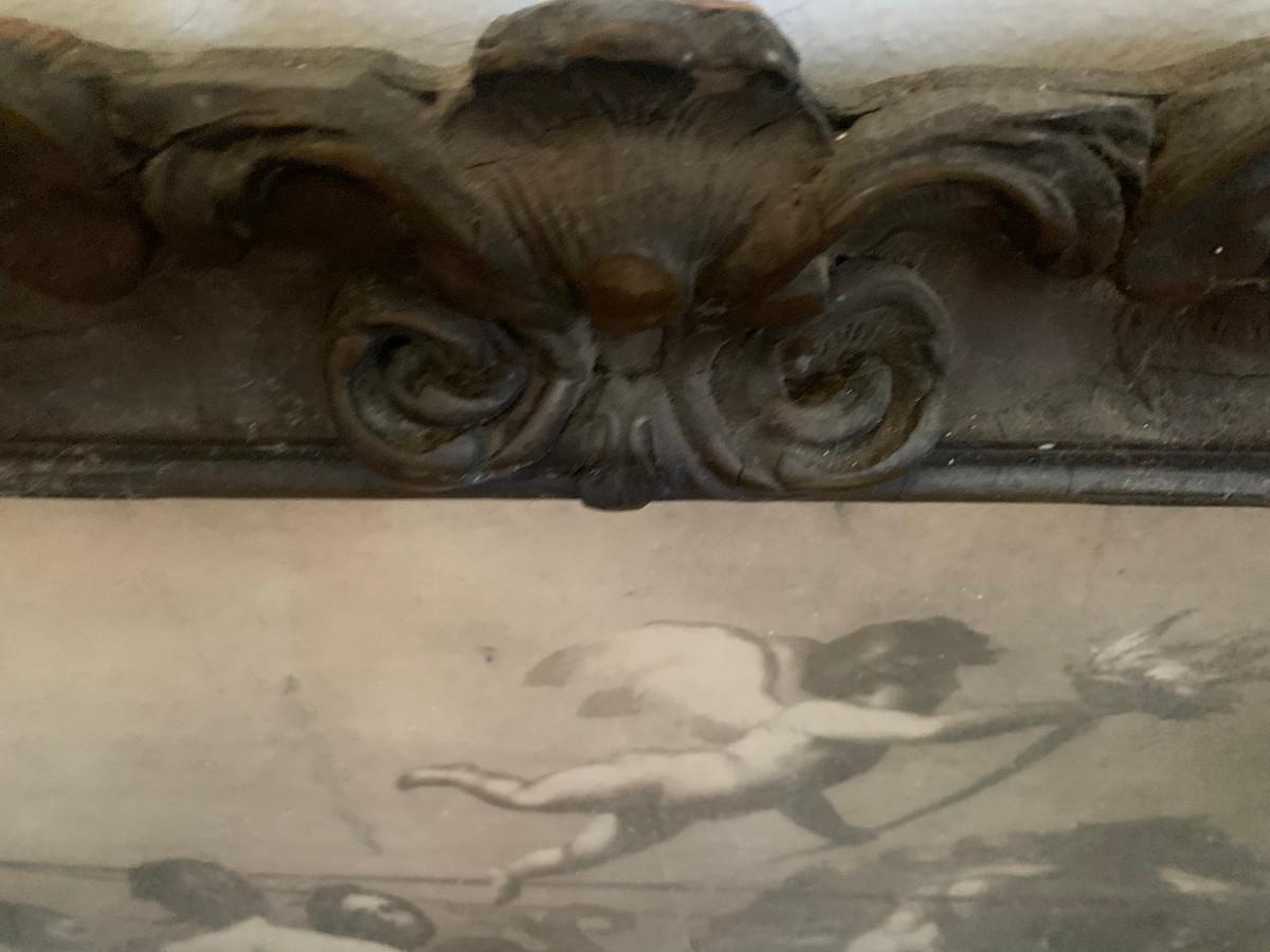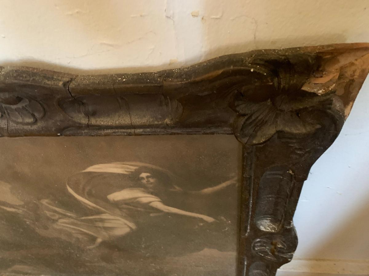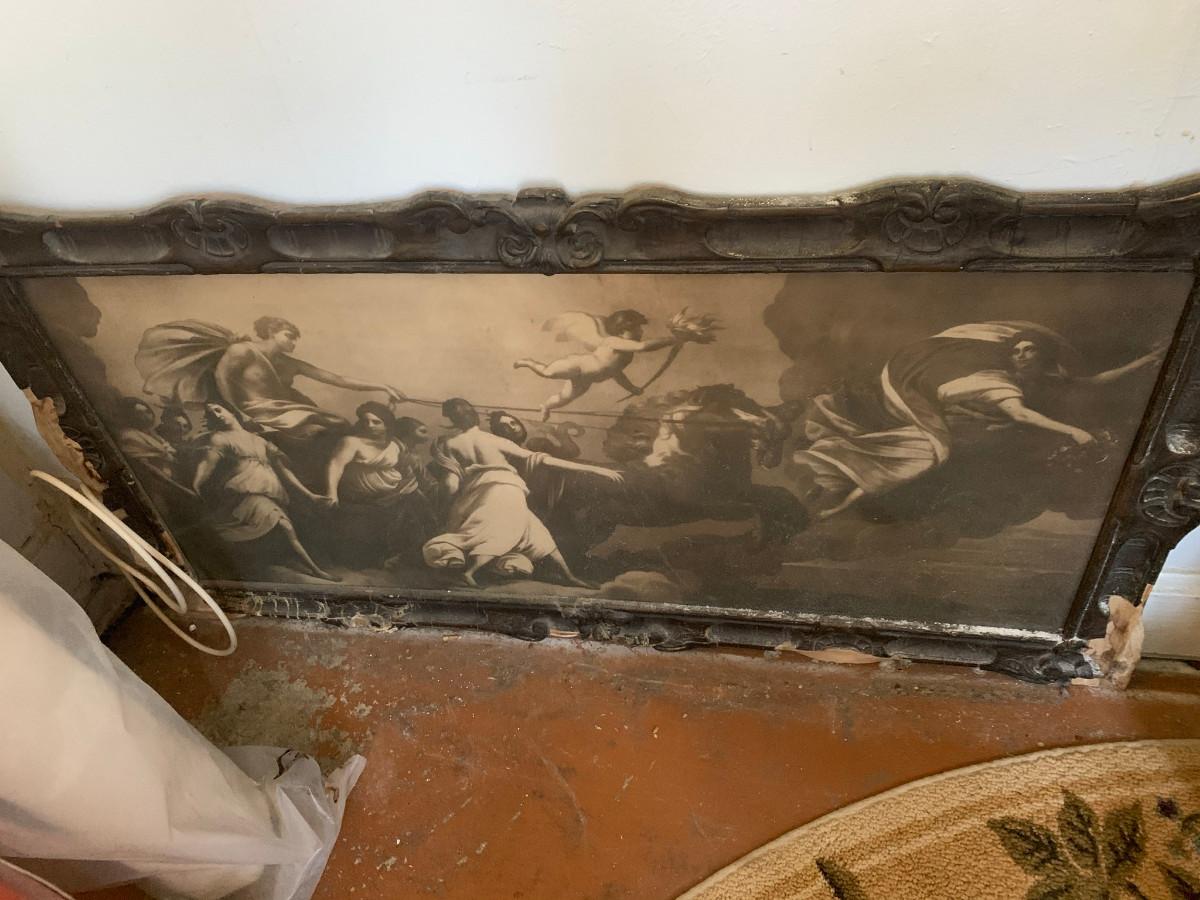 lithograph? reproduction print of Aurora by Guido Reni. The original Reni ceiling fresco, this is based on, is in the Casino dell’Aurora in Rome and was painted in 1614. It depicts Aurora, goddess of the dawn, bringing forth a new day as she leads the way for Apollo, god of light, who follows behind in his quadriga. The dancing women in the foreground are representations of the hours, showing the passage of time. It is presented behind glass with a wooden hand carved plaster like frame, papered back, and has wire to hang, but in our opinion, needs some loving restoration to the frame.