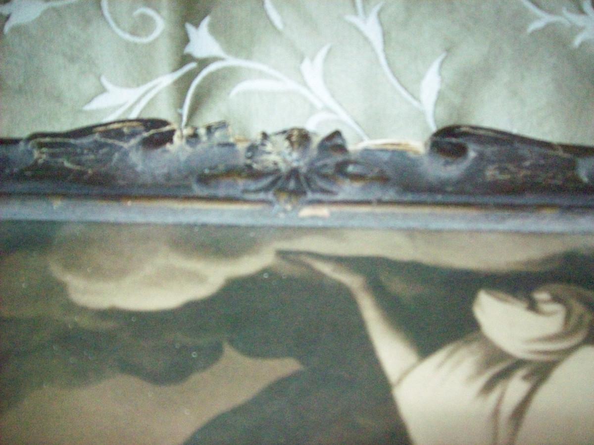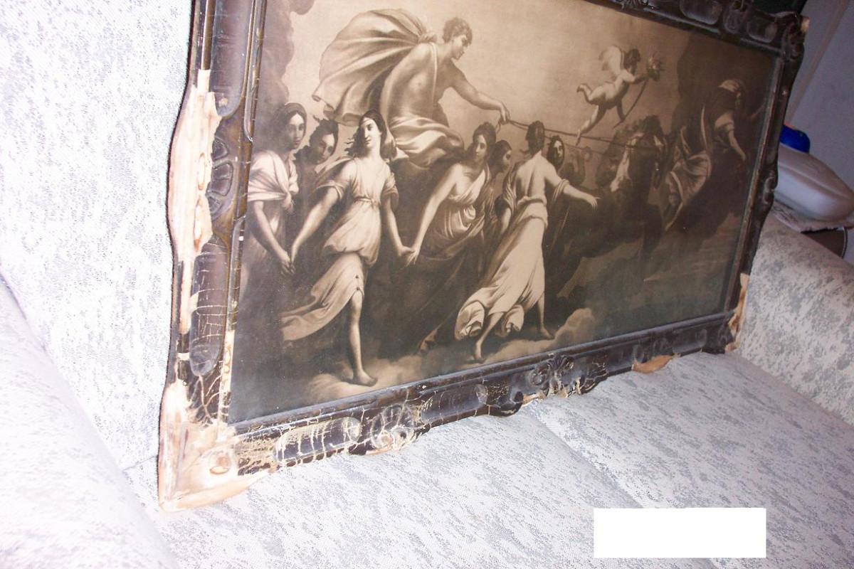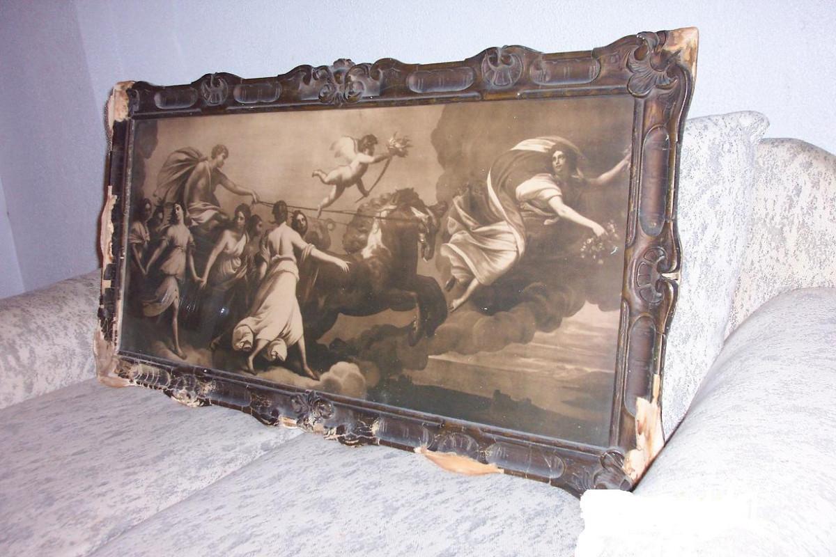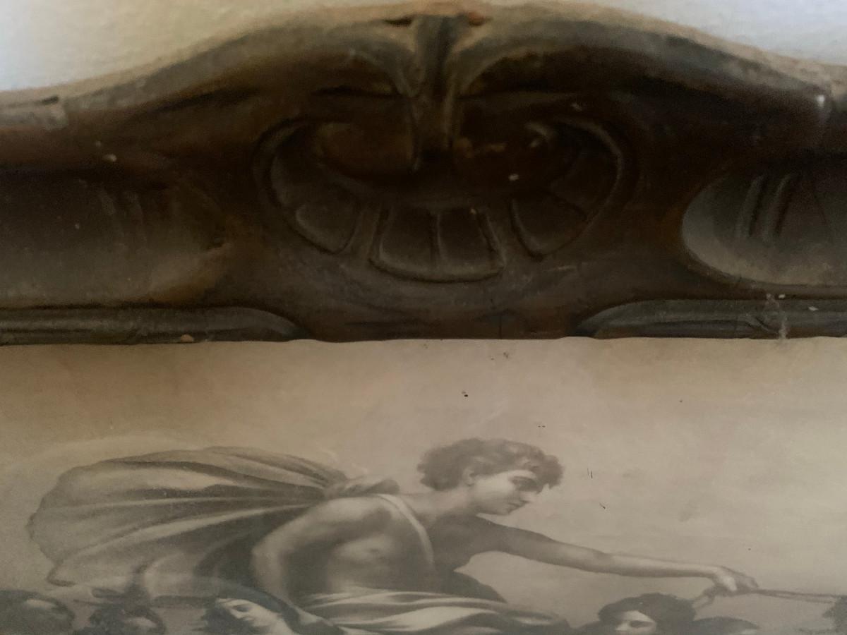 lithograph? reproduction print of Aurora by Guido Reni. The original Reni ceiling fresco, this is based on, is in the Casino dell’Aurora in Rome and was painted in 1614. It depicts Aurora, goddess of the dawn, bringing forth a new day as she leads the way for Apollo, god of light, who follows behind in his quadriga. The dancing women in the foreground are representations of the hours, showing the passage of time. It is presented behind glass with a wooden hand carved plaster like frame, papered back, and has wire to hang, but in our opinion, needs some loving restoration to the frame.