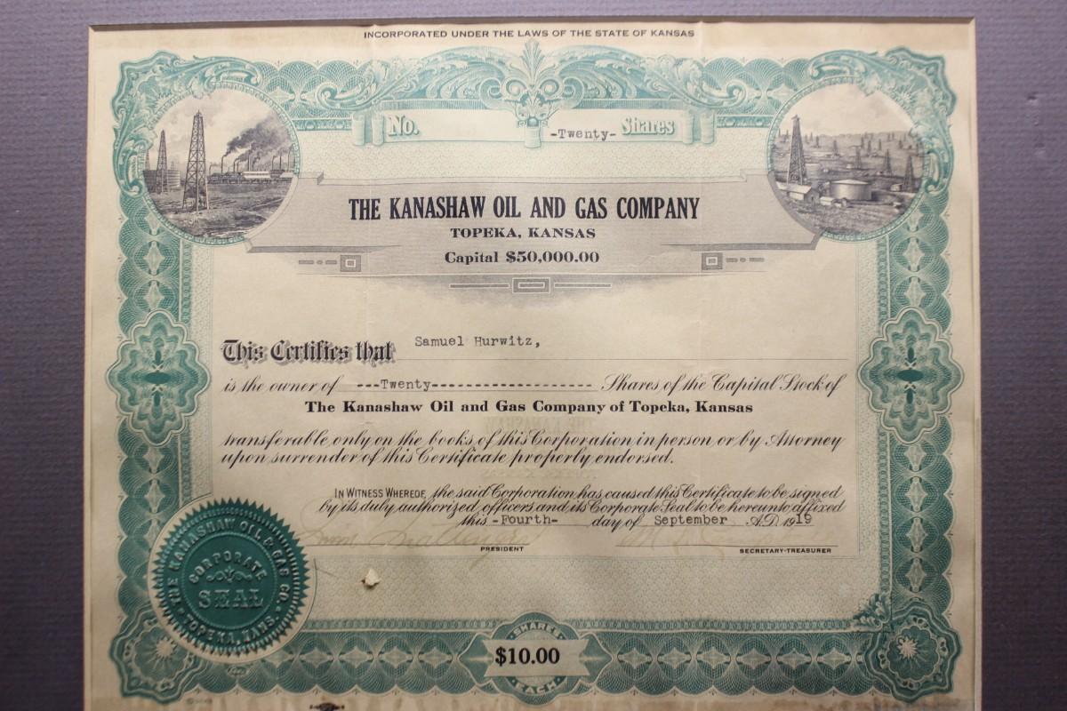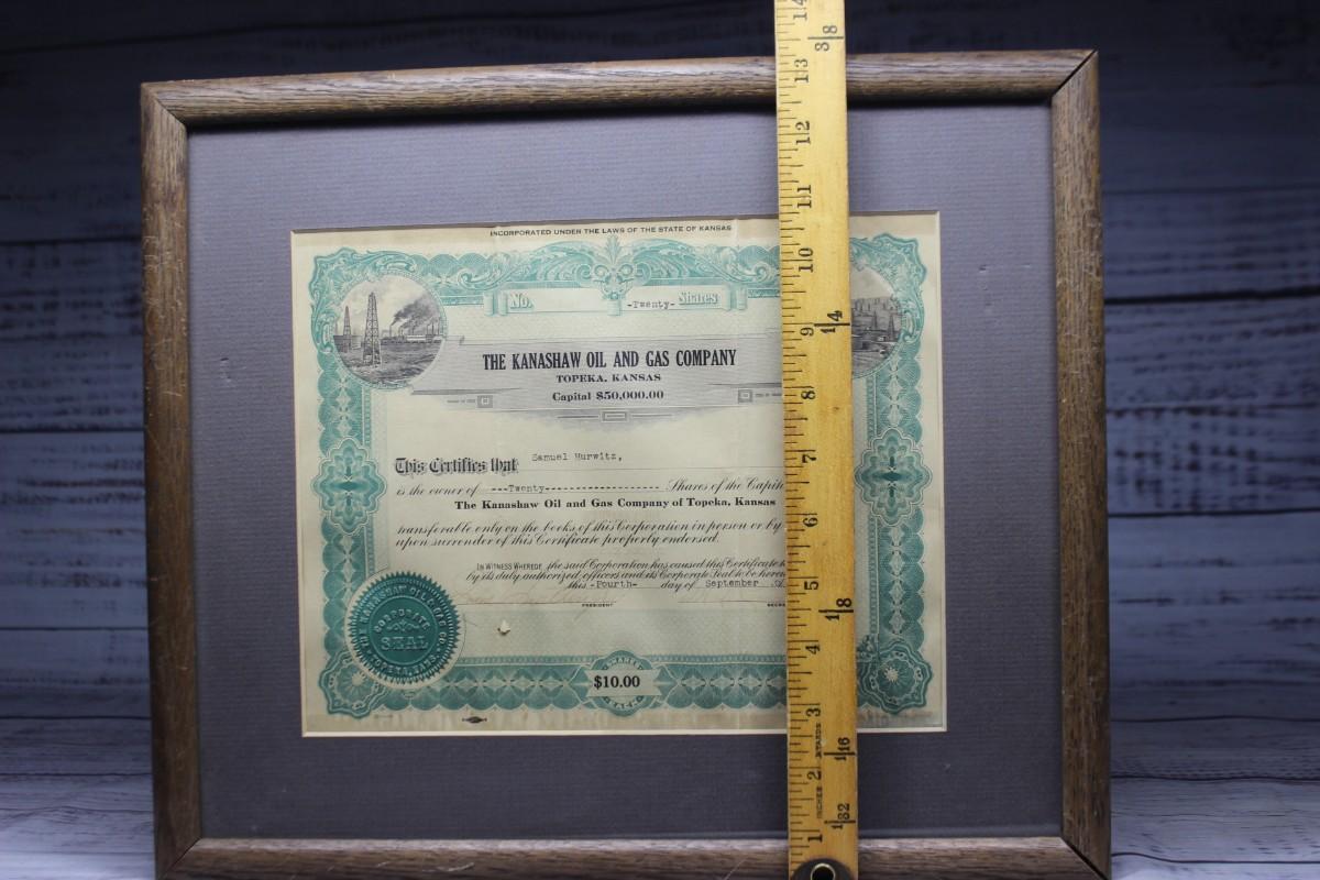 Vintage Framed Certificate of Shares for The Kanashaw Oil & Gas Company of Kansas, there is no significant damage to the frame or the protective glass and is in good displayable condition. Check pictures for more details and for sizing.
