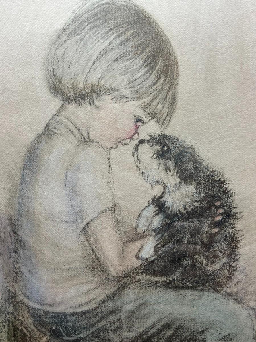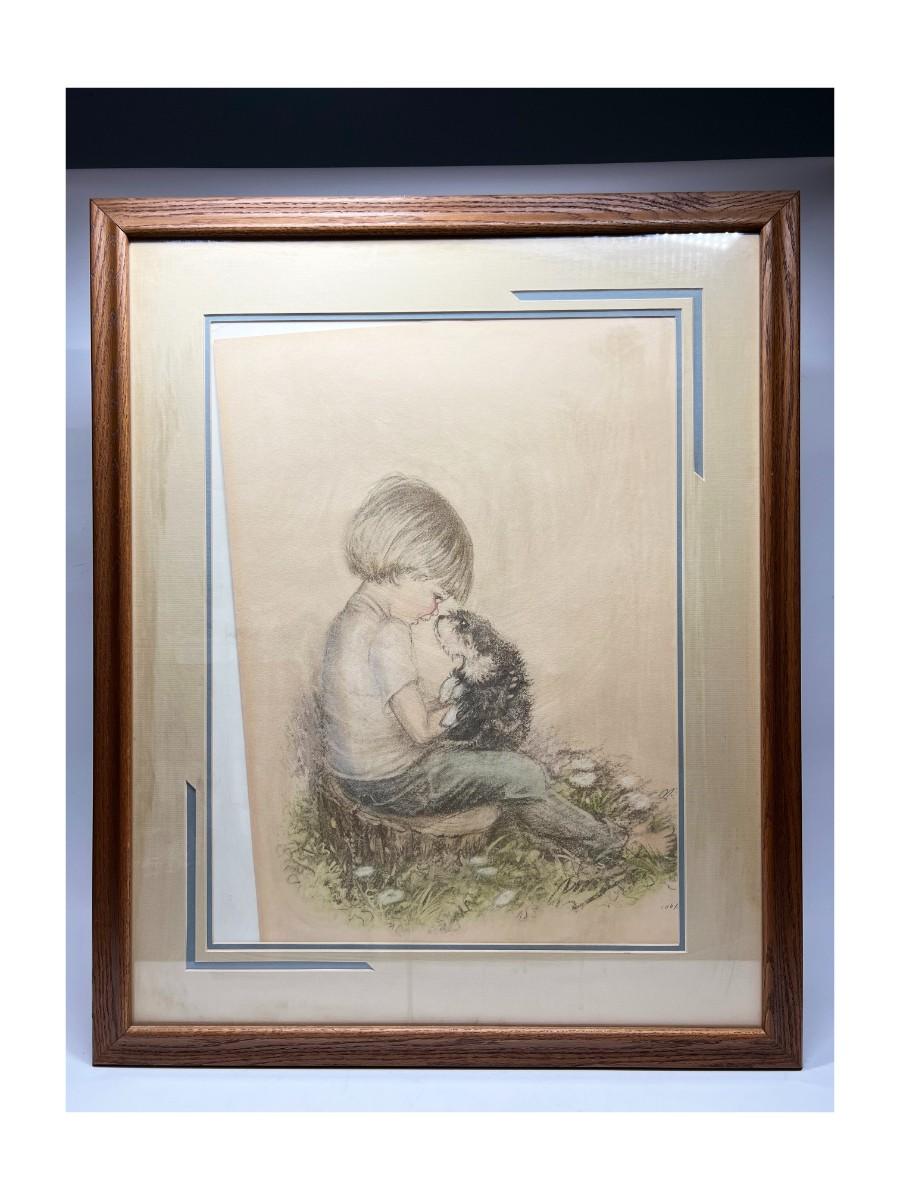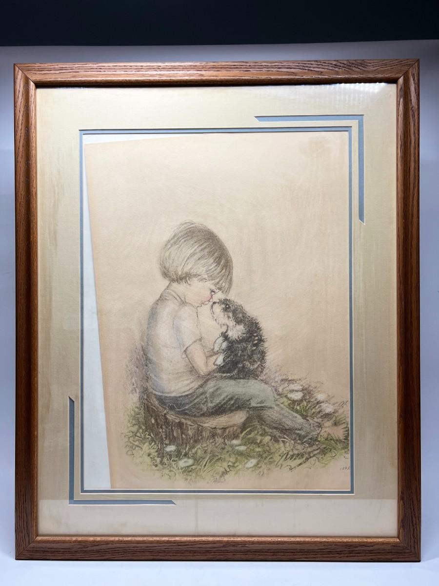 Boy and his Dog Numbered Print by Marilyn Zapp Vintage Framed Charcoal Pastel Print