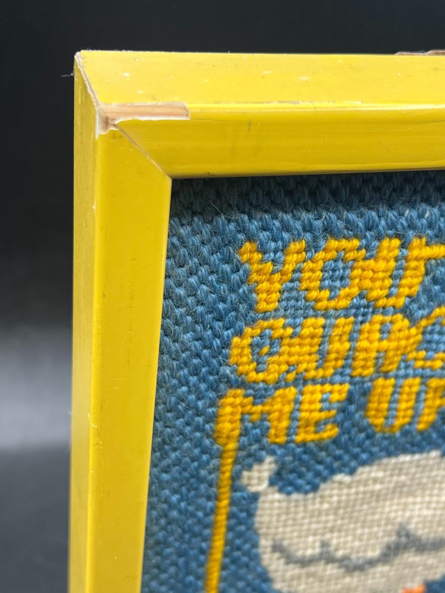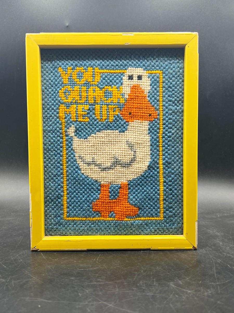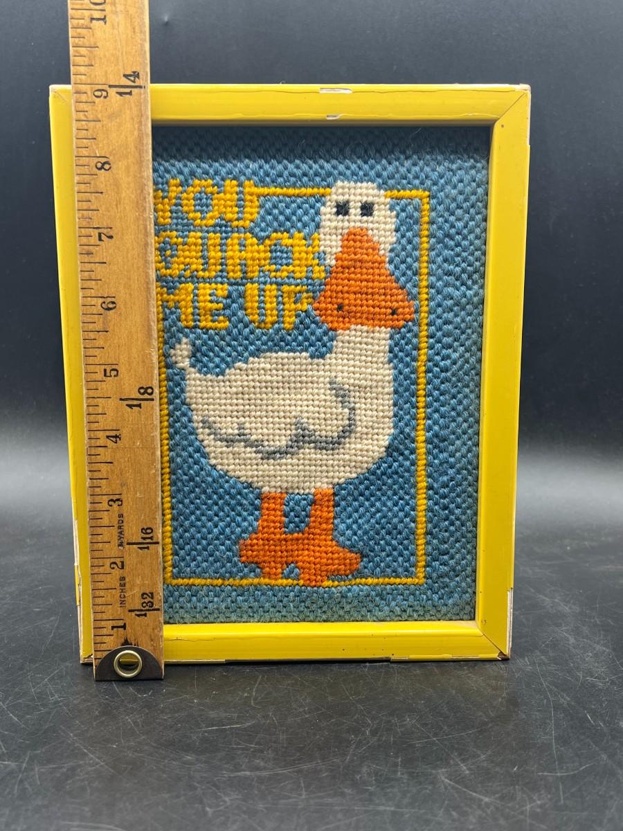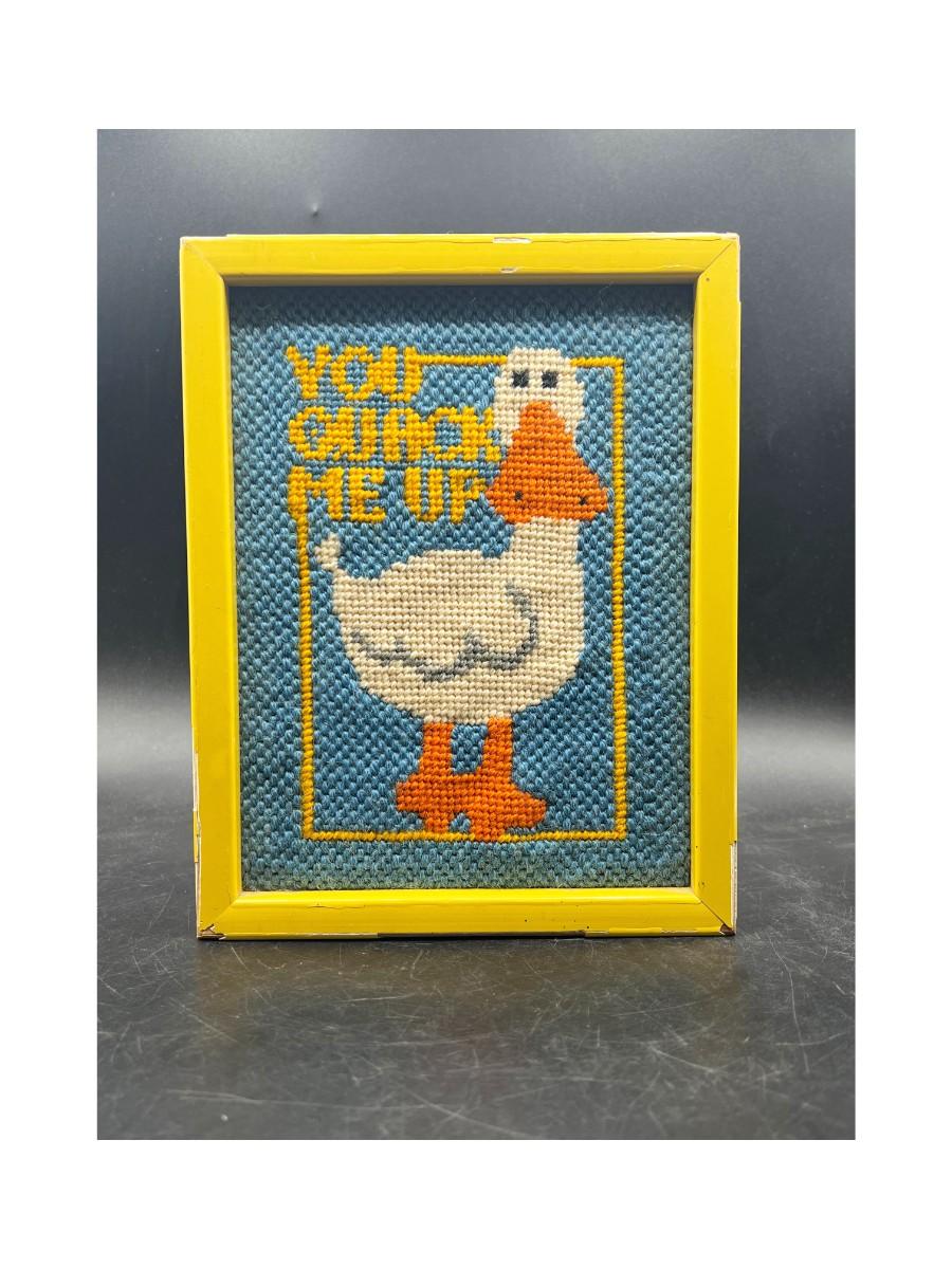 Vintage Framed Cross Stitched Home Decor Art You Quack Me Up, there is some chipping to the frame, but there is no significant damage and is in overall good displayable condition. Check pictures for more details and for sizing.