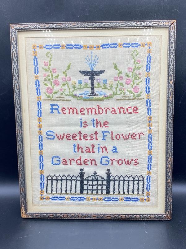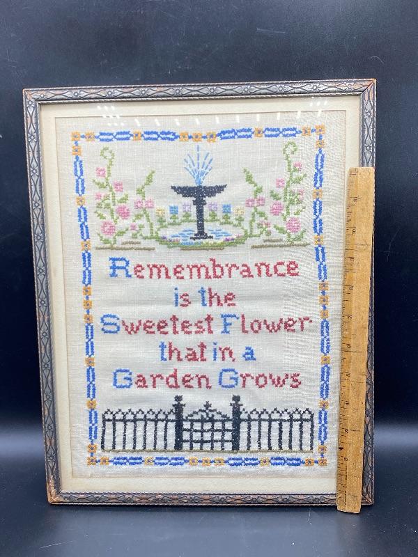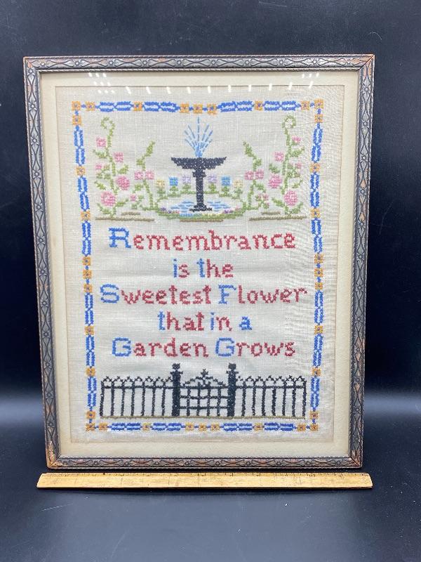 Vintage framed tea towel art. Great cross stitched work. Measures roughly 12"x15". Frame has signs of age.