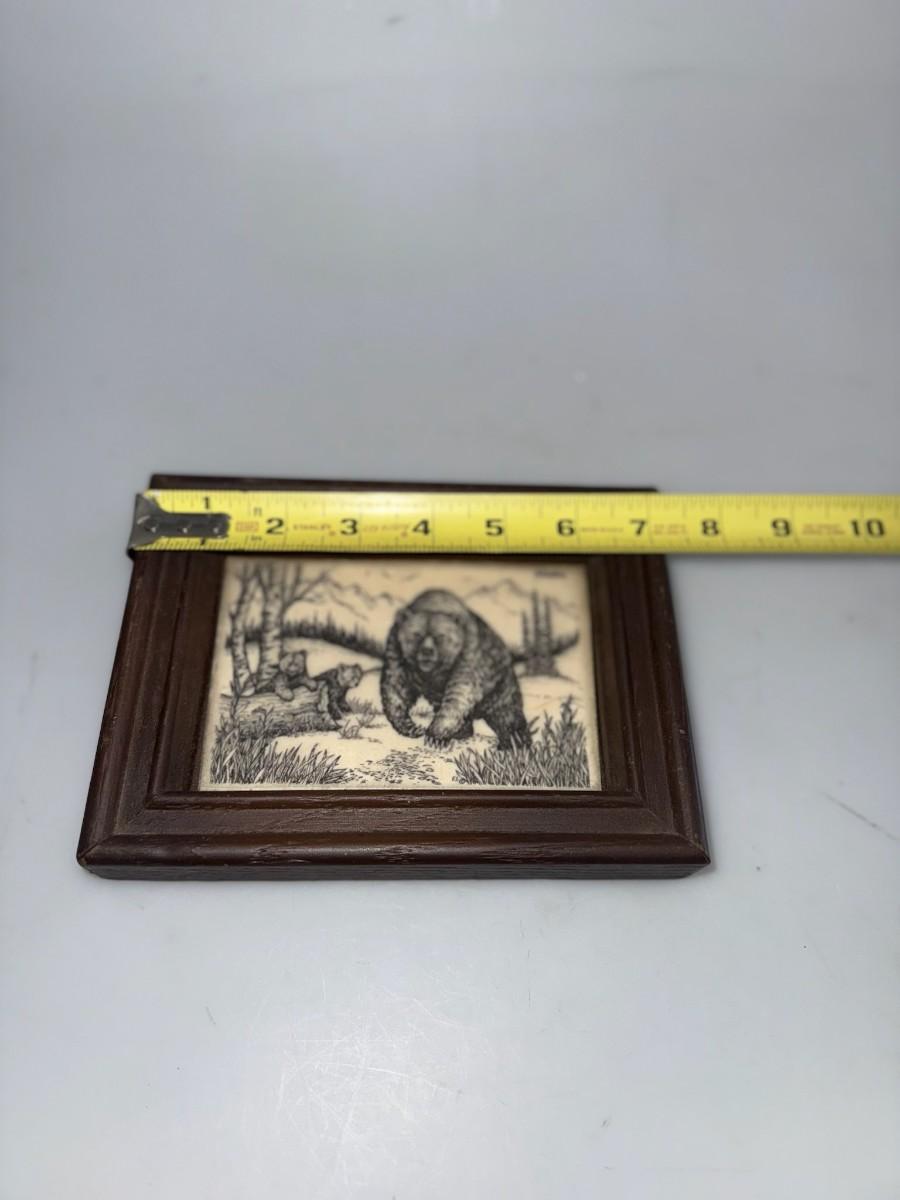 Vintage Framed Grizzly Bear Etching on Tile Art Circa