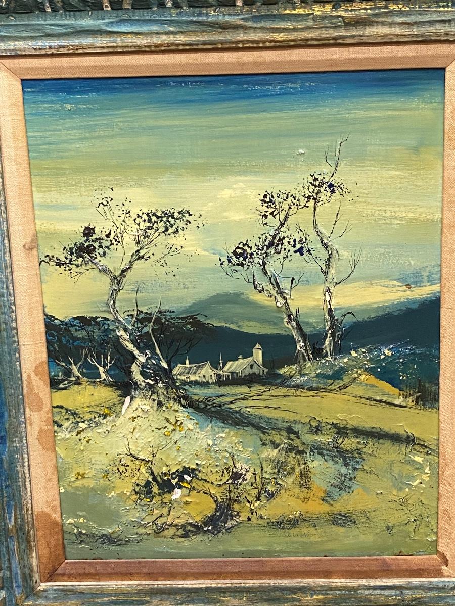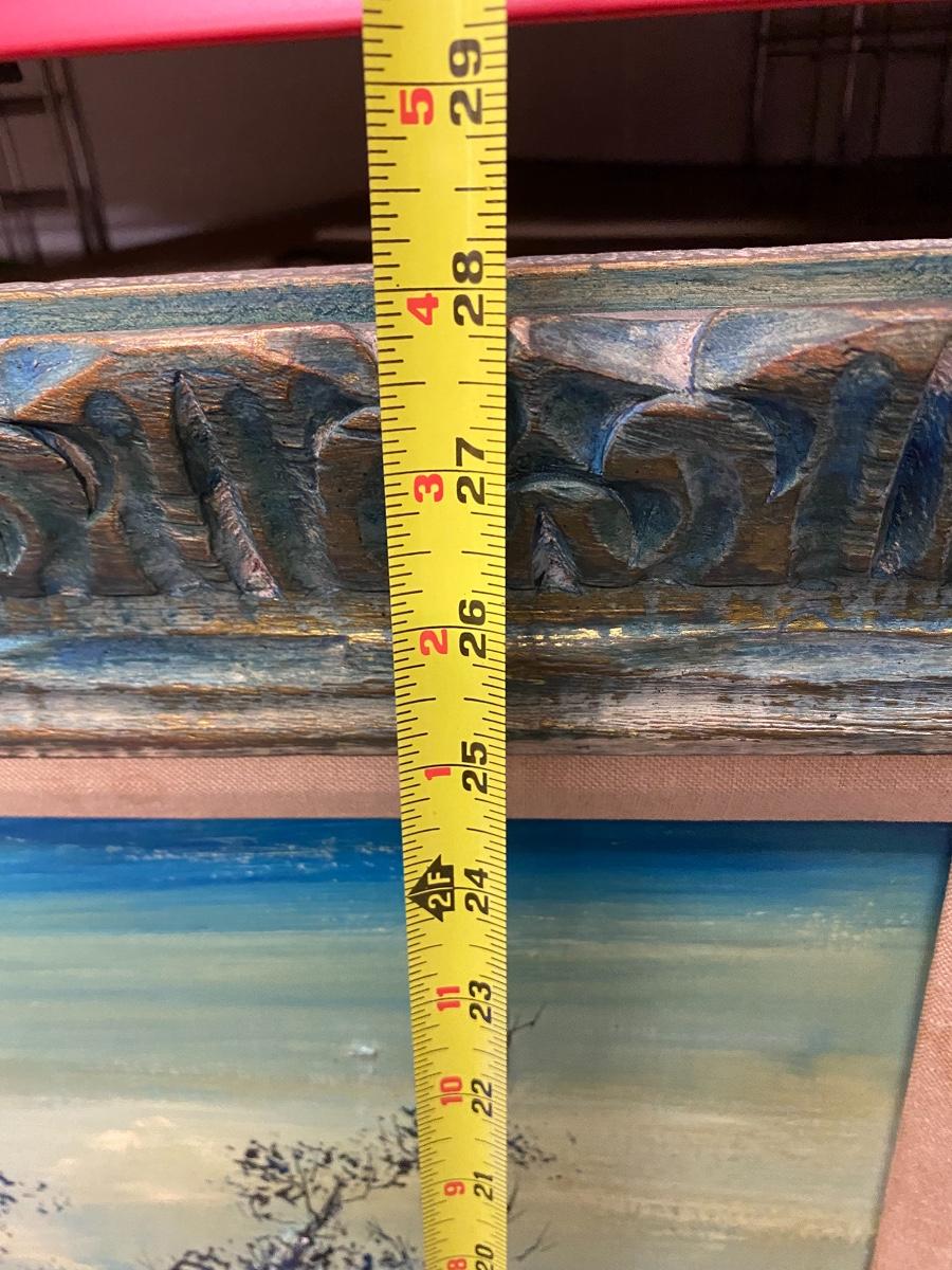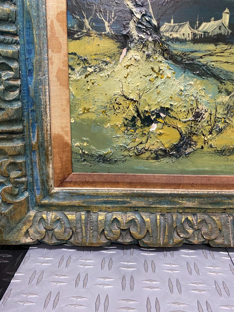 Vintage landscape painting. Nice wood frame. Painting is in shades of blue, green, and yellow. Paint has cracked in places and chipped off in one spot but still displays nicely. About 24"x28"