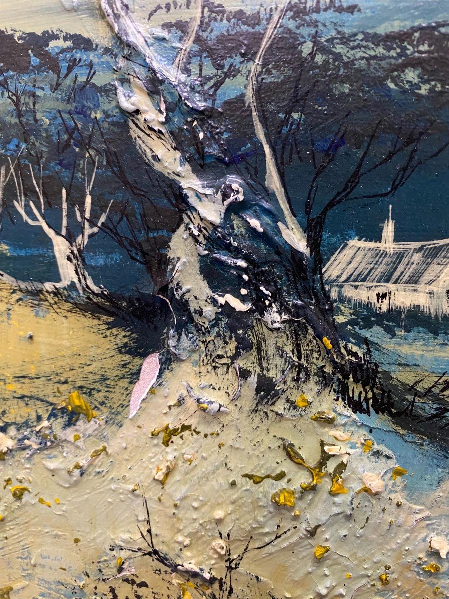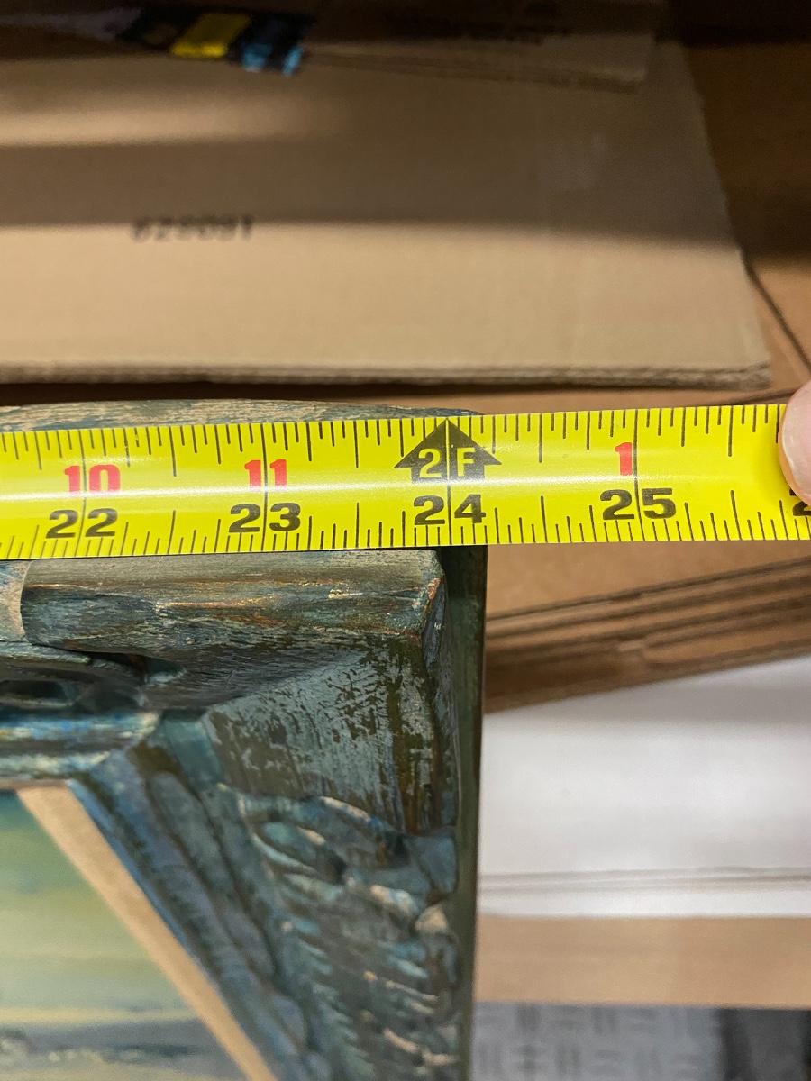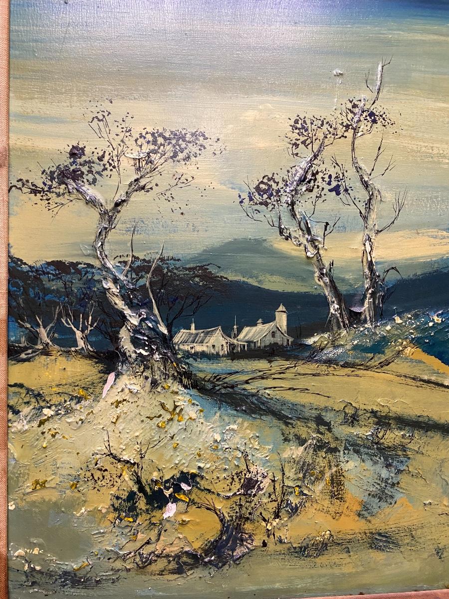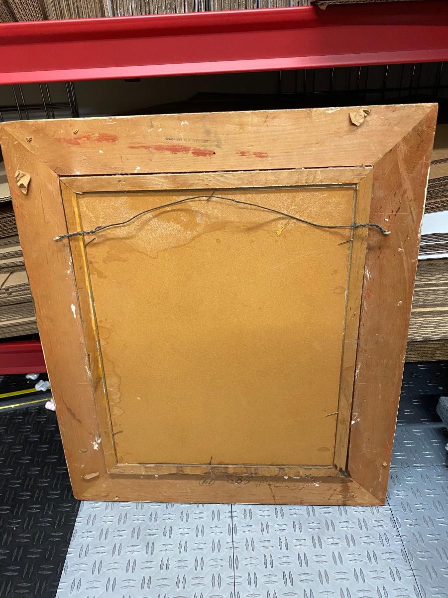 Vintage landscape painting. Nice wood frame. Painting is in shades of blue, green, and yellow. Paint has cracked in places and chipped off in one spot but still displays nicely. About 24"x28"