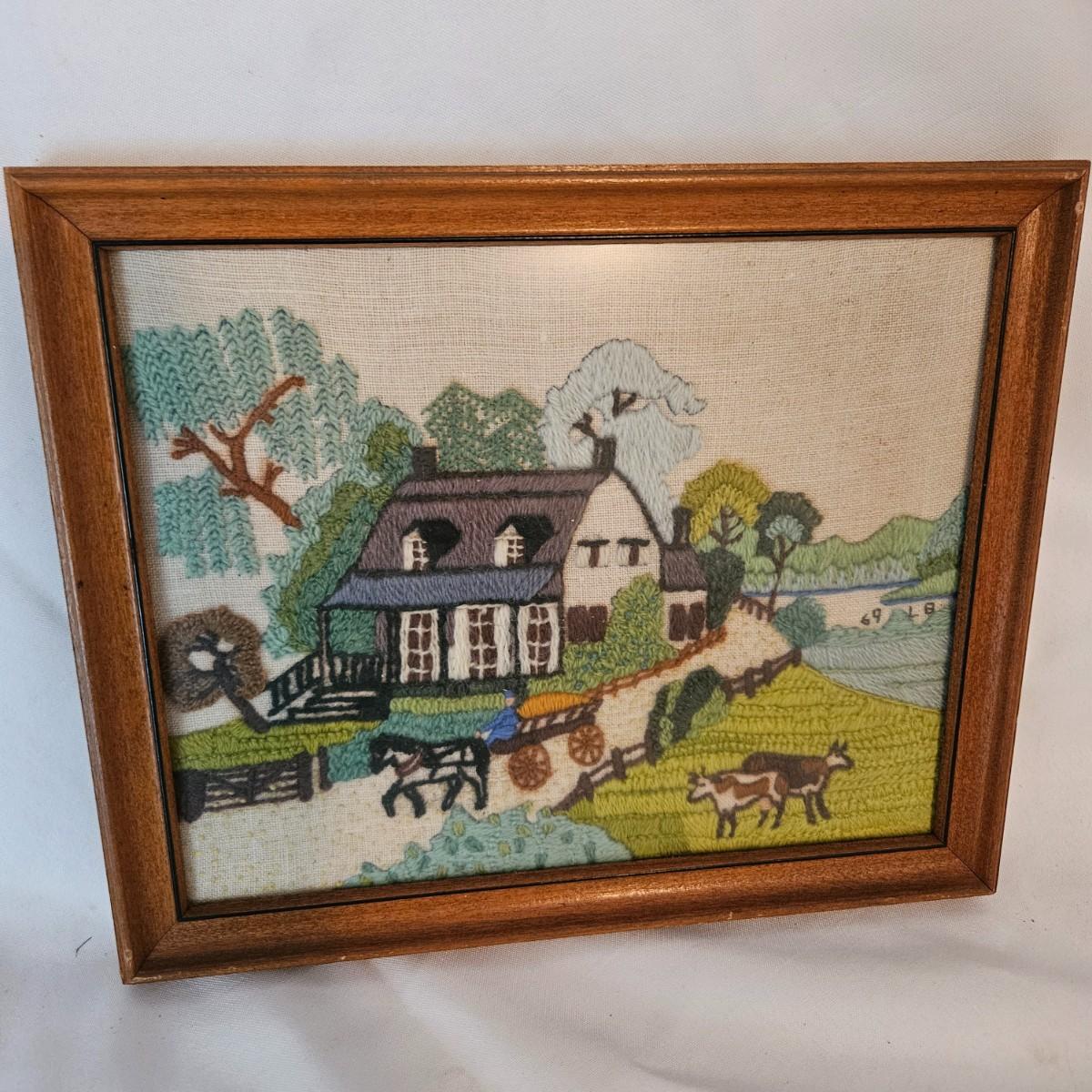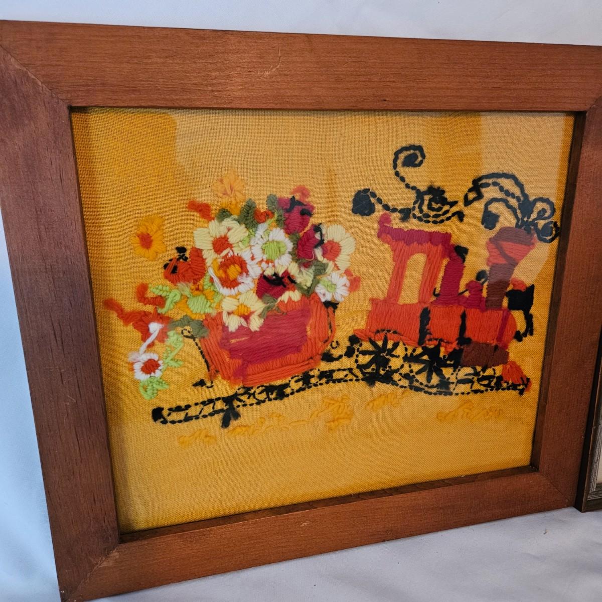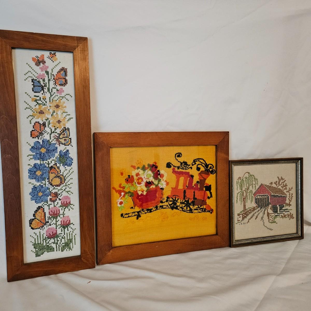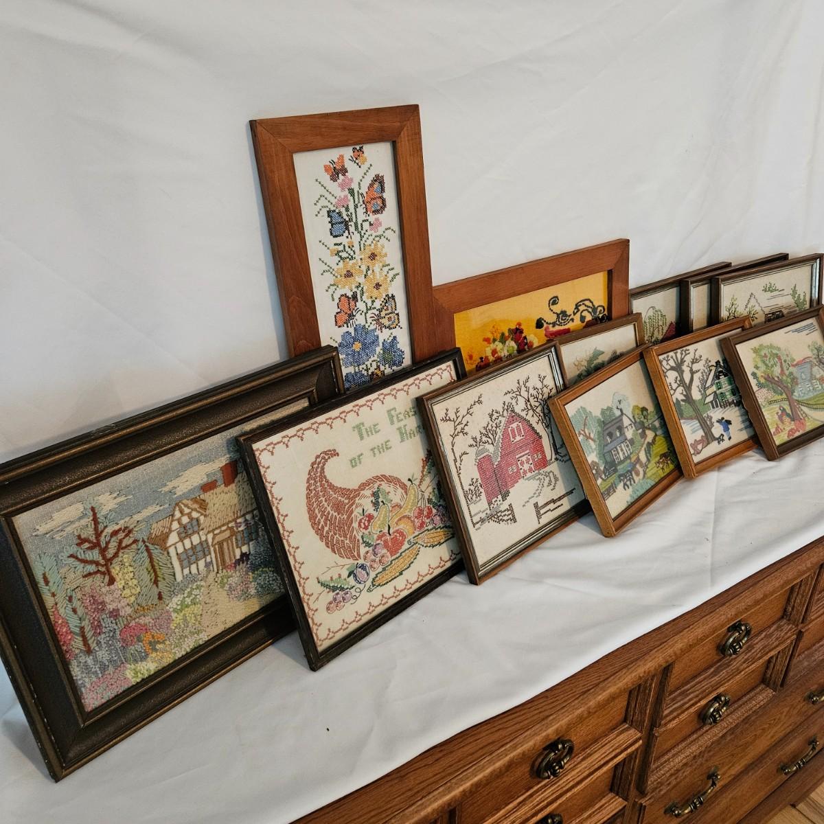 An assortment of 11 vintage fiber art pieces including cross stich, needle point, crewel and more. In wooden frames and some under glass. The train piece measures approximately 16.5" x 14.5"H. Local pickup only