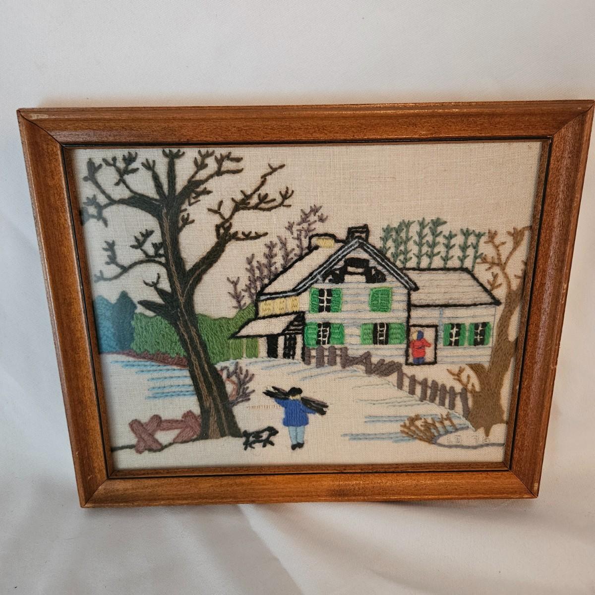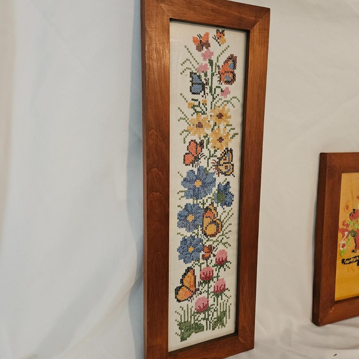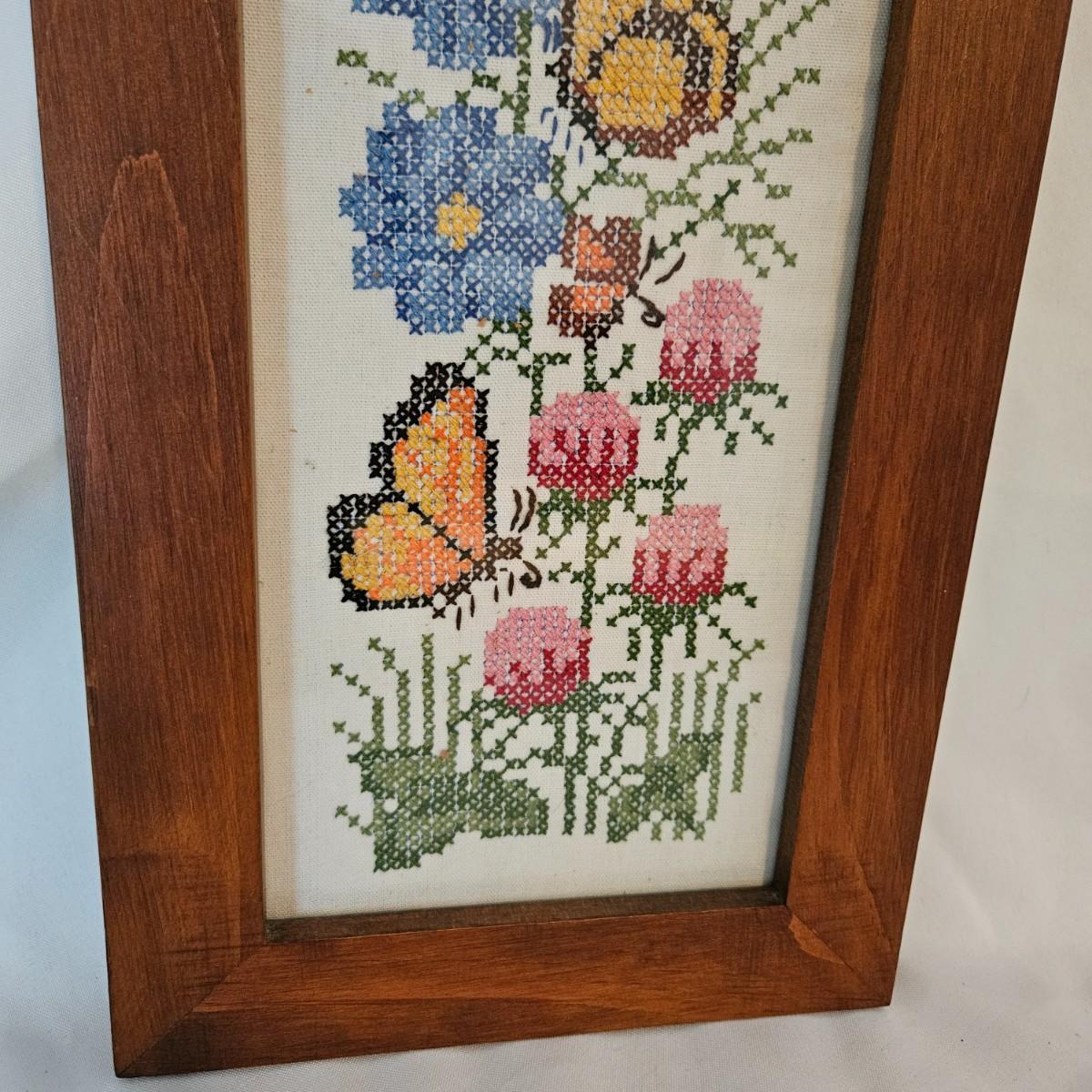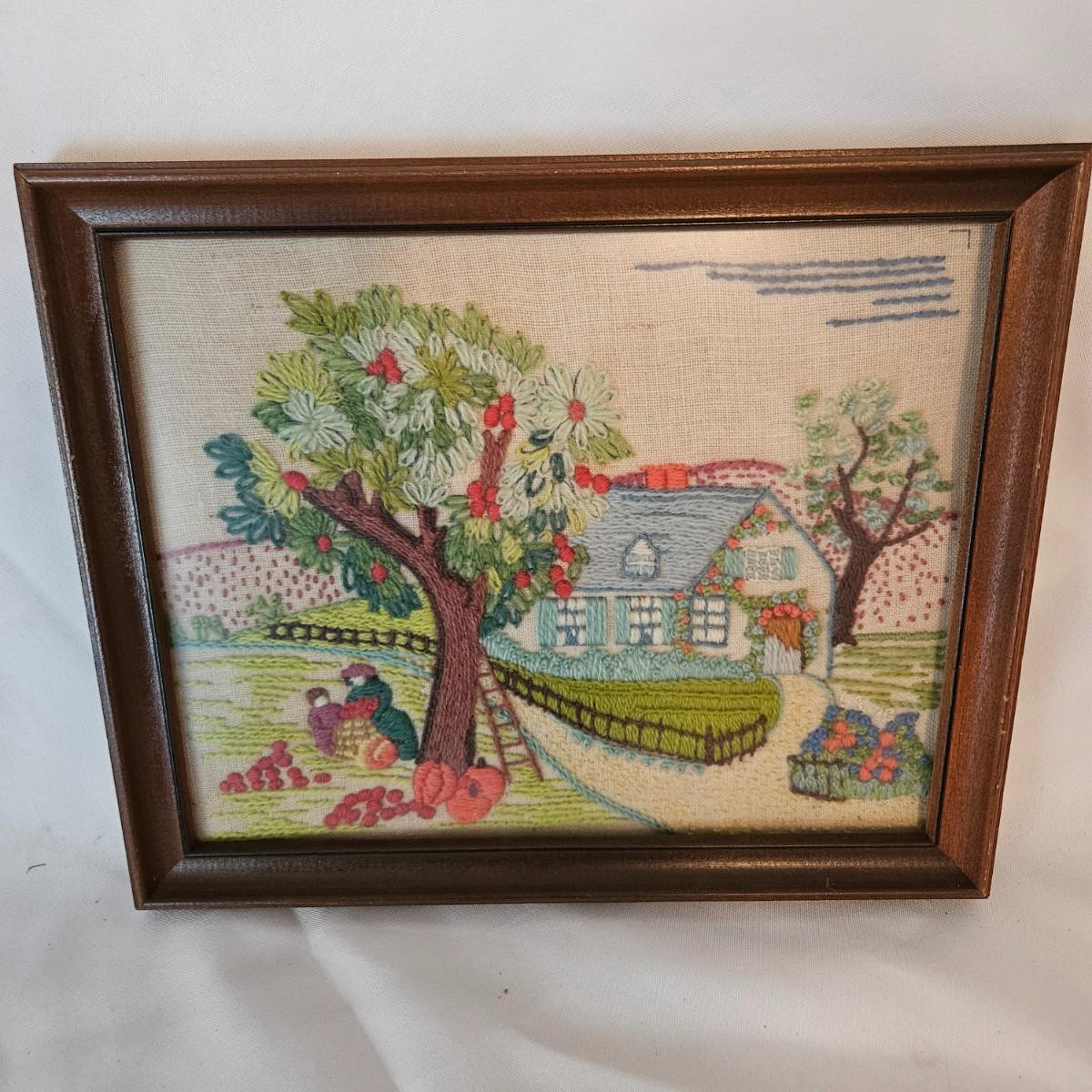 An assortment of 11 vintage fiber art pieces including cross stich, needle point, crewel and more. In wooden frames and some under glass. The train piece measures approximately 16.5" x 14.5"H. Local pickup only