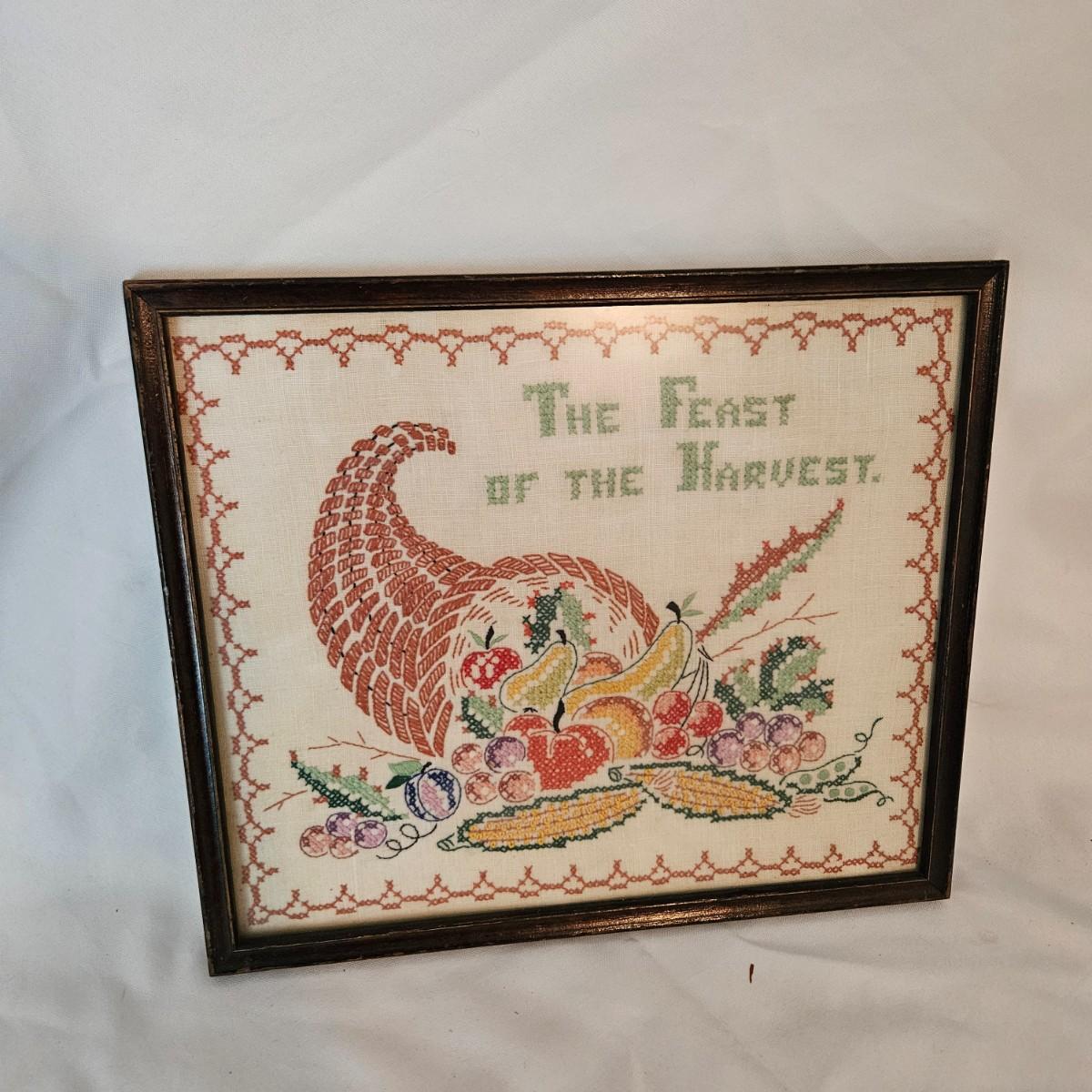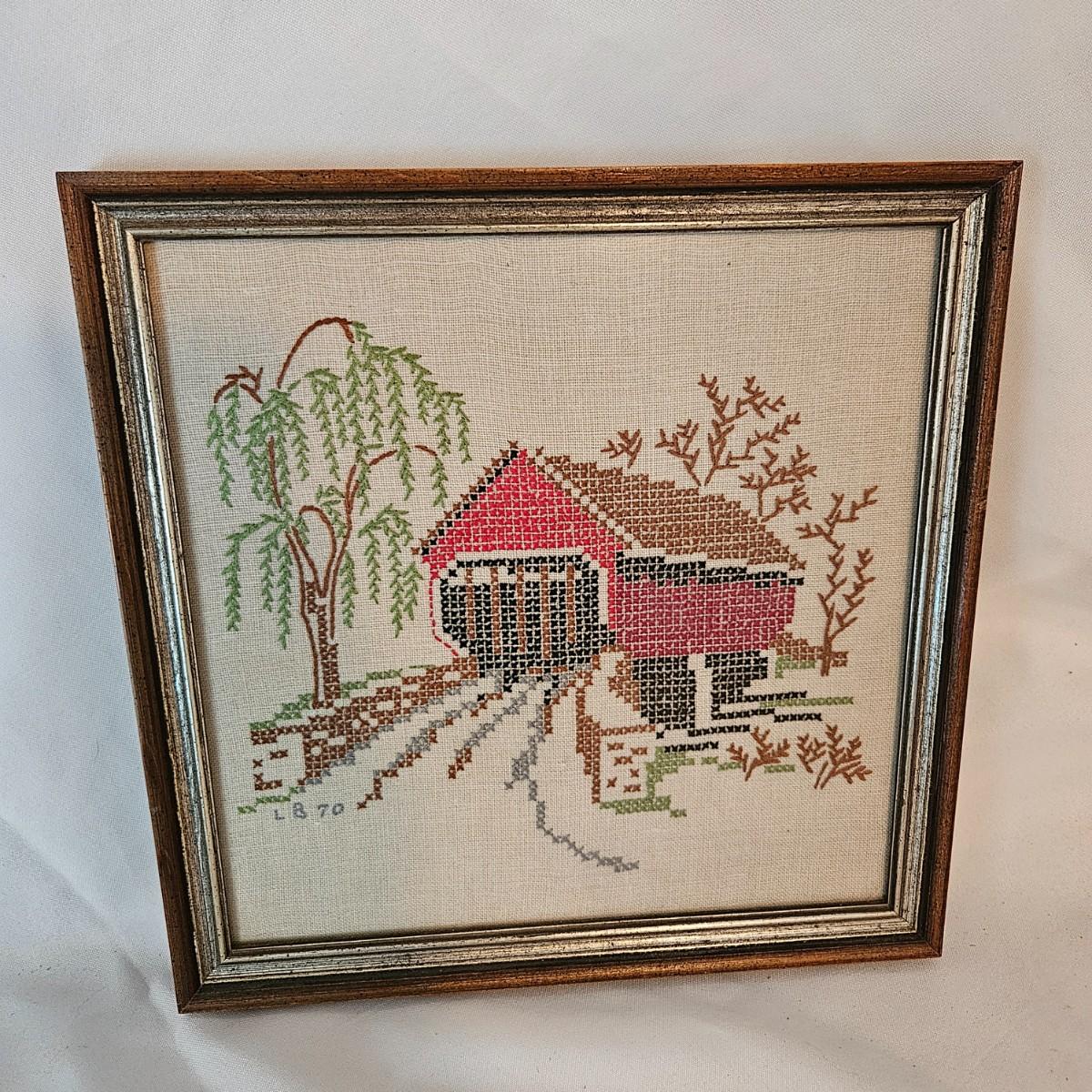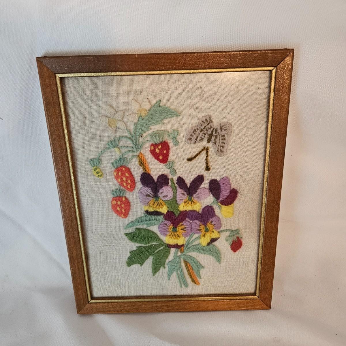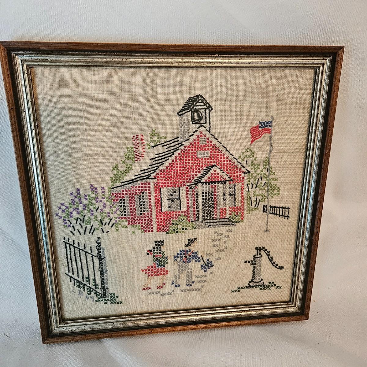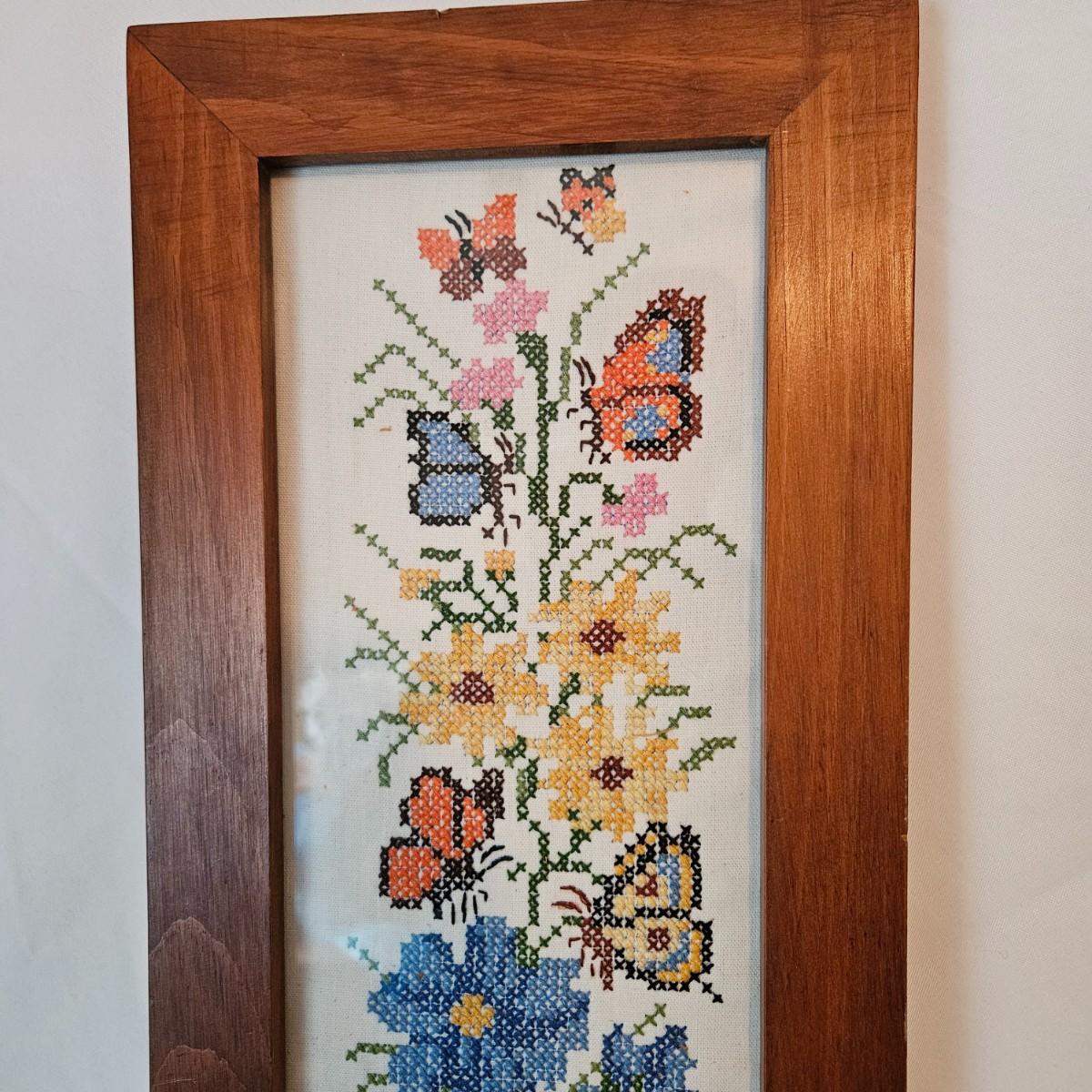 An assortment of 11 vintage fiber art pieces including cross stich, needle point, crewel and more. In wooden frames and some under glass. The train piece measures approximately 16.5" x 14.5"H. Local pickup only
