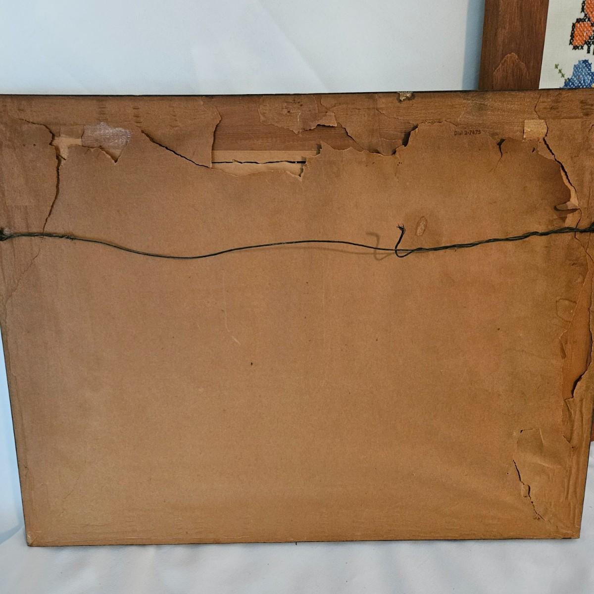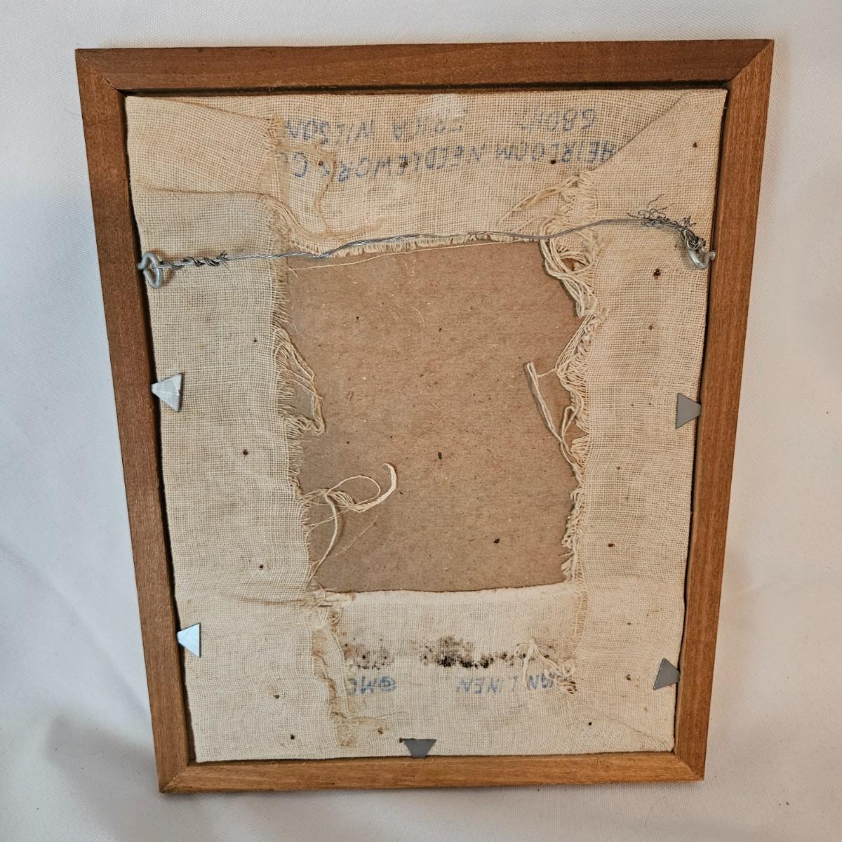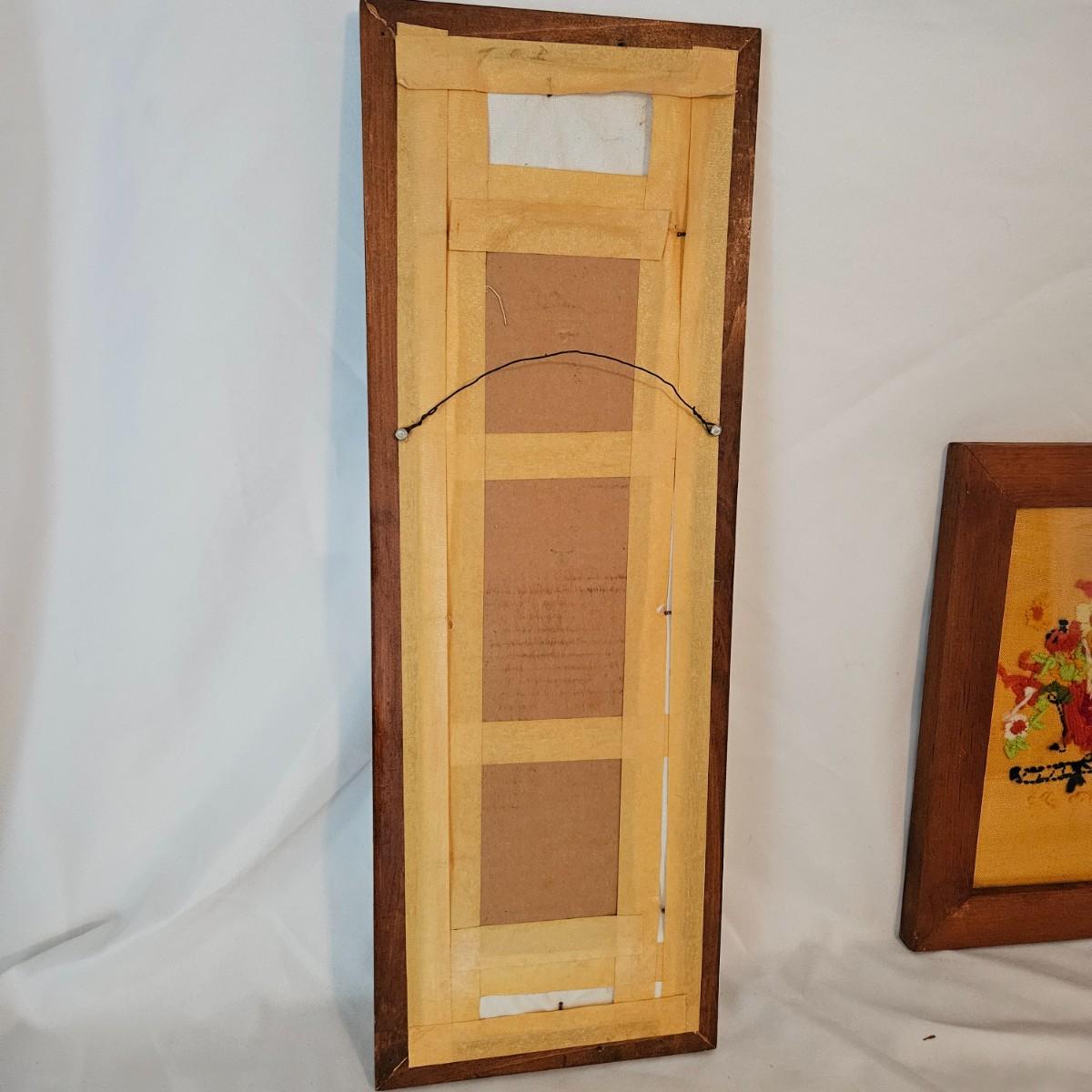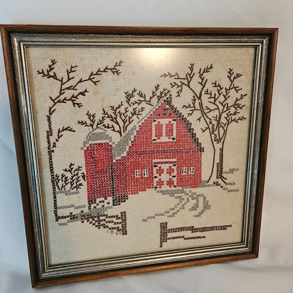 An assortment of 11 vintage fiber art pieces including cross stich, needle point, crewel and more. In wooden frames and some under glass. The train piece measures approximately 16.5" x 14.5"H. Local pickup only