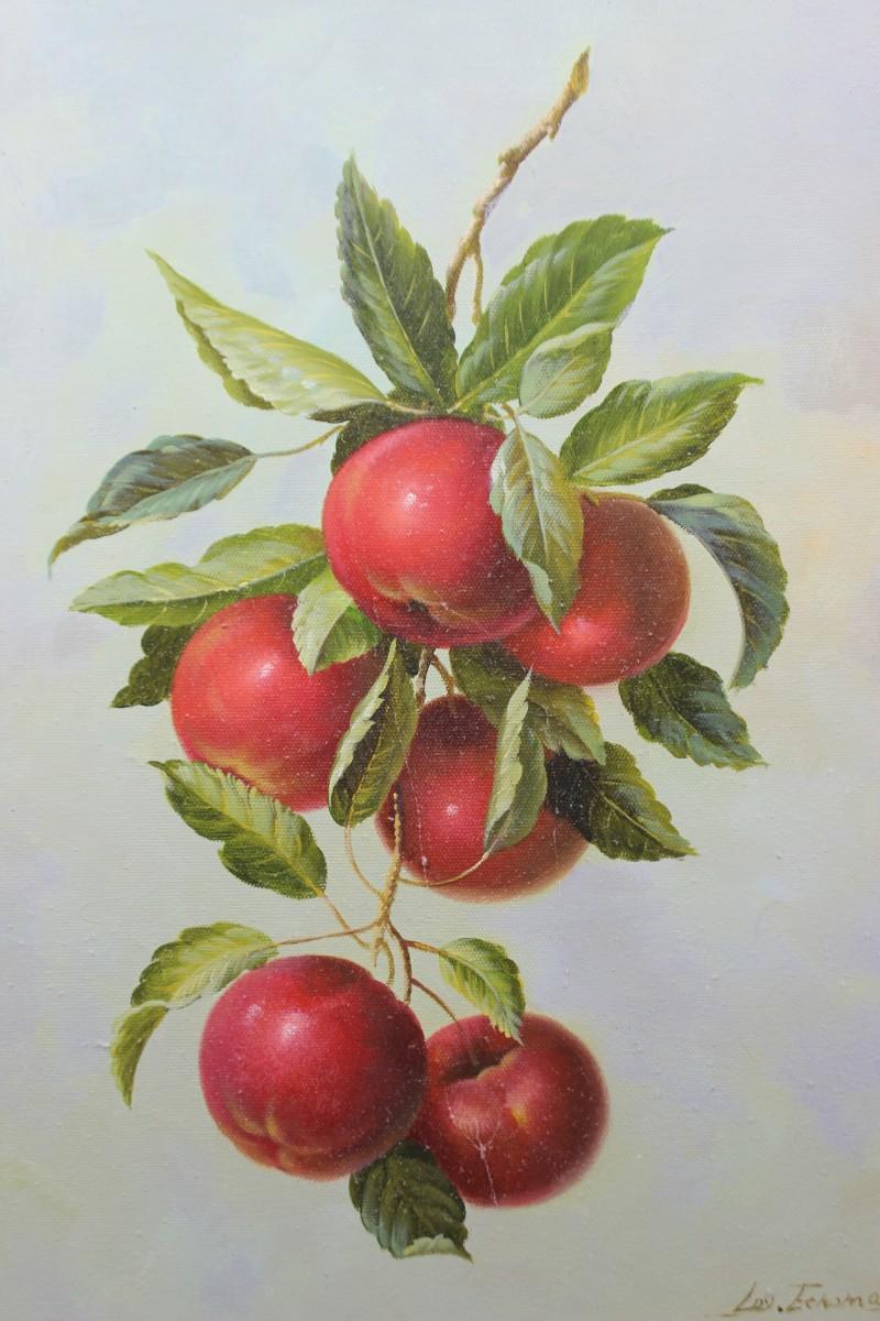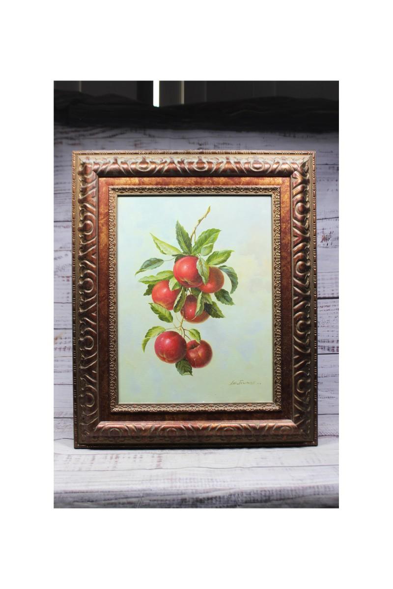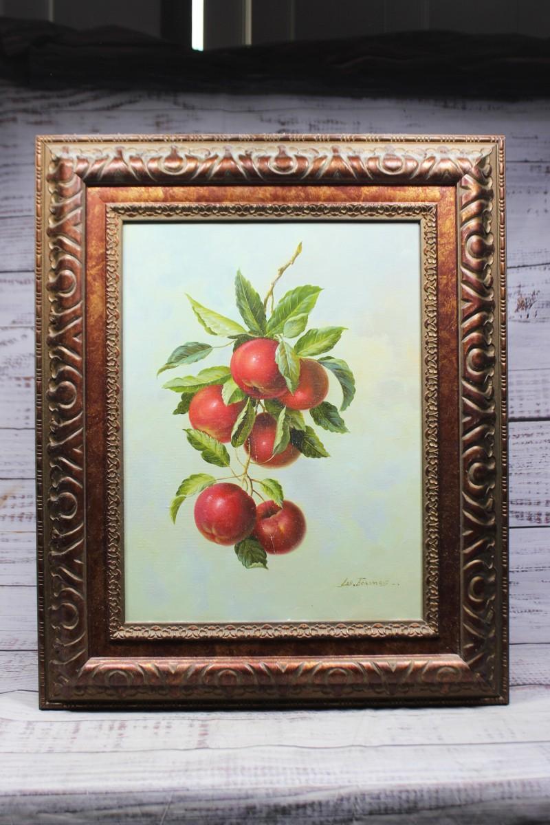 Vintage Framed Oil Painting of Floating Red Apples on Stem