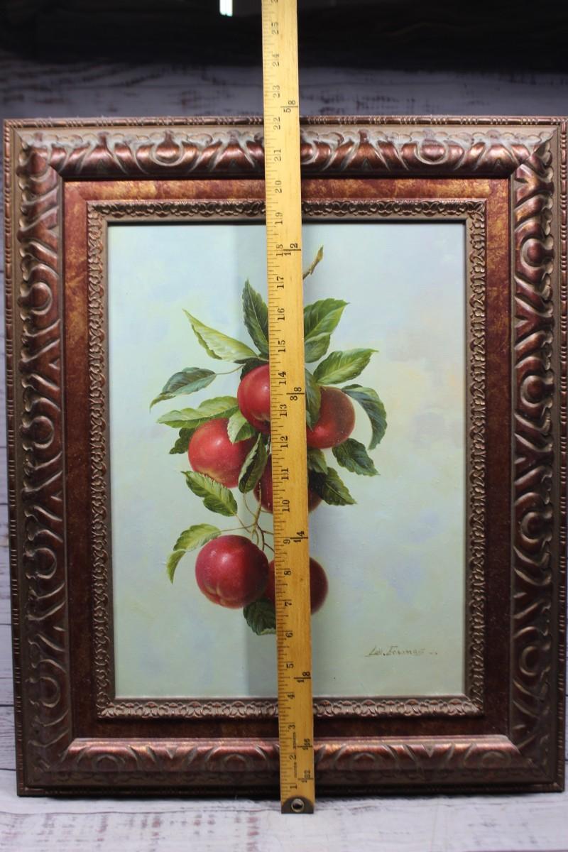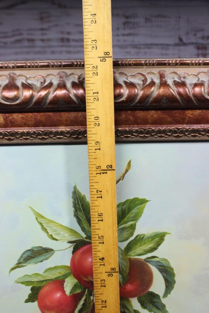Vintage Framed Oil Painting of Floating Red Apples on Stem, there is no significant damage to the frame or the canvas and is in good vintage condition. Check pictures for more details and for sizing.