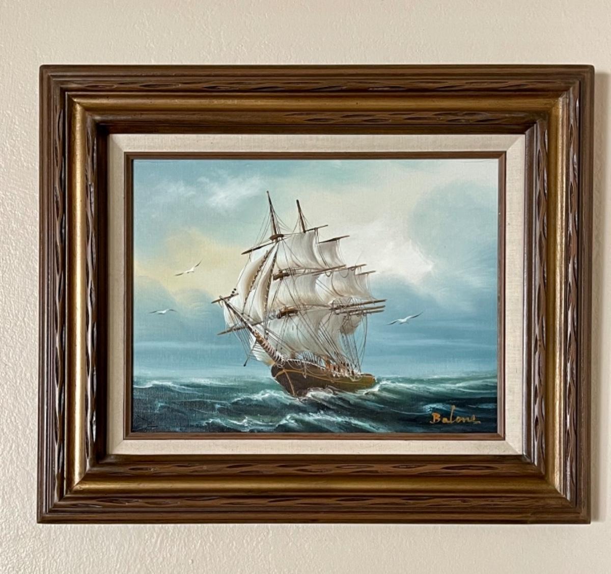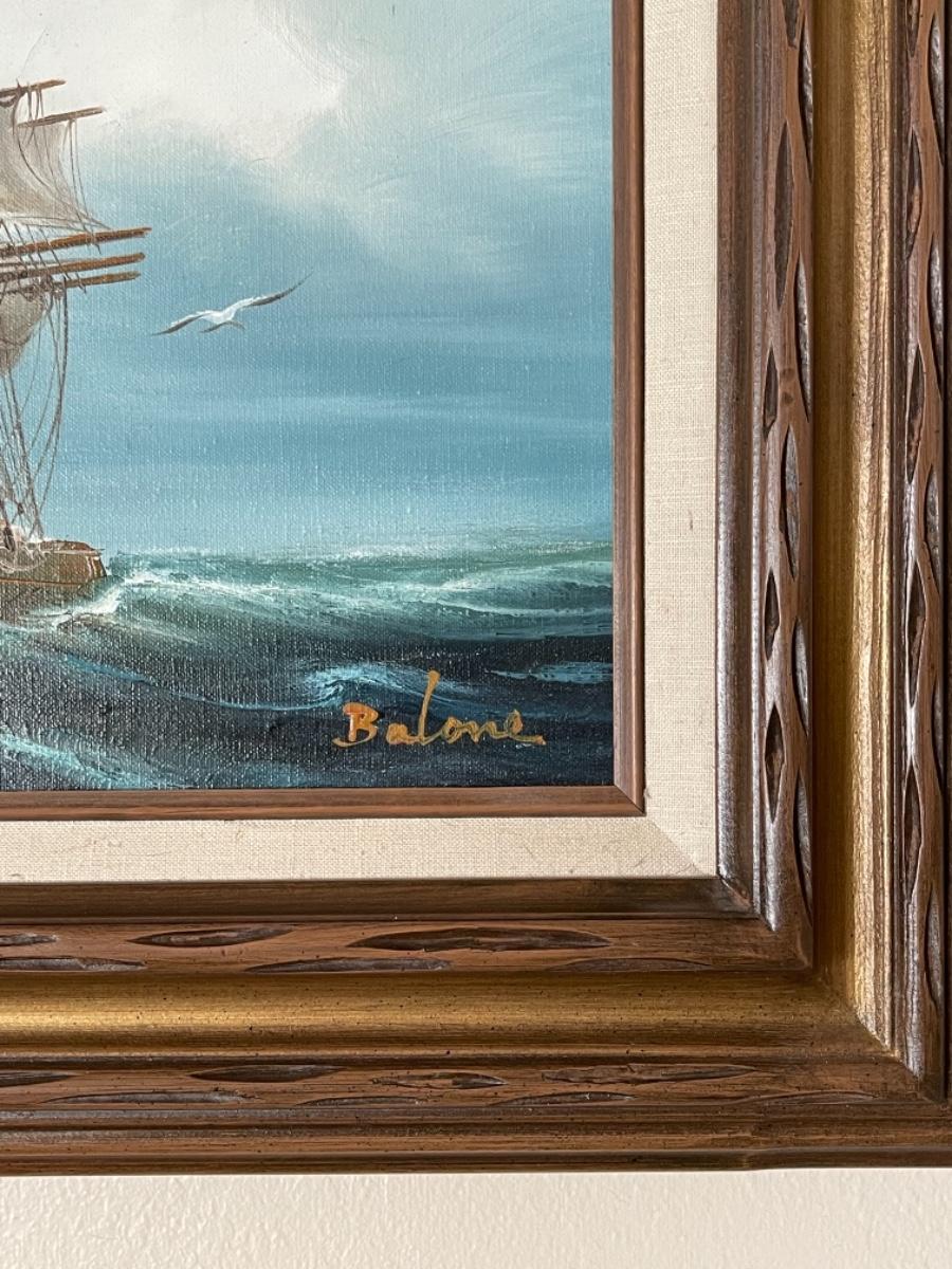 1960s, Oil on canvas of a majestic Clipper Ship sailing the ocean in this original, mid-century nautical seascape. Beautifully framed in a classic 1960s solid wood frame and signed by artist, Balone. Outside of frame measures 23 1/2” x 20.” - shipping available.