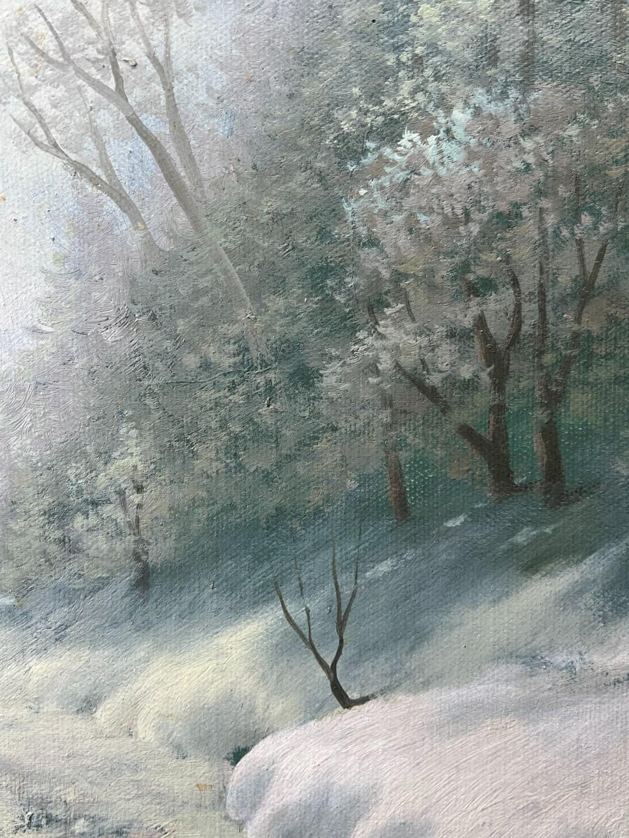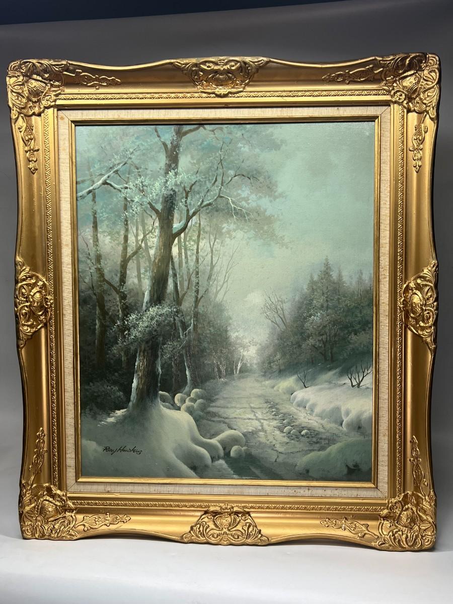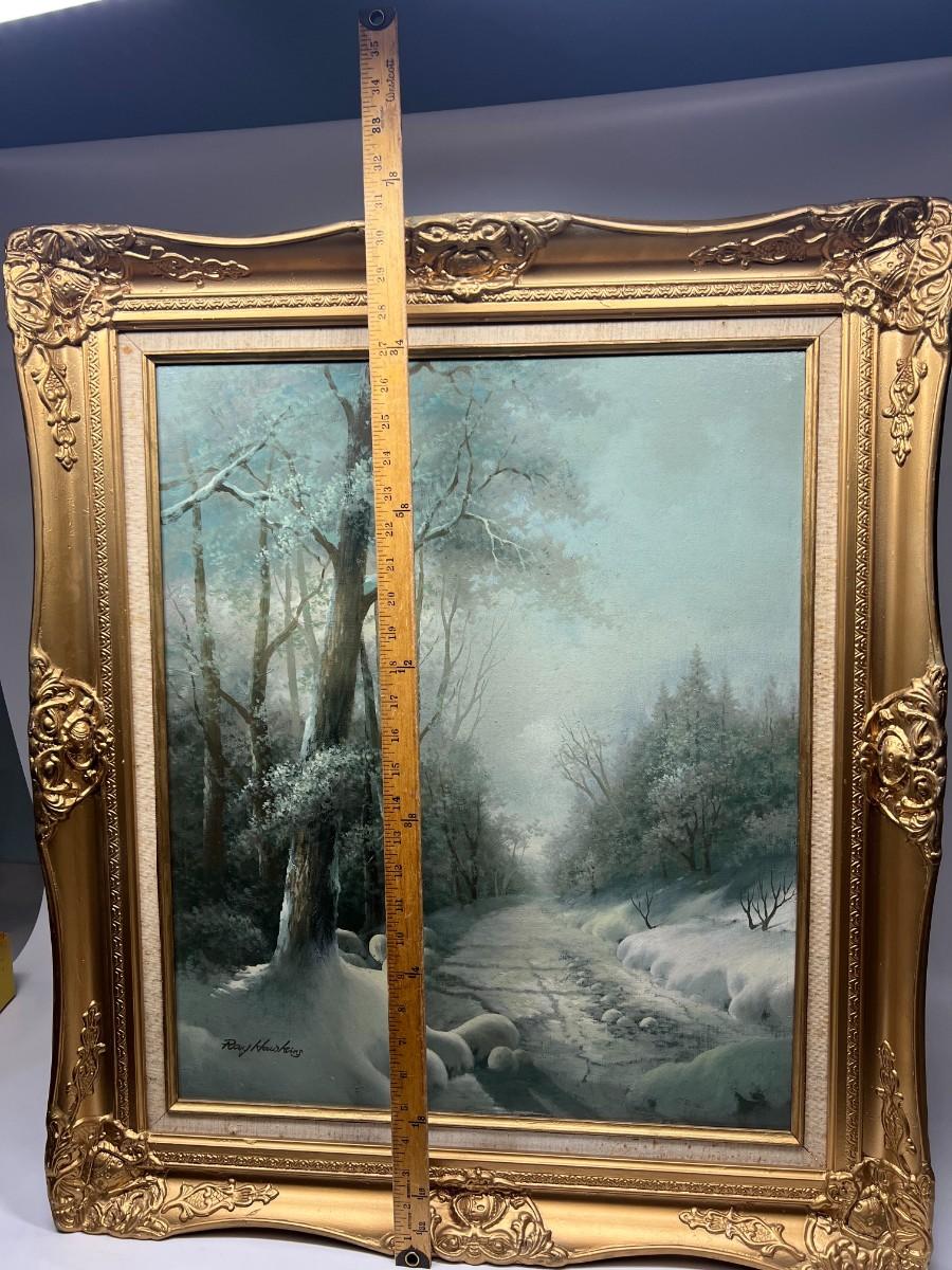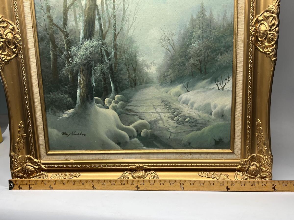 Vintage Framed Original Oil Painting Desolate Winter Snow Forest Artist Ray Hawkins