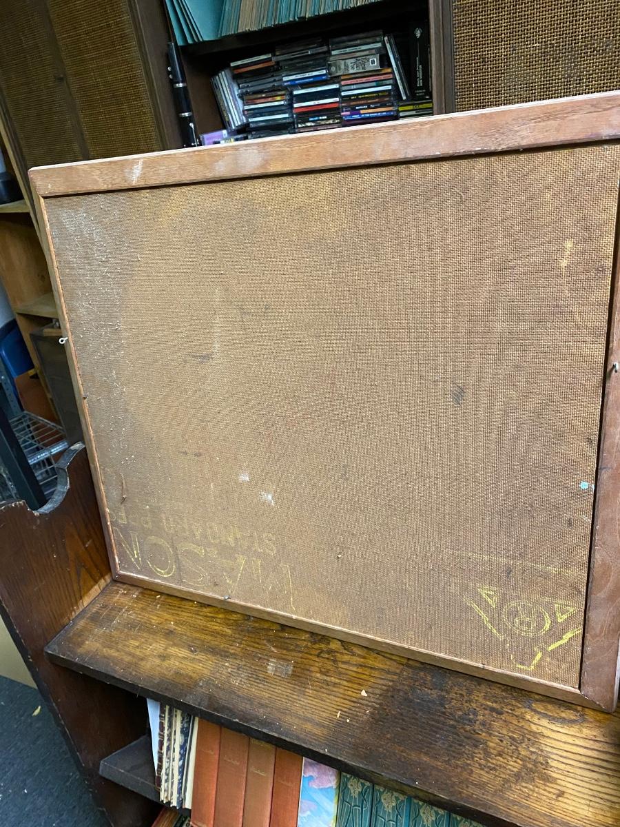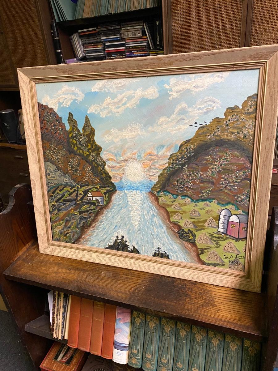 Vintage framed pairing on board, folk art valley scene with silo, signed by artist. Painting is a little loose from frame Lud A. Lotter 1963