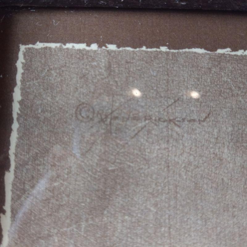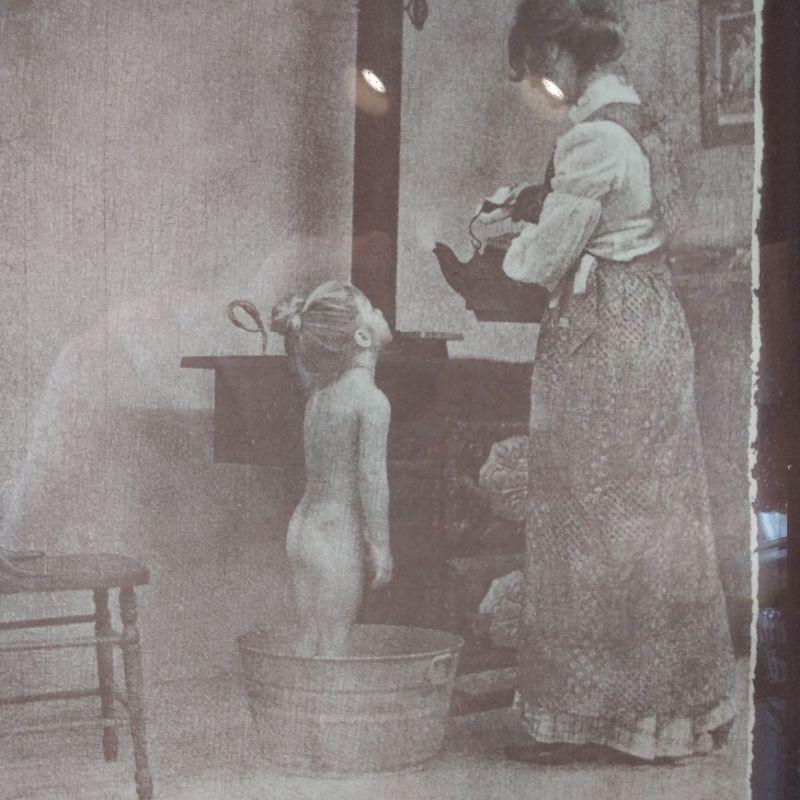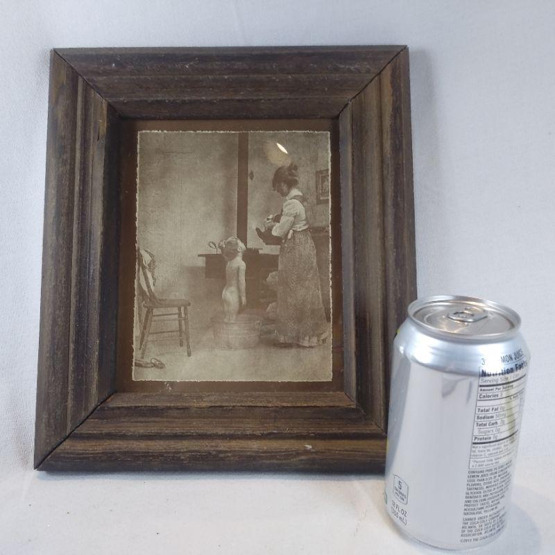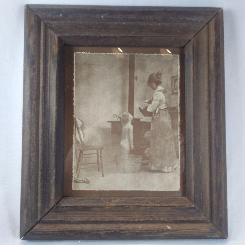 Photo of a little girl ready for a warm bath. Has a copyright signed at top by corner but we cannot read it. Rustic frame measures 9 1/2-inches wide x 11-inches tall. Ready to hang in child's bath or bedroom.
