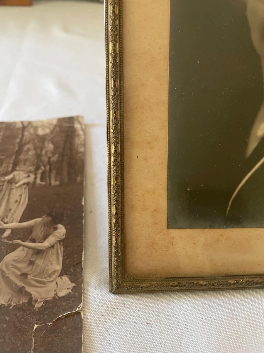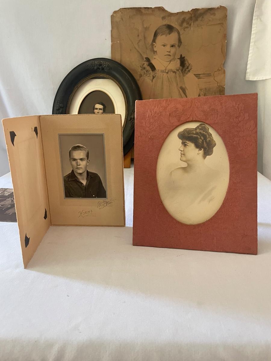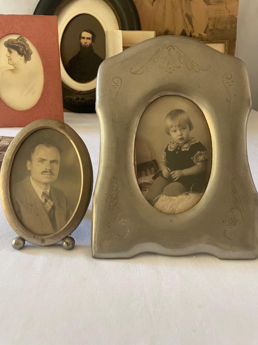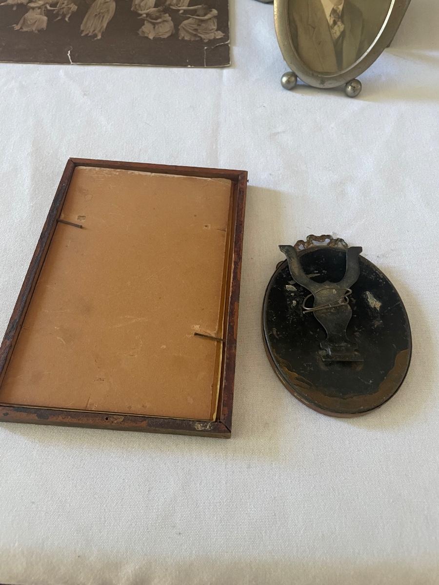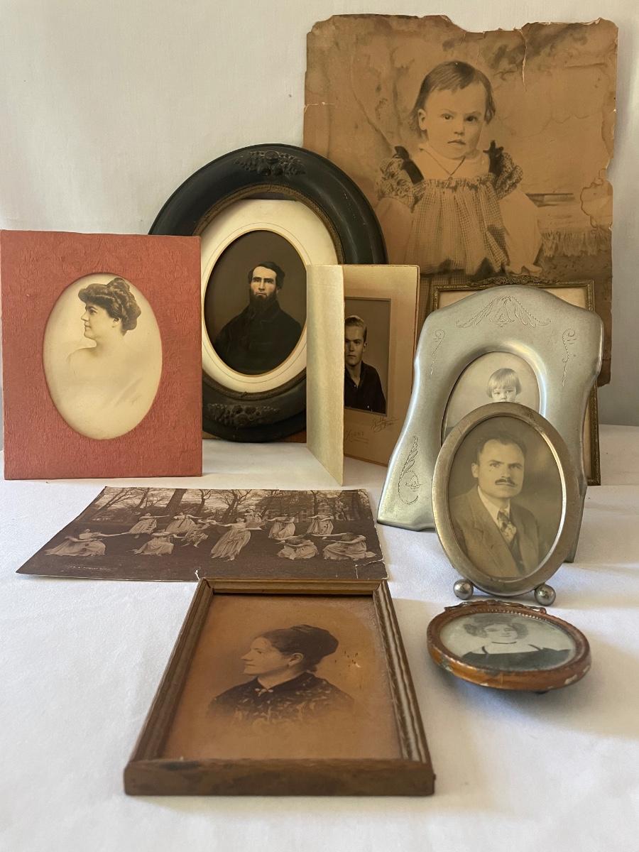 10 vintage photographs, all but the largest one are framed and this photo appears to be the oldest and measures 14.5” x 19” (it does have some water damage and is torn, see images). Metal frames may be silver or pewter but no markings visible.