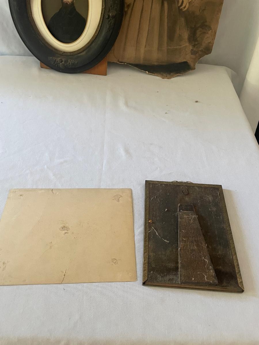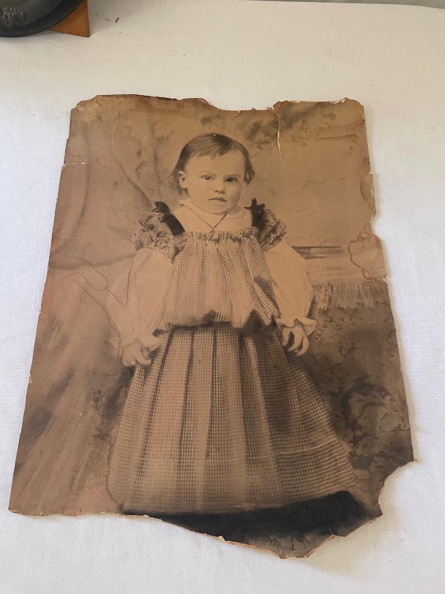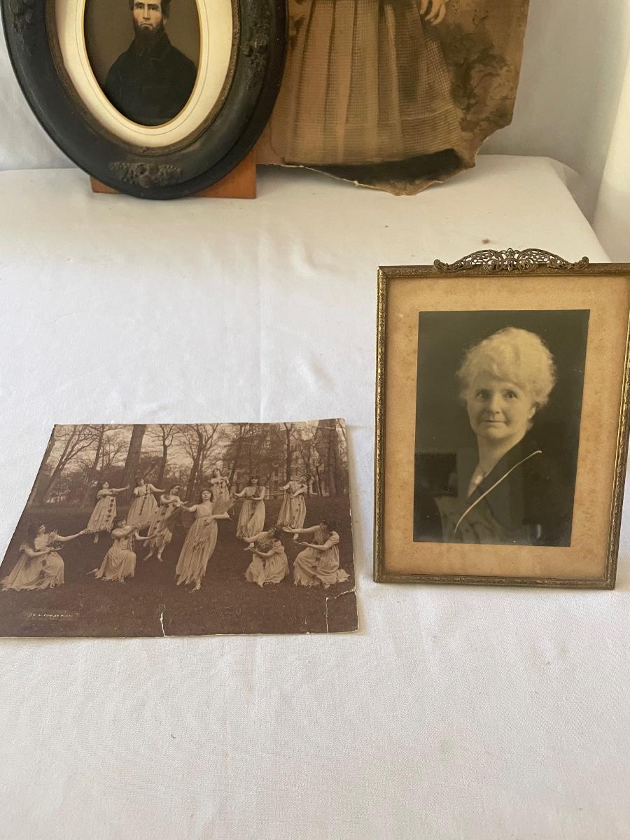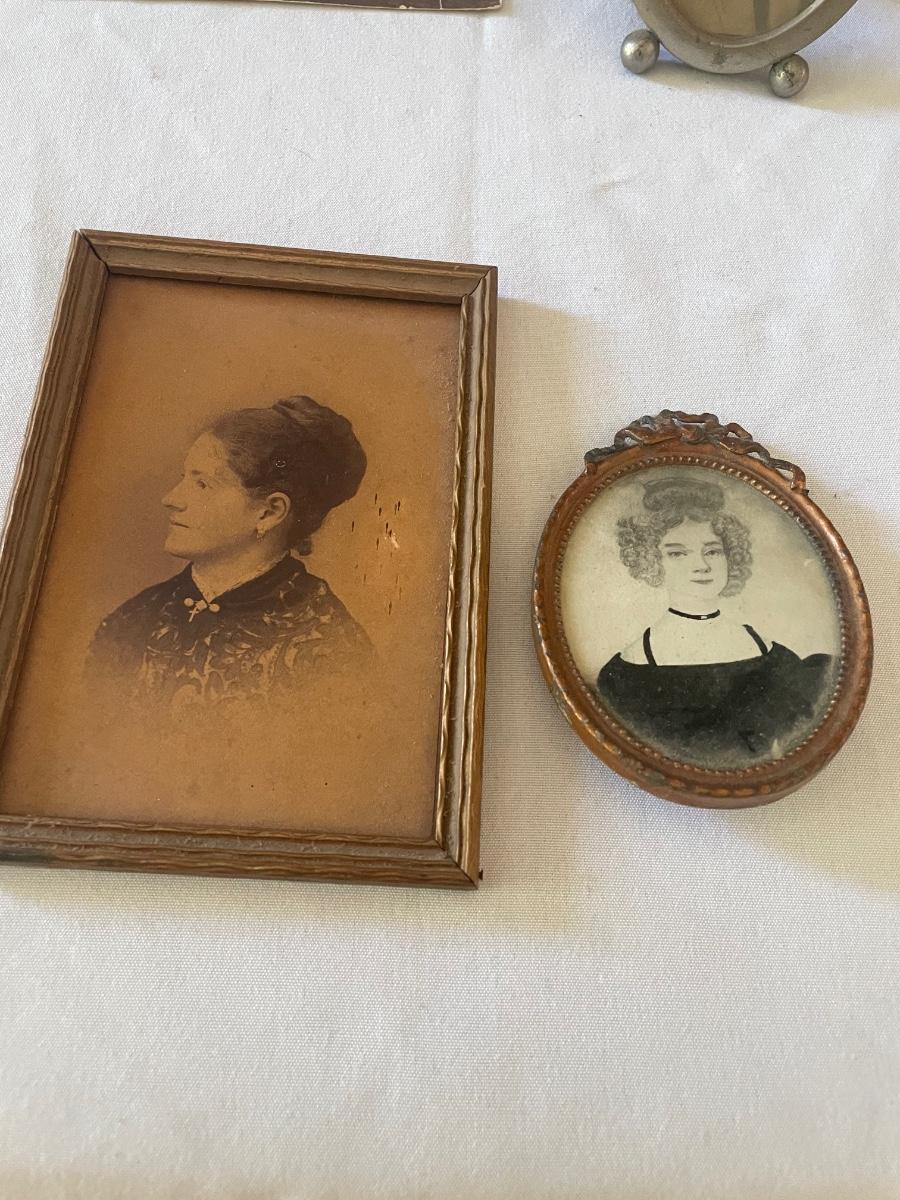 10 vintage photographs, all but the largest one are framed and this photo appears to be the oldest and measures 14.5” x 19” (it does have some water damage and is torn, see images). Metal frames may be silver or pewter but no markings visible.