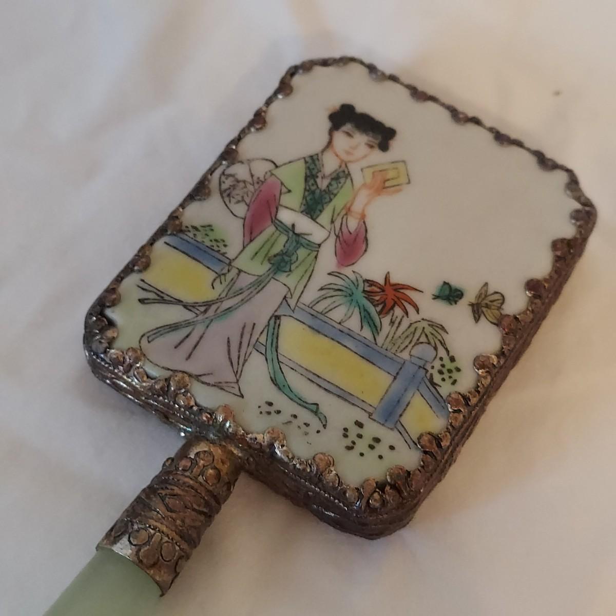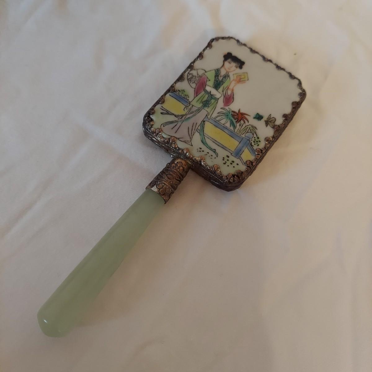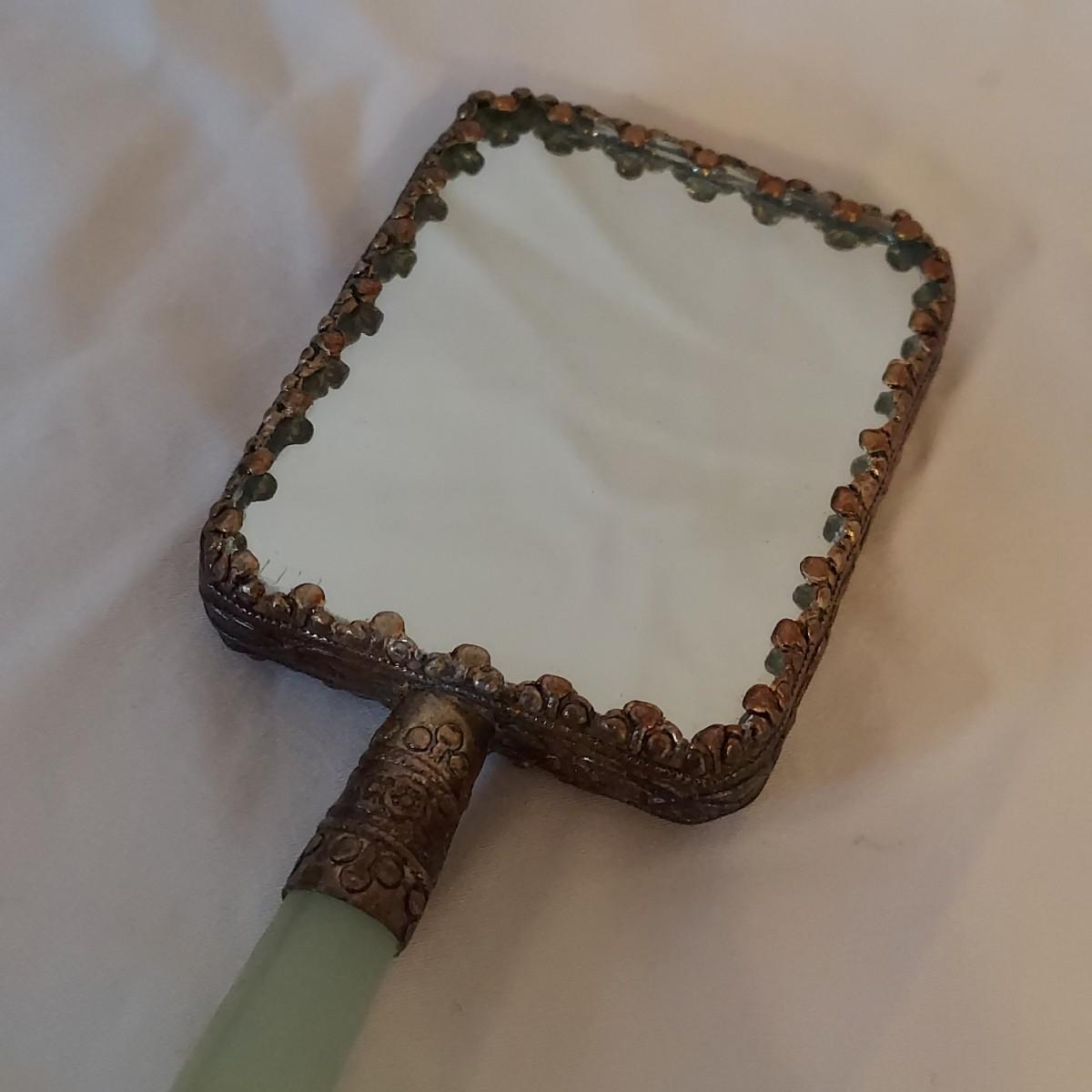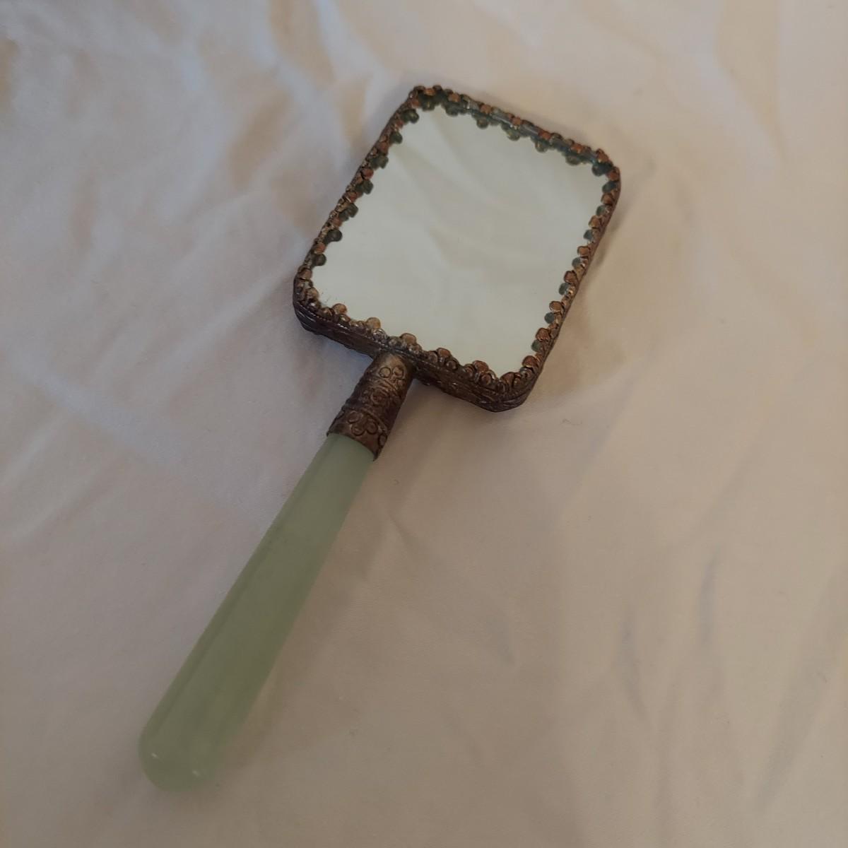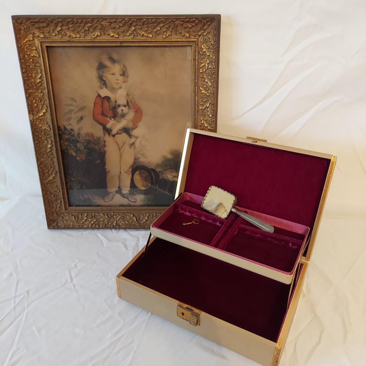 Vintage decor lot including a jewelry box, small handheld mirror and framed art print “Master Simpson” by Arthur Devis. Frame is carved wood and measures 13” x 15"H. Mirror is approximately 2” x 5"H. The handle of the mirror appears to be jade but cannot be verified. The lock on the jewelry box doesn't work well but the key is included. Please see photos for details. Shipping available