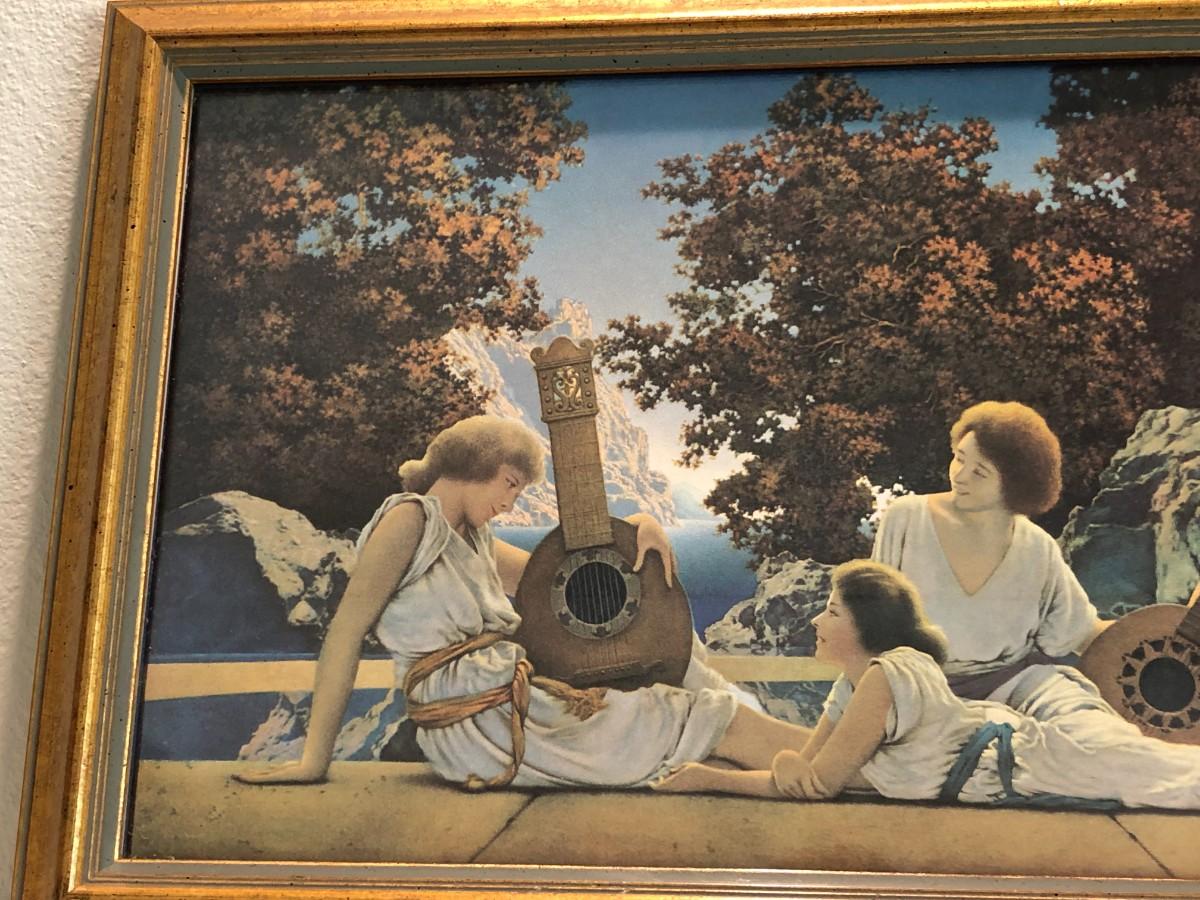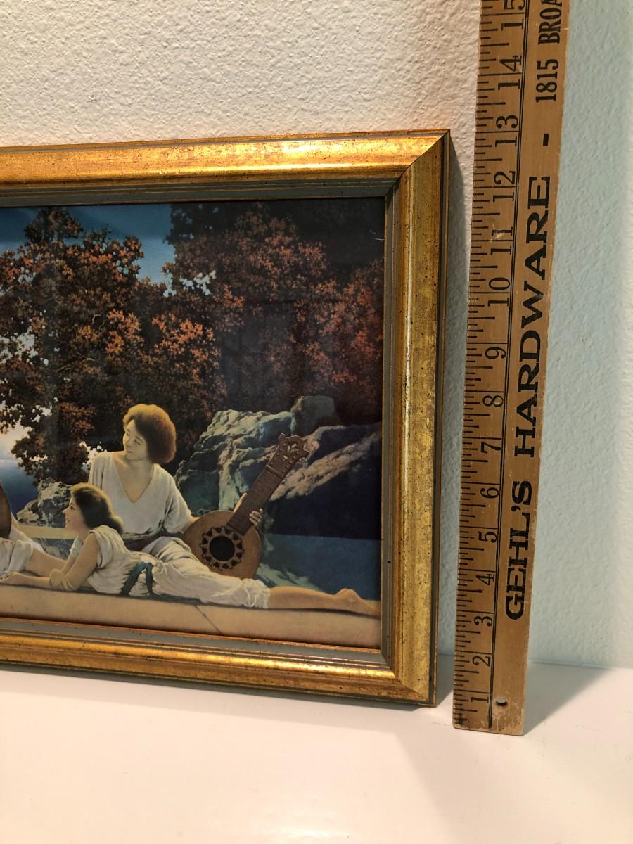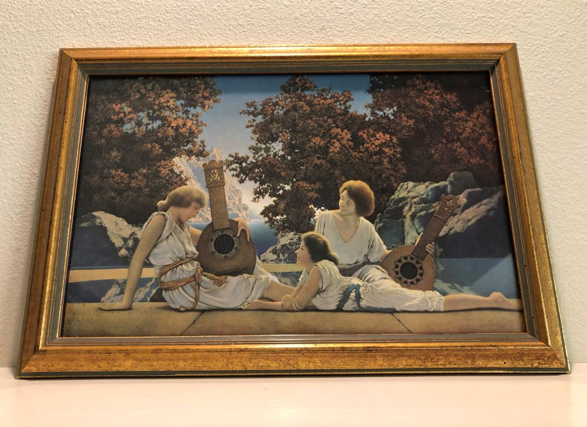 Beautiful Vintage Framed Print of the Lute Players by Maxfield Parrish circa 1922. Lovely vintage gold frame. In very good condition.