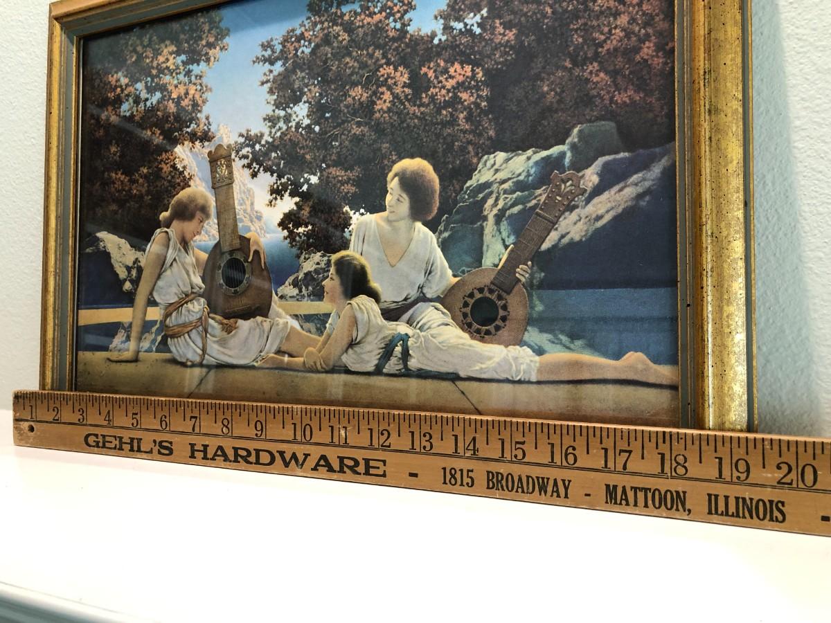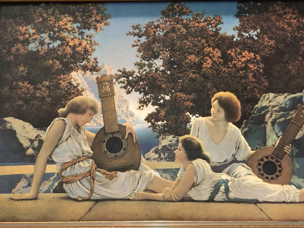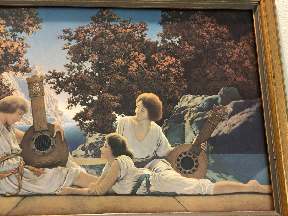 Beautiful Vintage Framed Print of the Lute Players by Maxfield Parrish circa 1922. Lovely vintage gold frame. In very good condition.