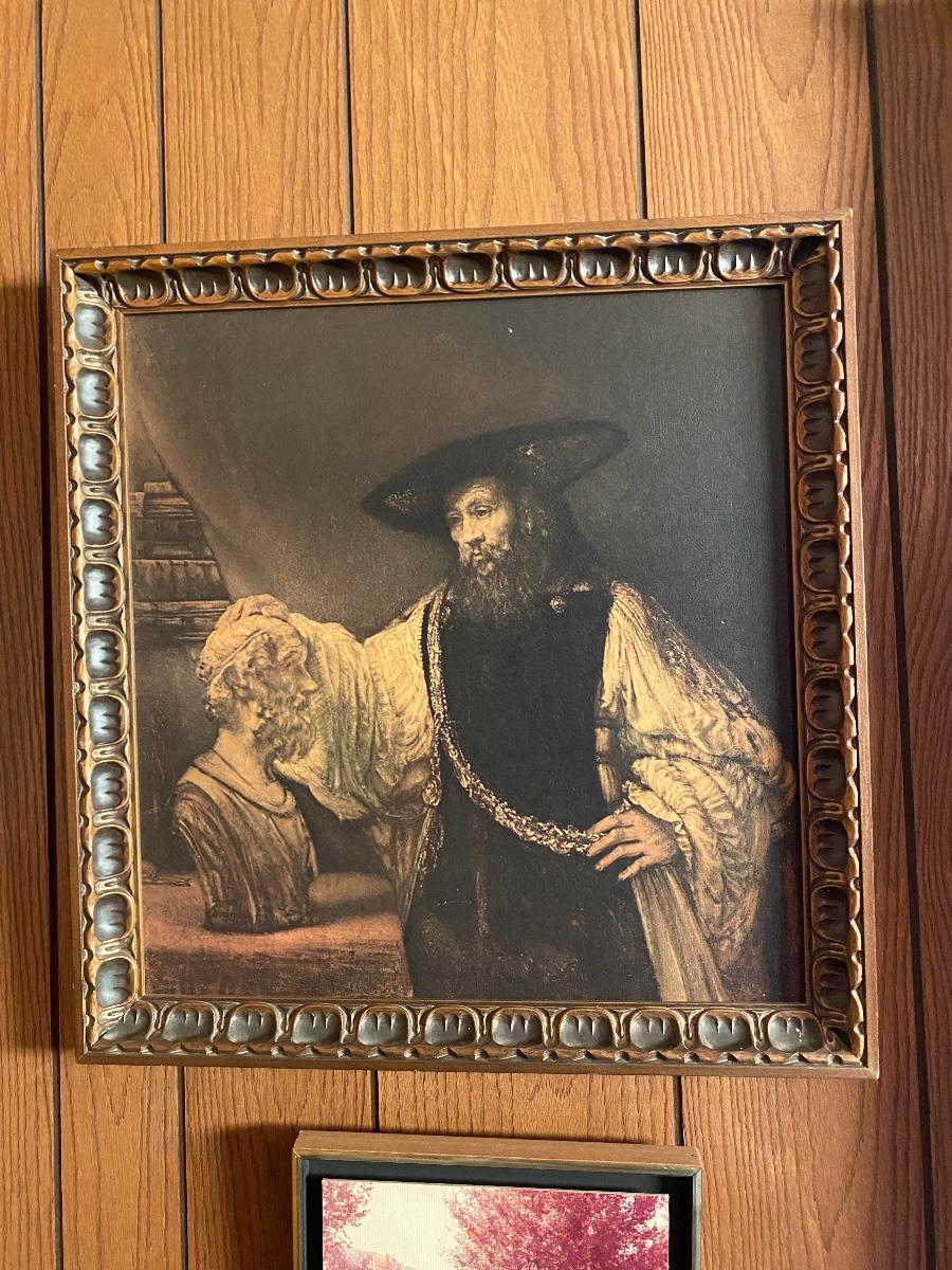 Vintage Framed Rembrandt Print Aristotle Contemplating Bust of Homer. Nicely framed. About 22.5" square. Looks like it has faded a little from years on the wall.