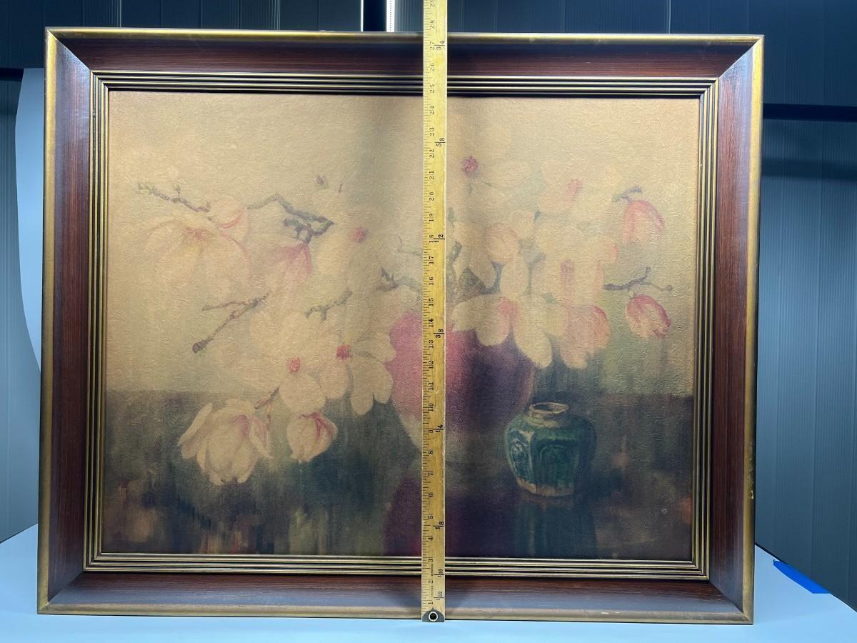 Vintage Framed Reproduction Artwork of Magnolias in Bloom by E. Ottema, there is some vintage wear to the frame and art work, but there is no significant damage and is in good displayable condition. Check pictures for more details and for sizing.