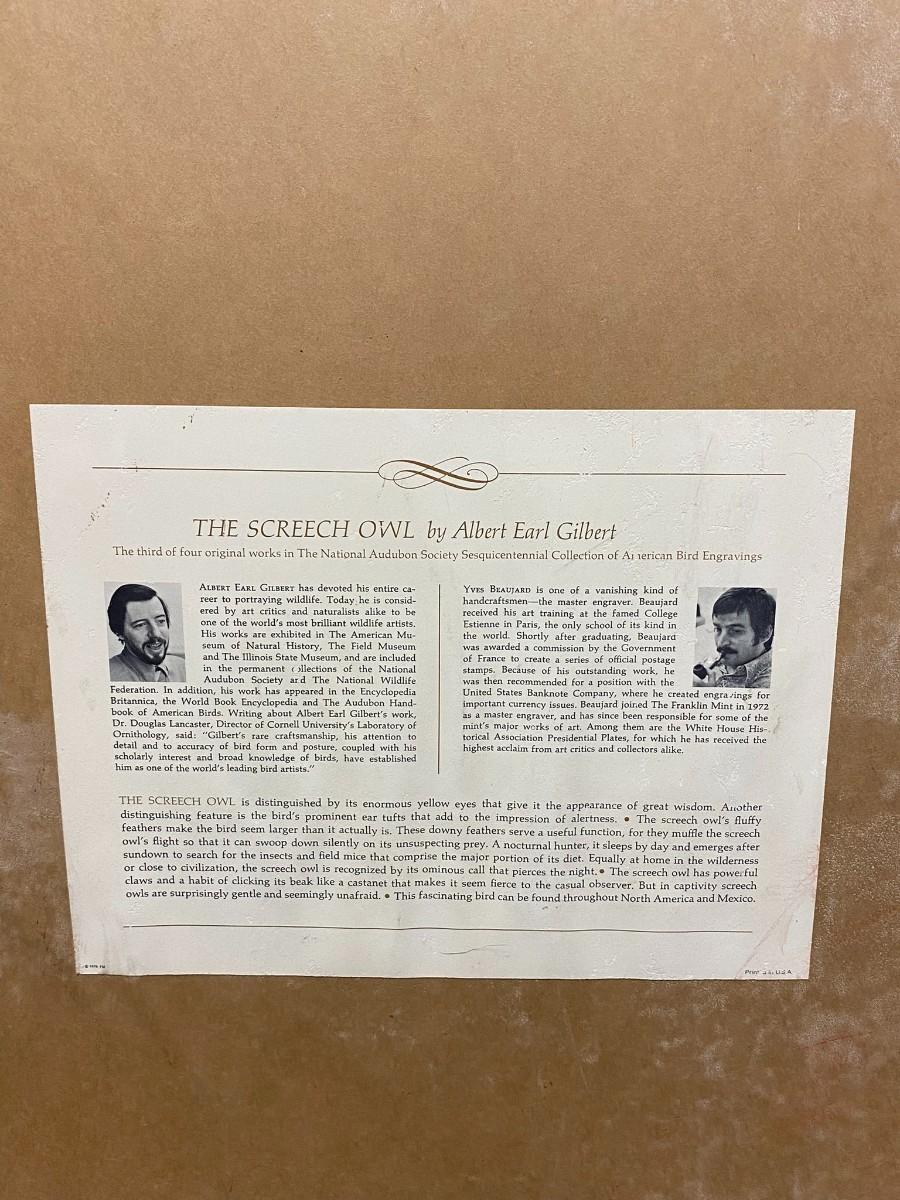 Vintage Framed Screech Owl Audubon Society Engraving Print Albert Earl Gilbert 1976 Signed