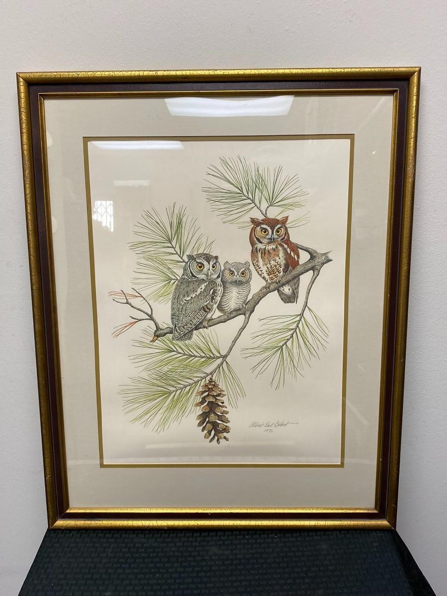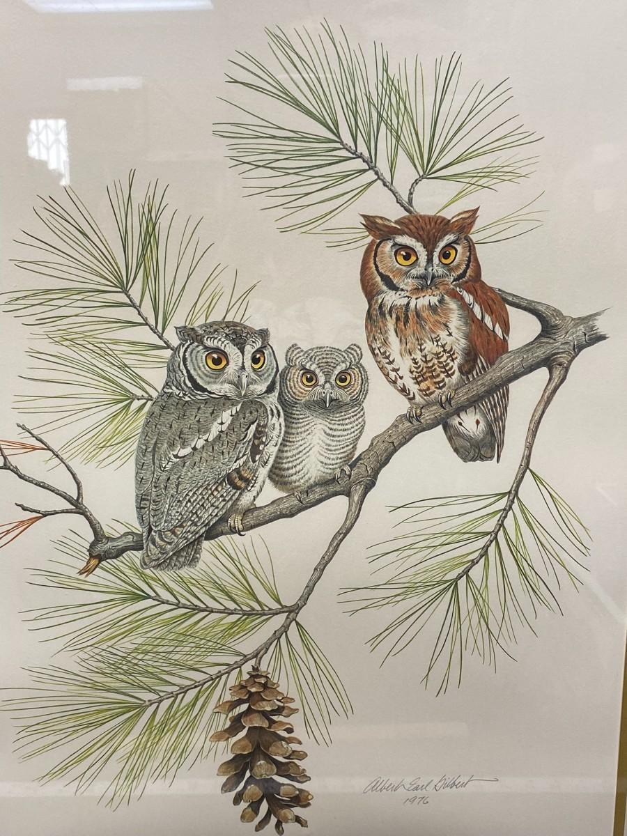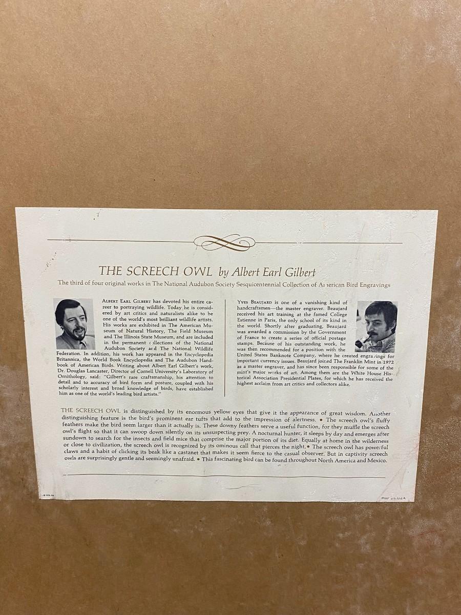 The Screech Owl engraving print by Albert Earl Gilbert for the Audubon Society 1976. Pencil signed at the bottom by artist. Small bio on the back. About 25"x31" size.