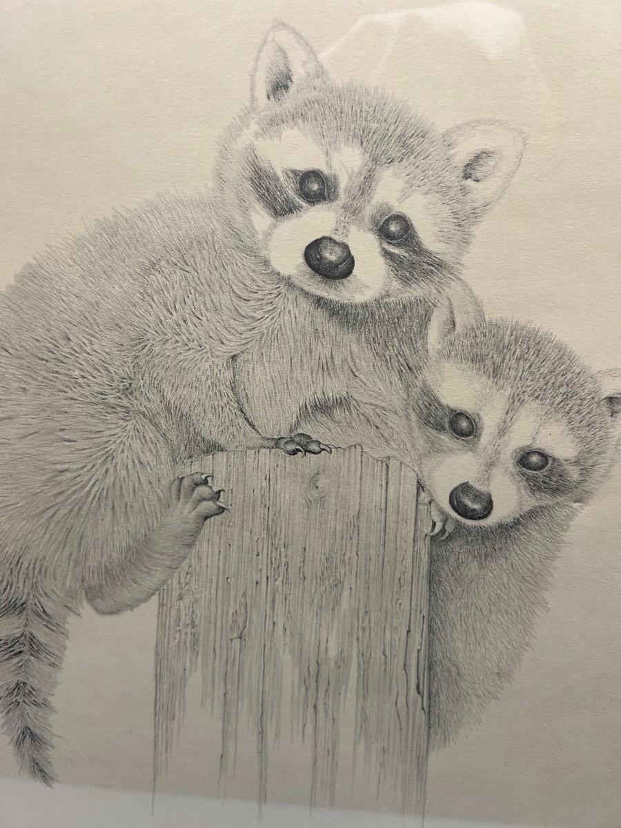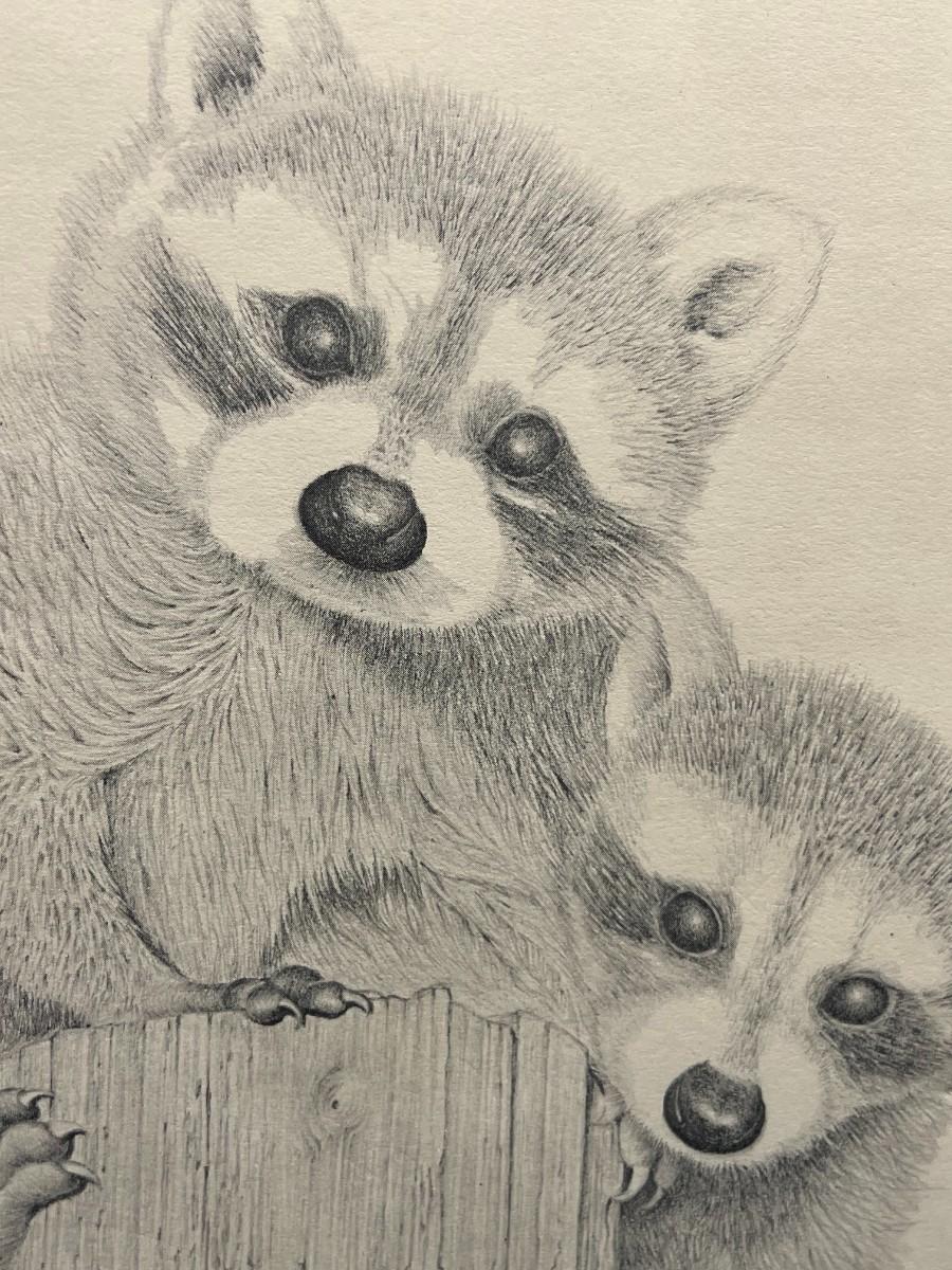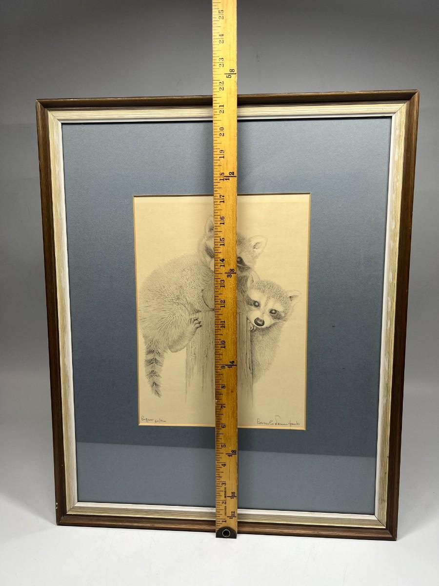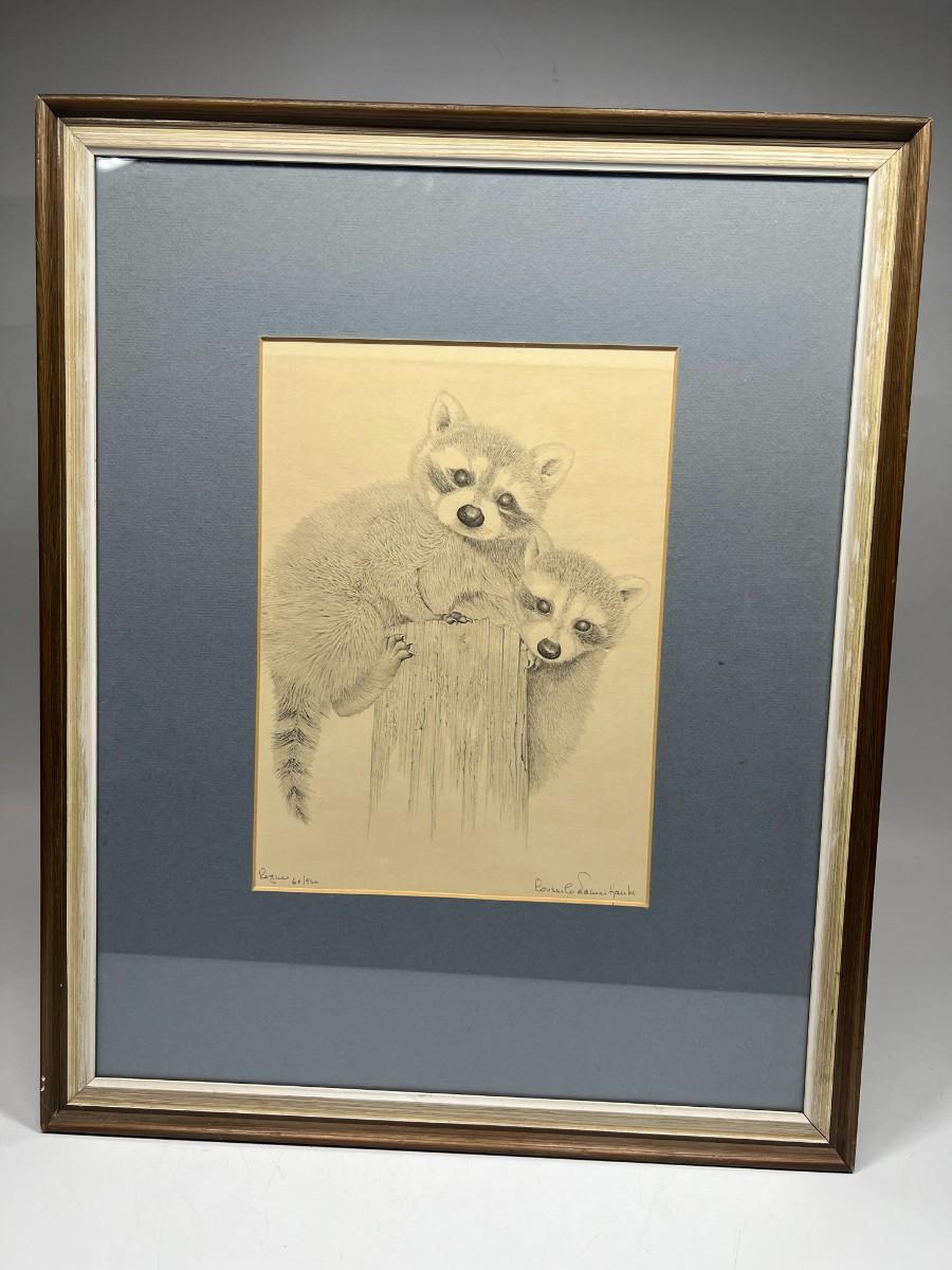 Vintage Framed Signed & Numbered Sketch of Baby Racoons
