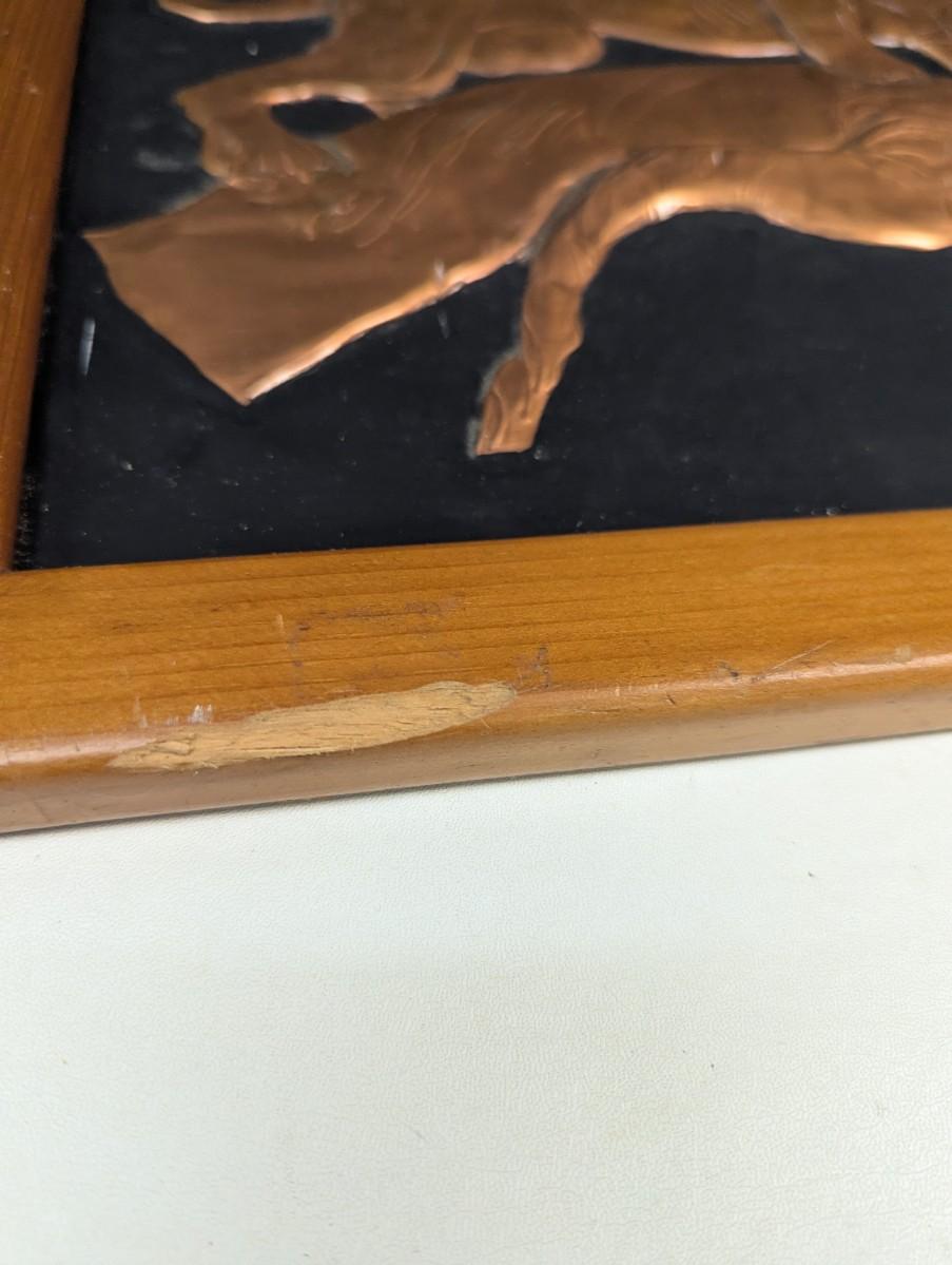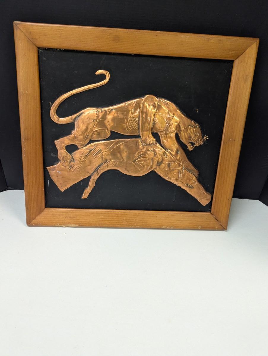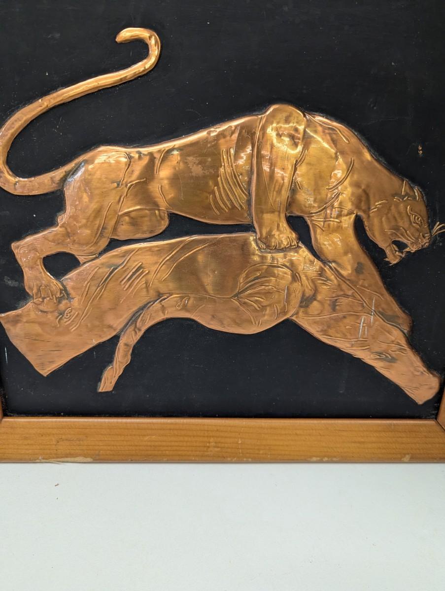 Vintage Framed Stamped Copper Paintings Panther Jaguar