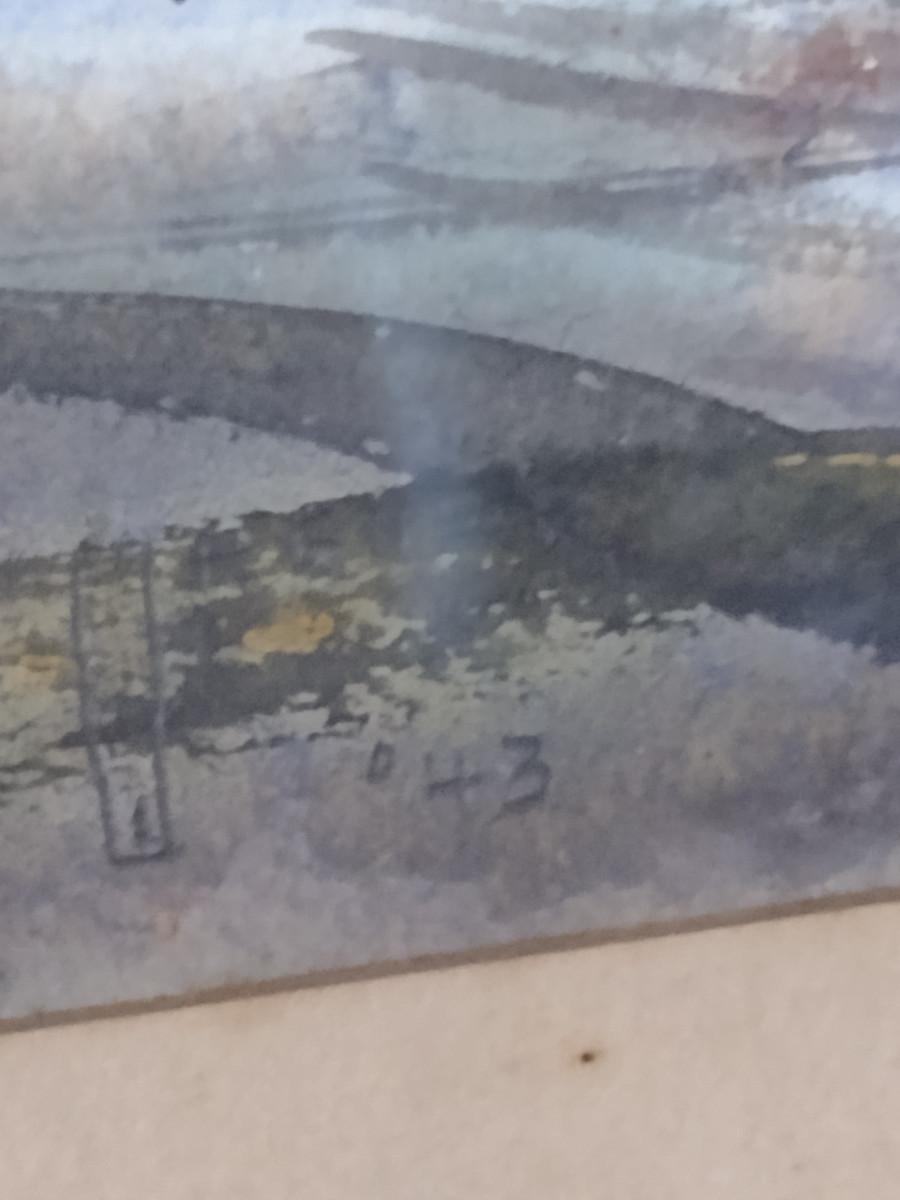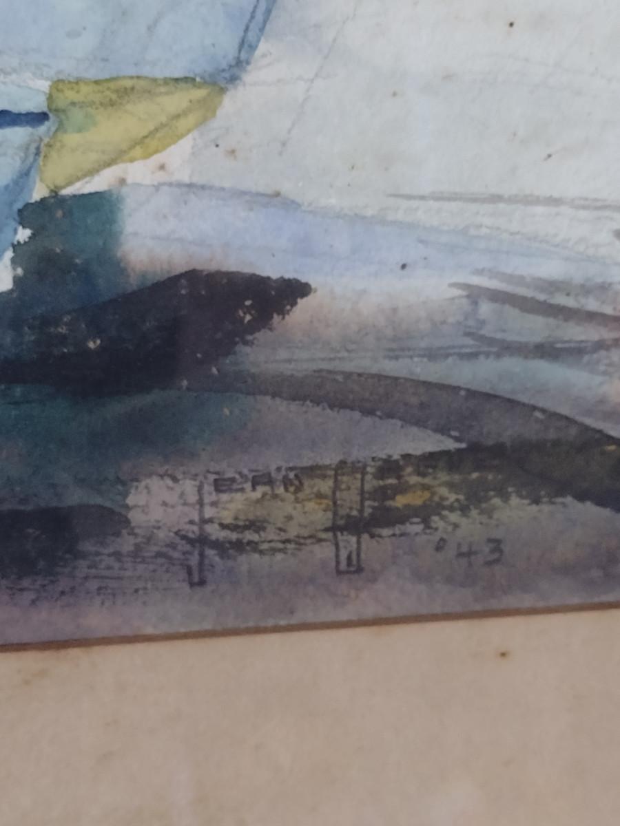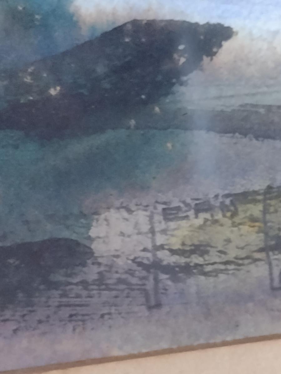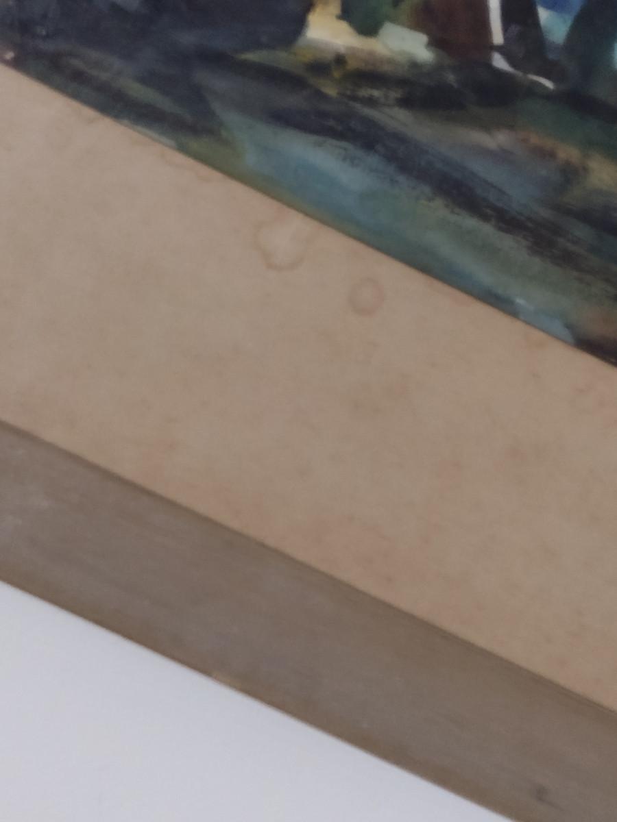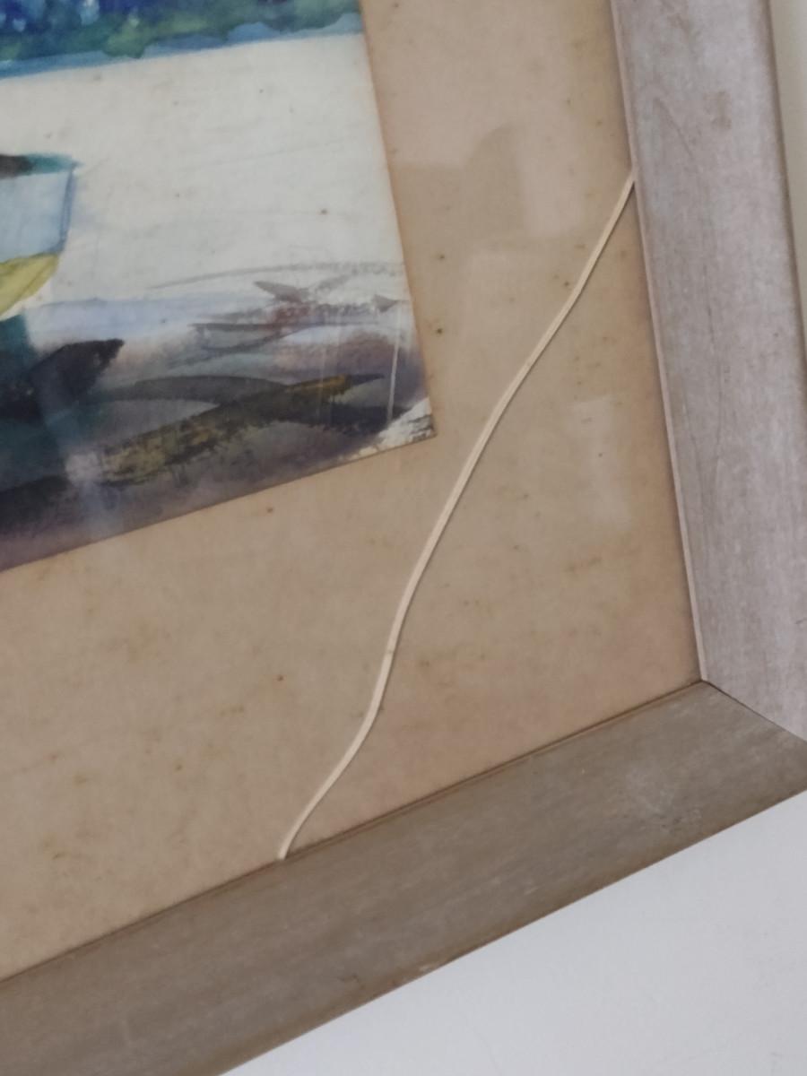 Vintage Framed Waterfront Design Art- Signed by Artist- Approx 24 1/4" x 32". Glass has broken corner.